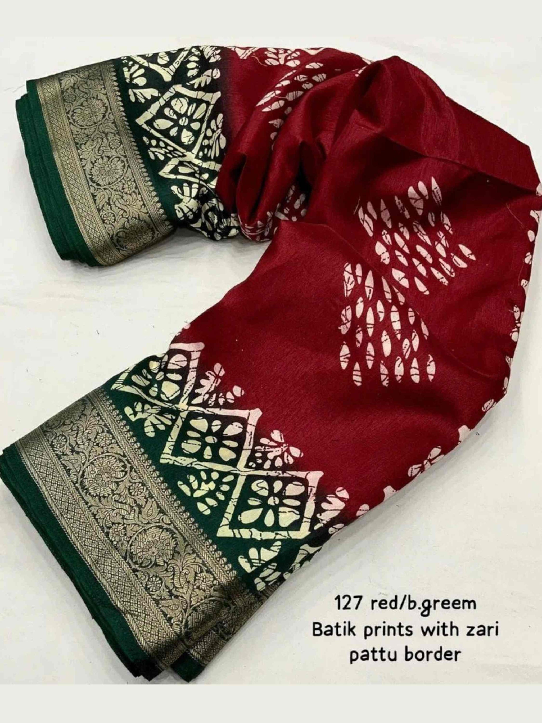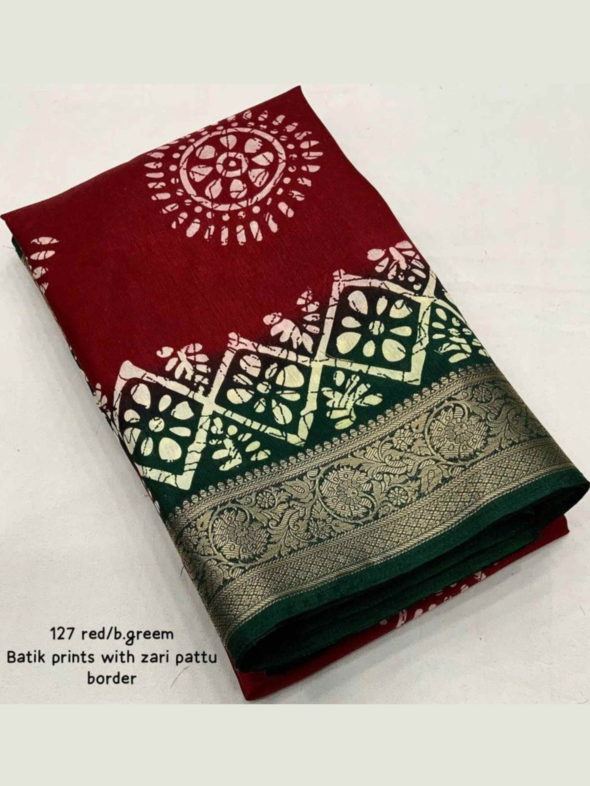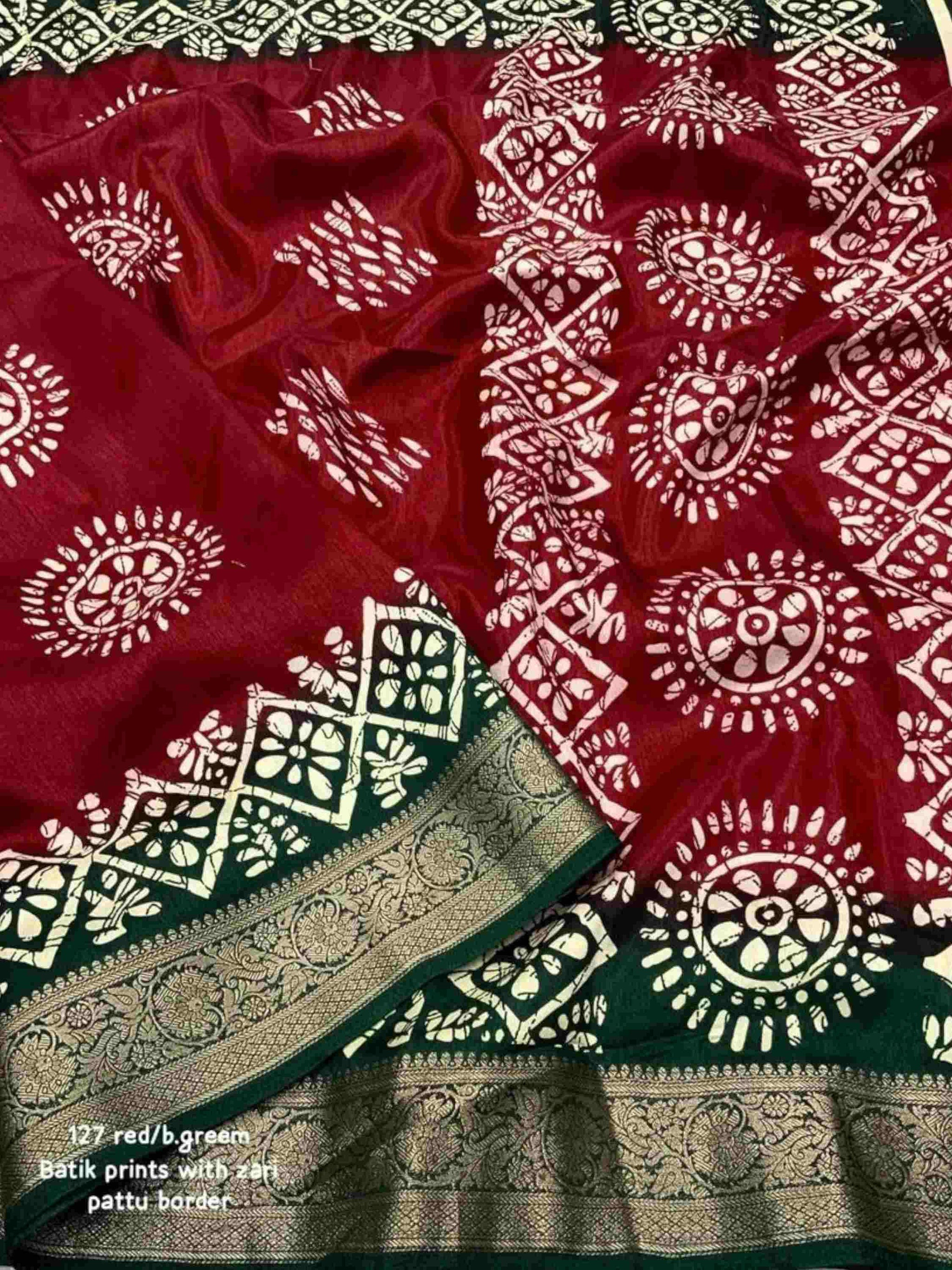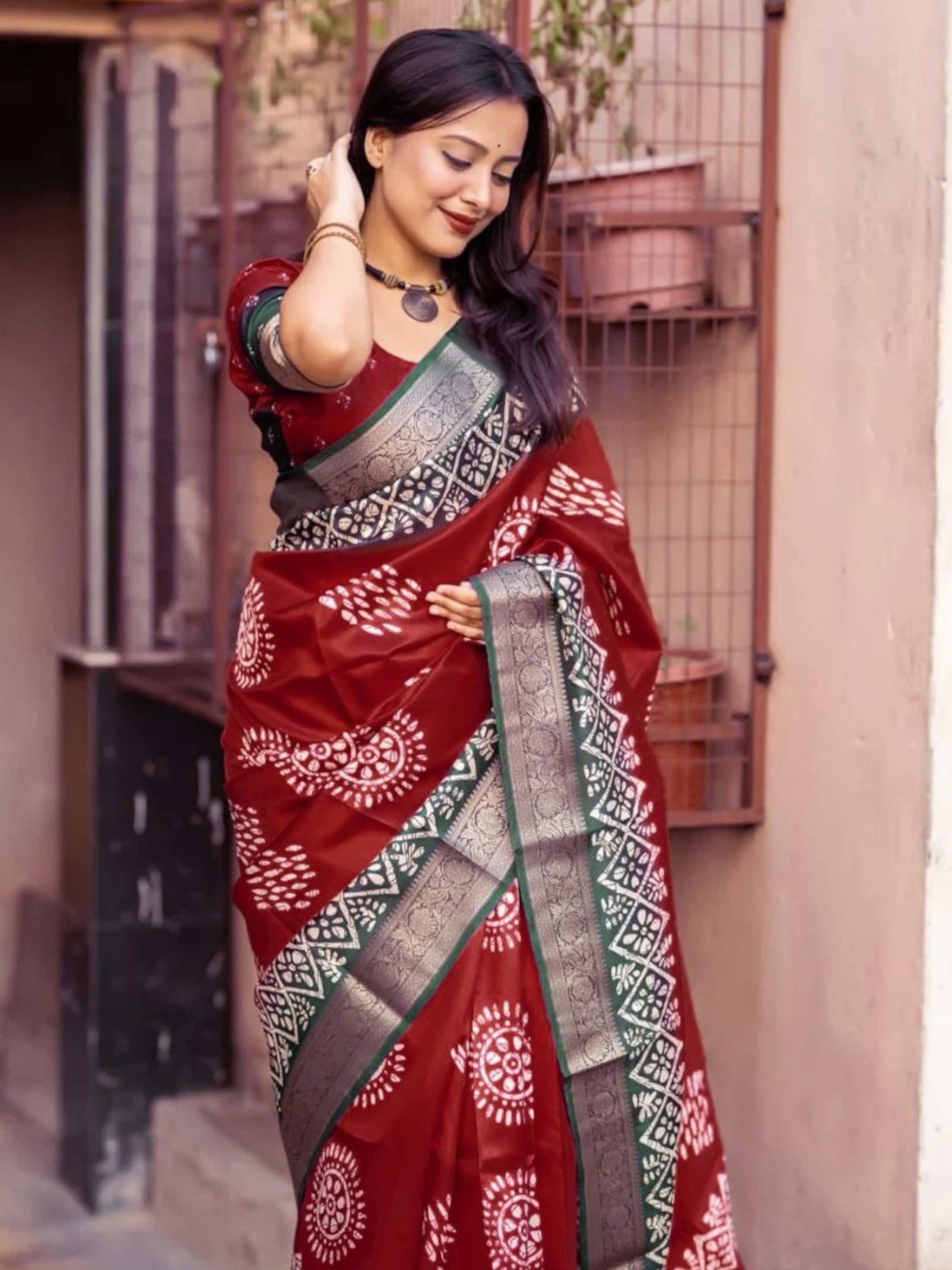 Elegant Maroon Dola Silk Cotton Saree featuring all-over Batik print and shimmering zari border. Soft, breathable - Ideal for festivals, summer, or daily wear