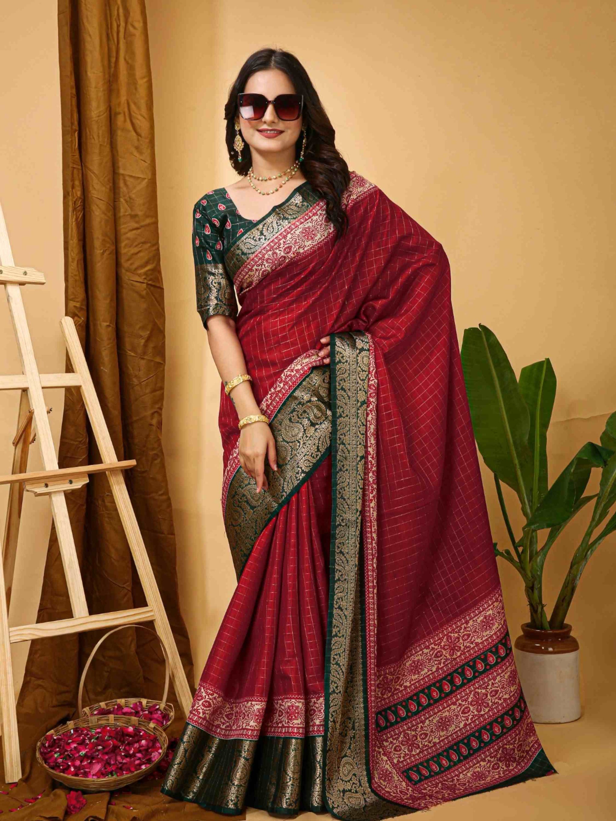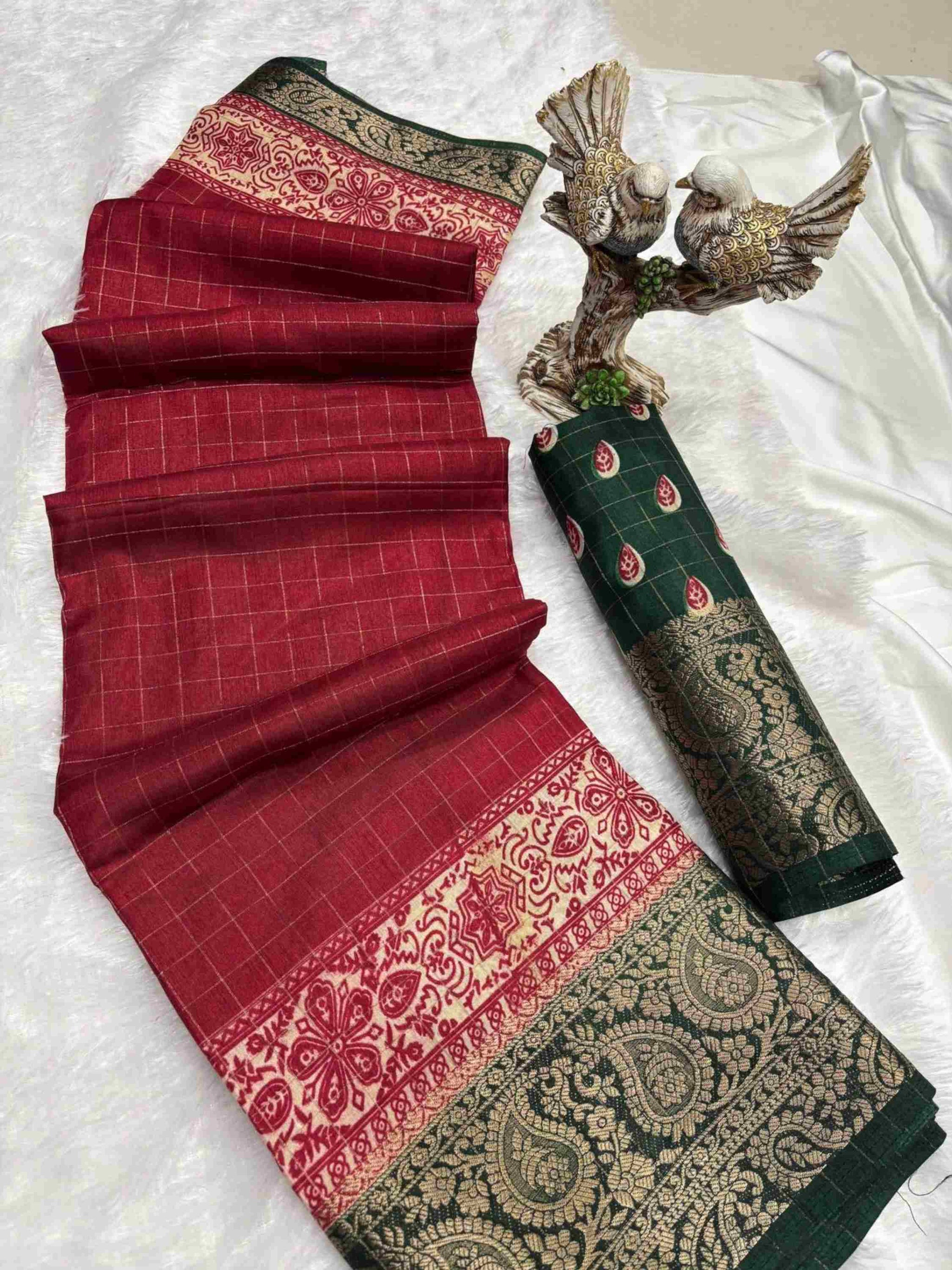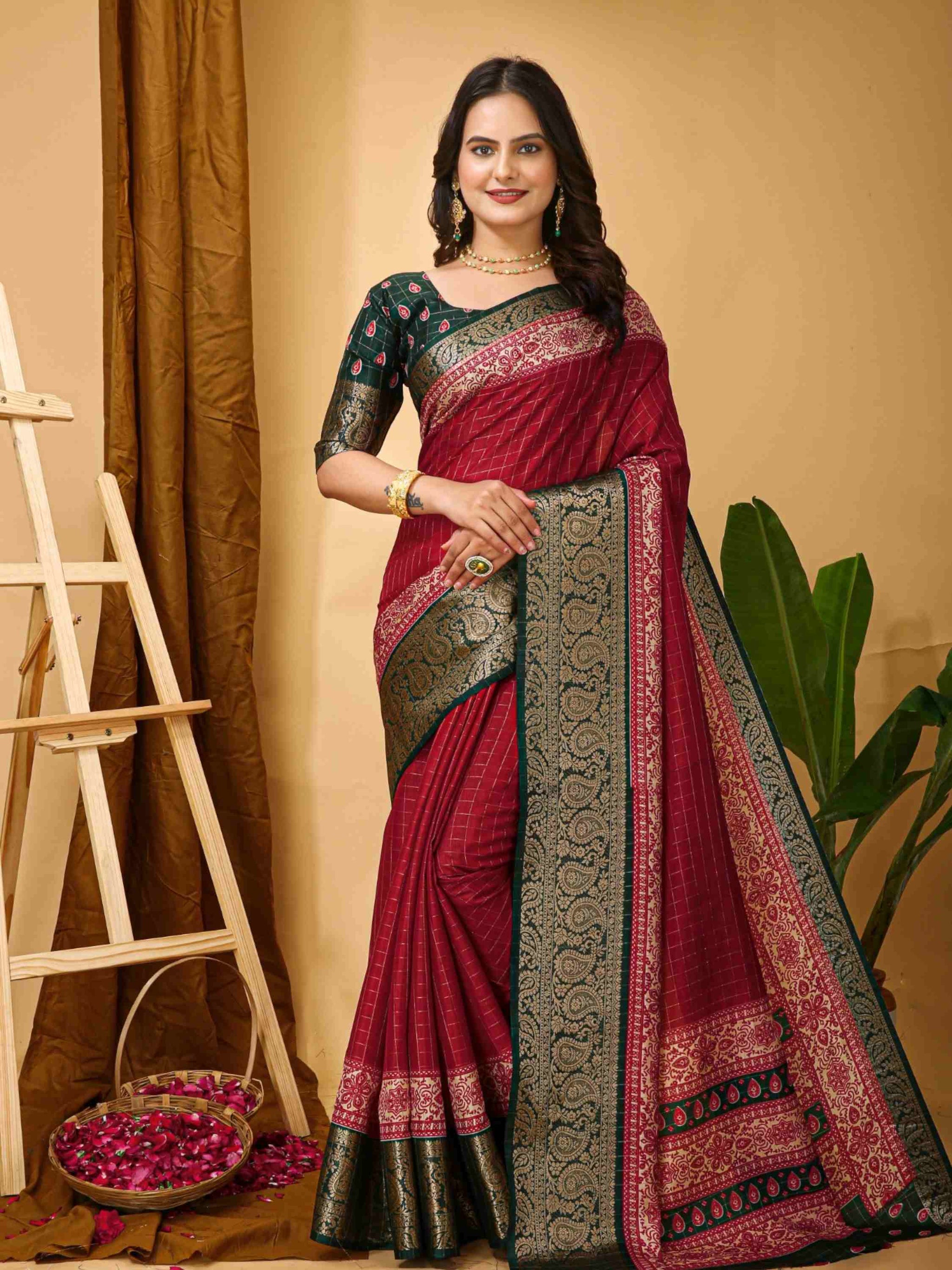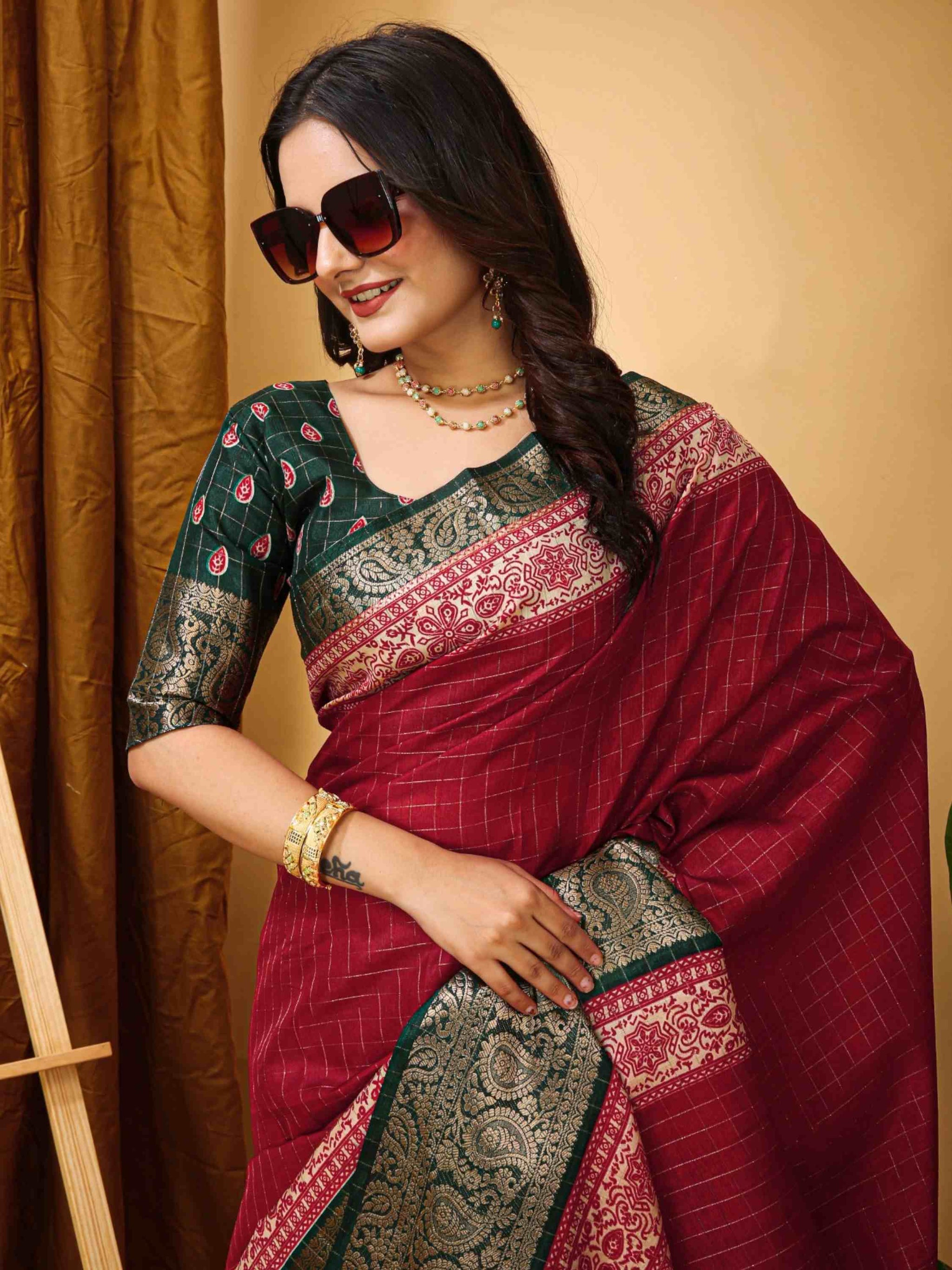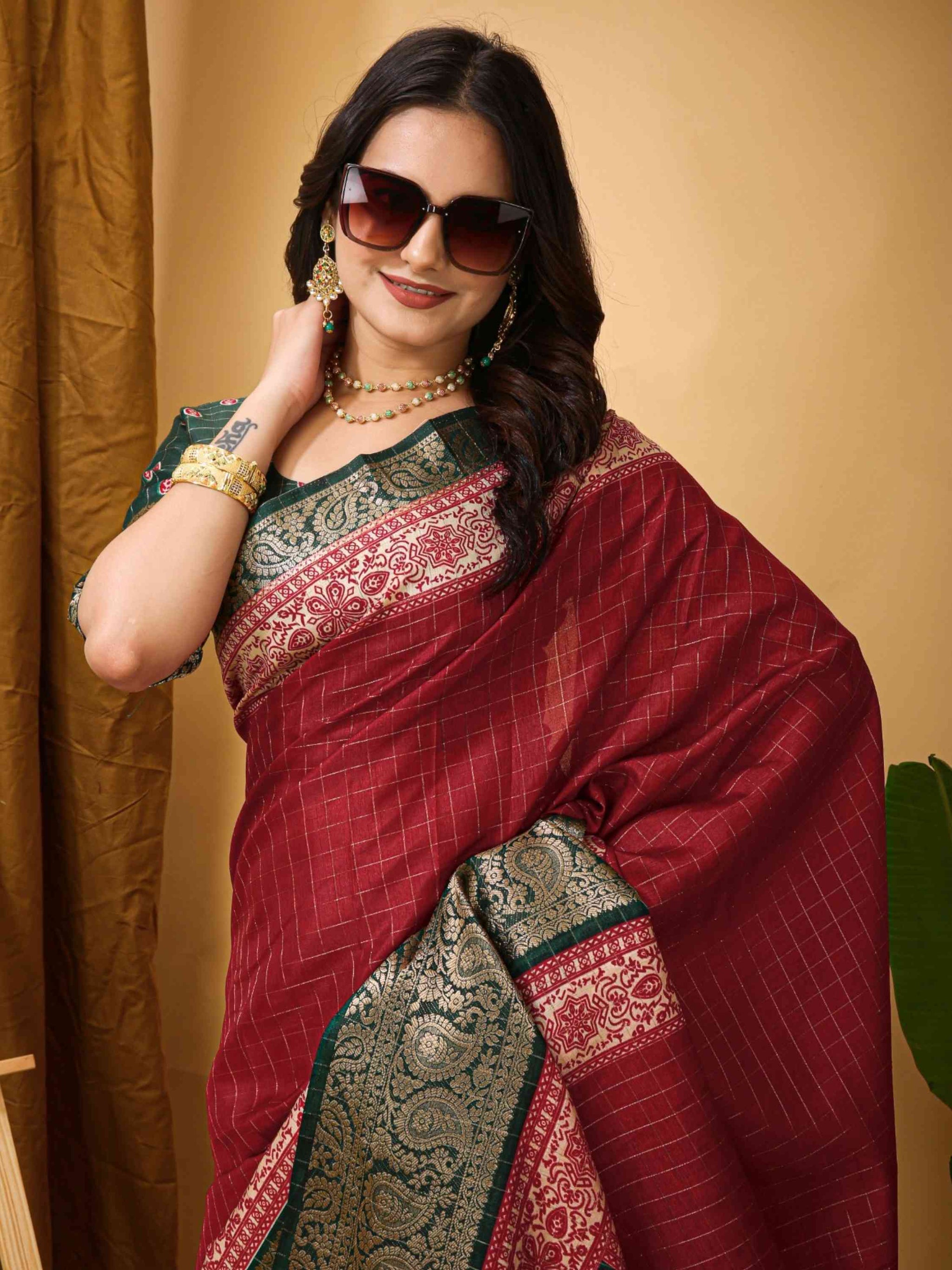 Maroon Dola Silk Cotton Saree with woven zari checks Kalamkari print and zari border. Ideal for festivals, weddings, poojas, office events and family gatherings