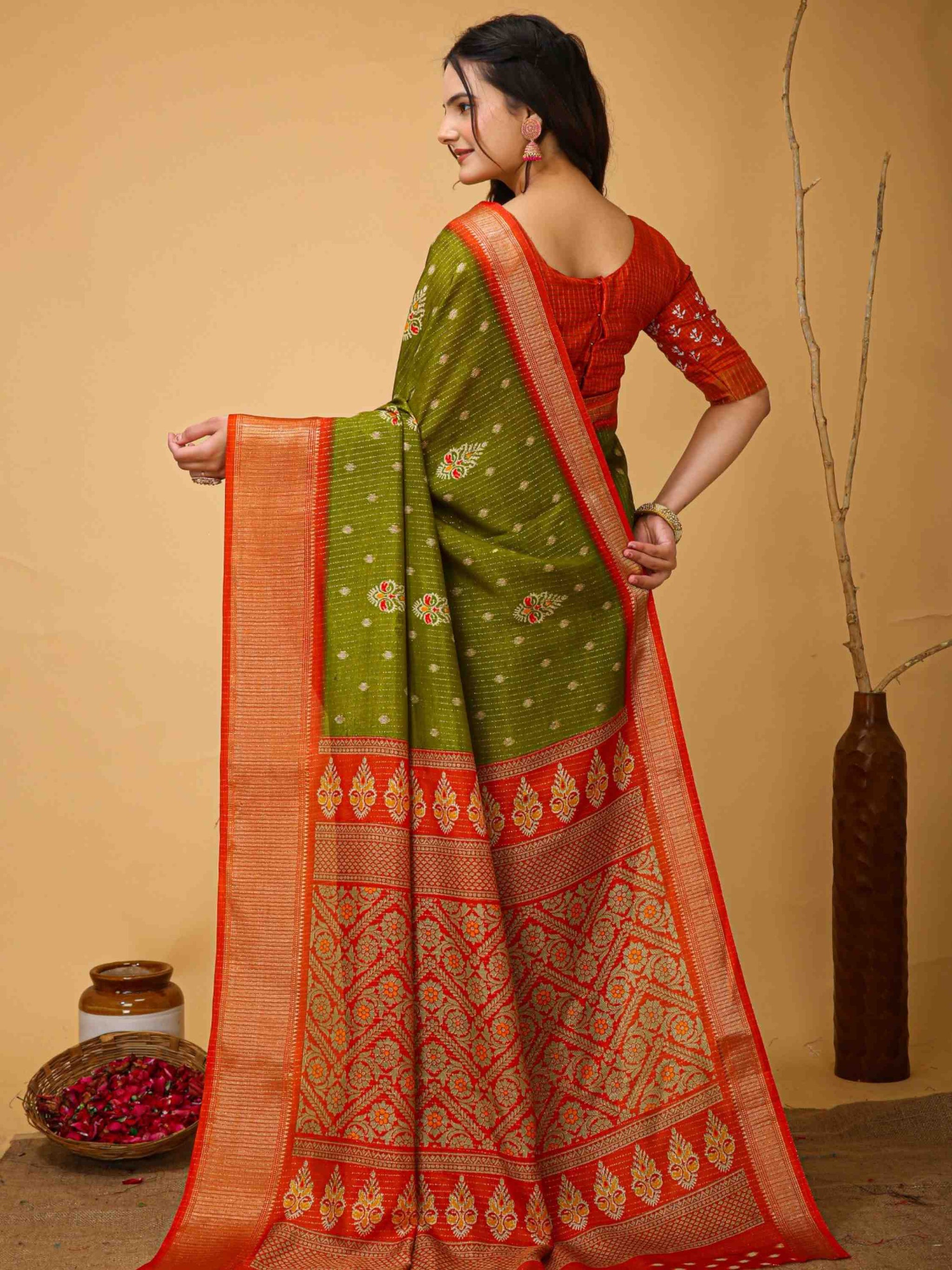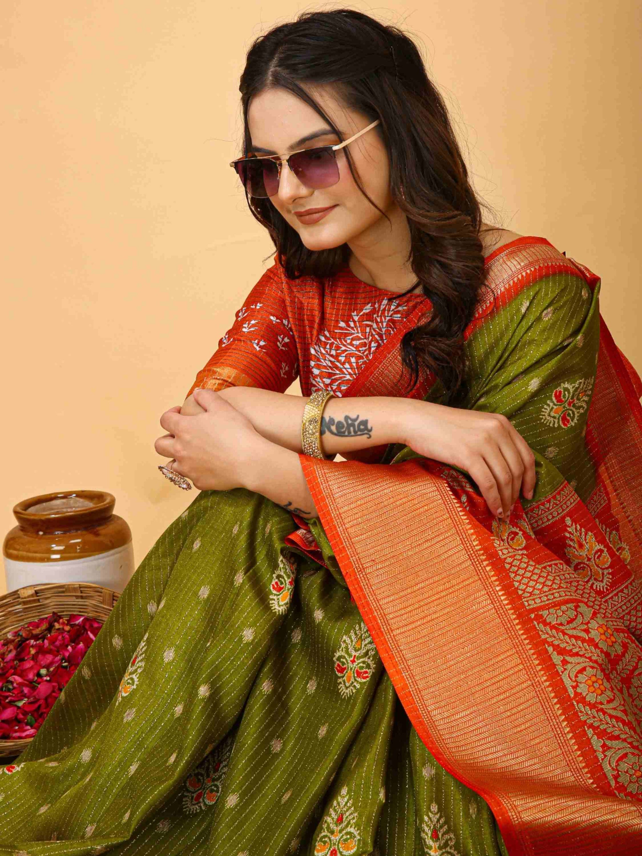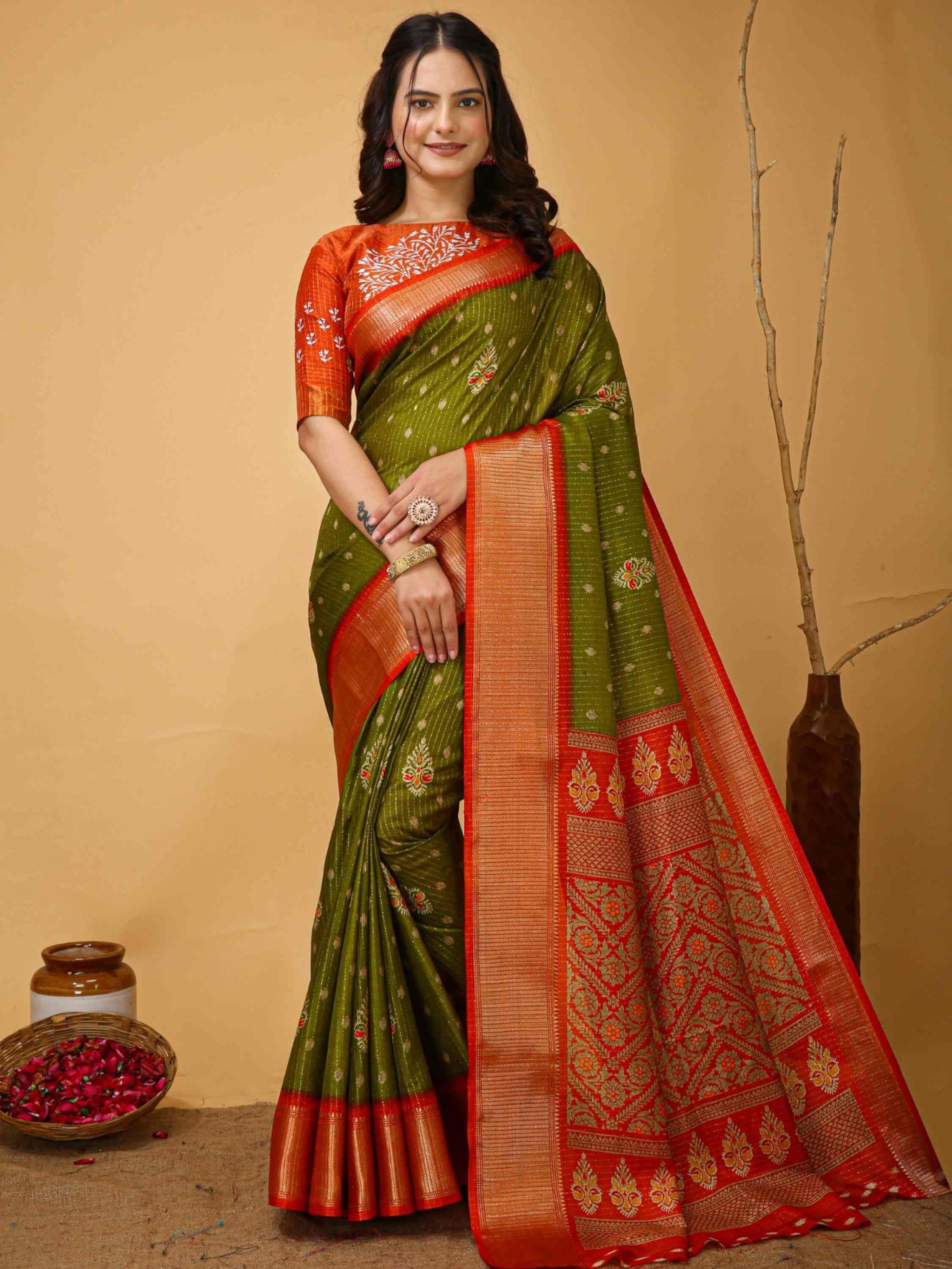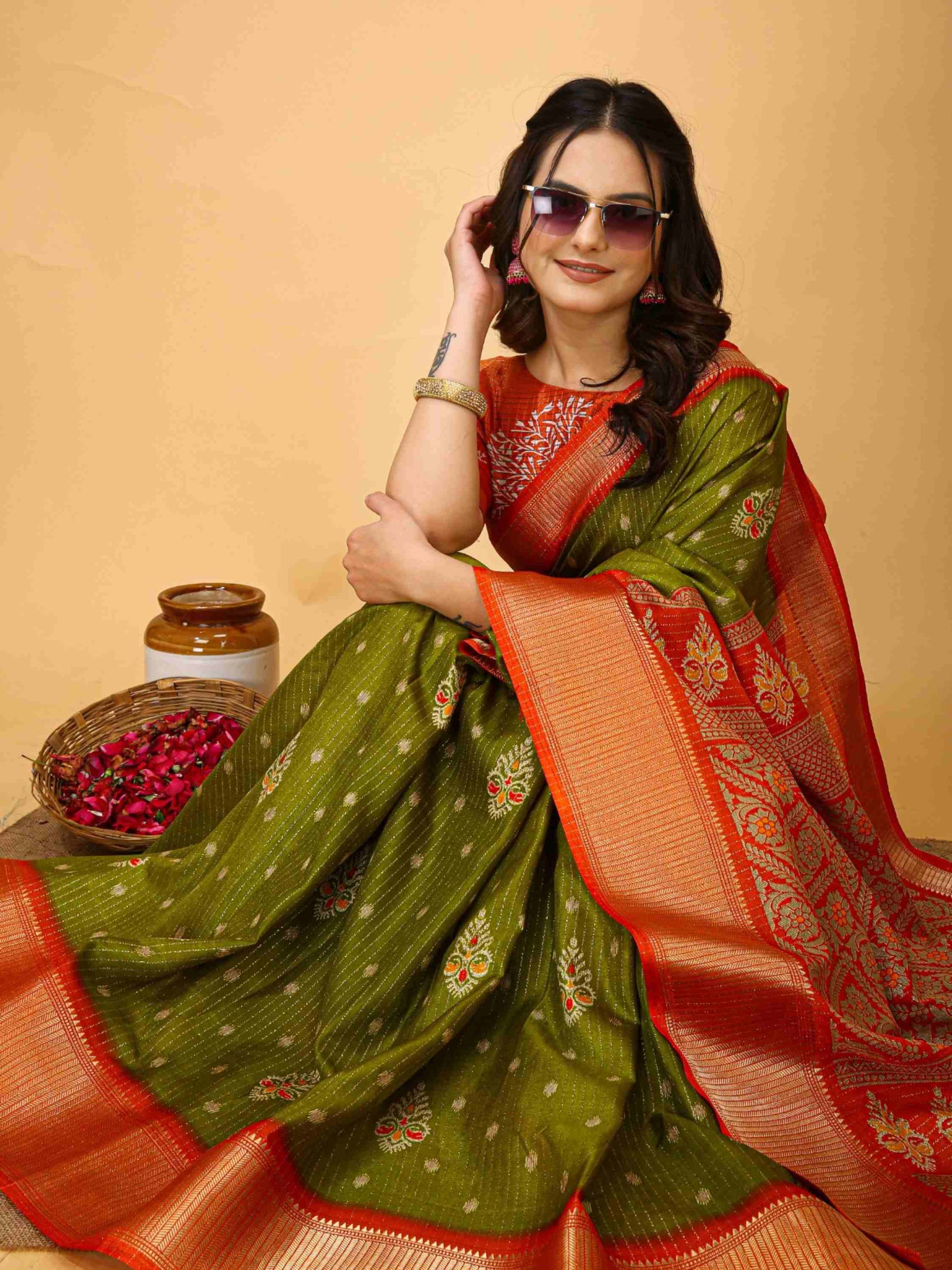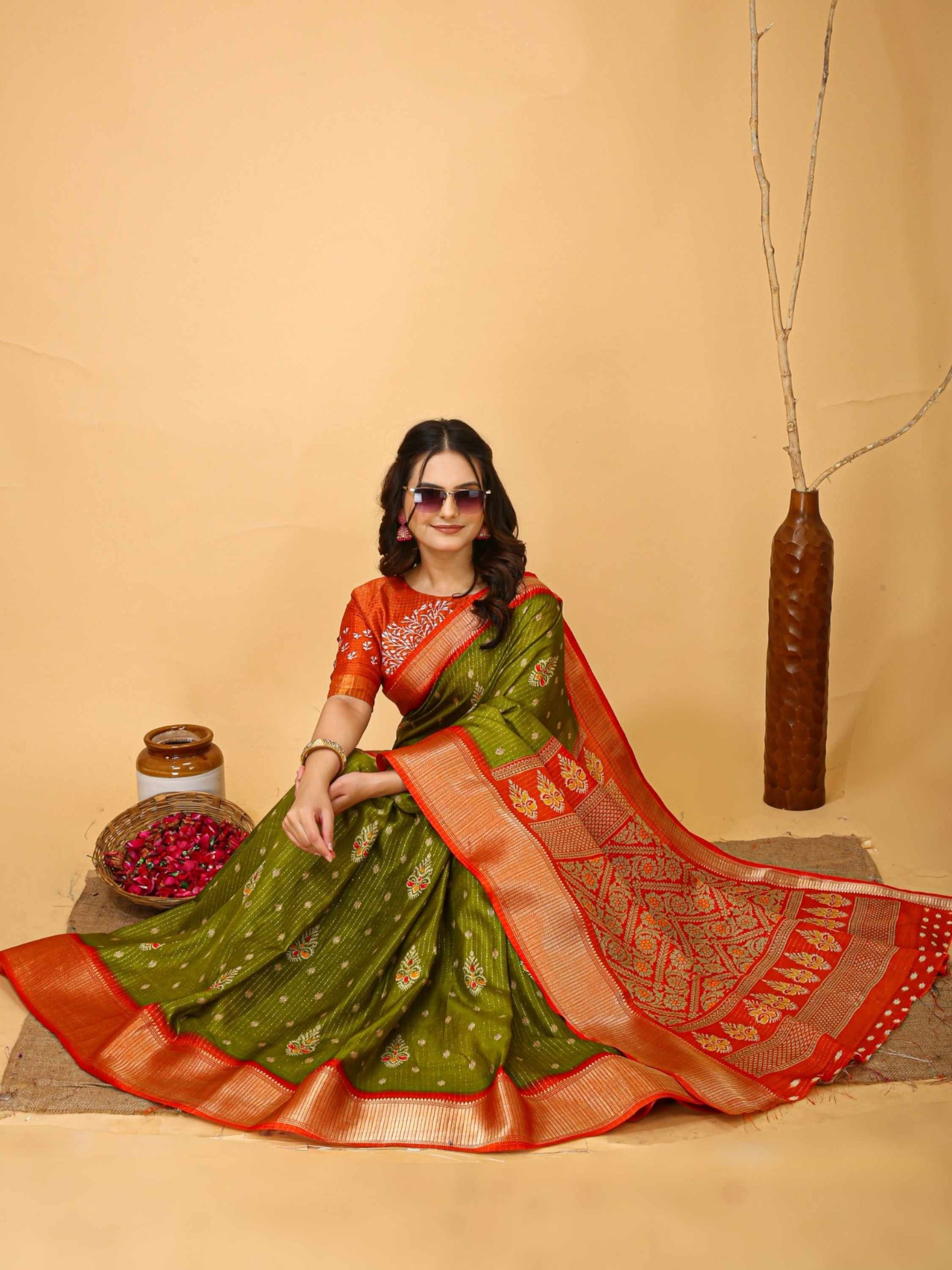 Mehandi Green Dola Silk Saree comes with orange pallu, border and blouse piece. It has ethnic hand kalamkari print with zari border and all-over zari stripes.