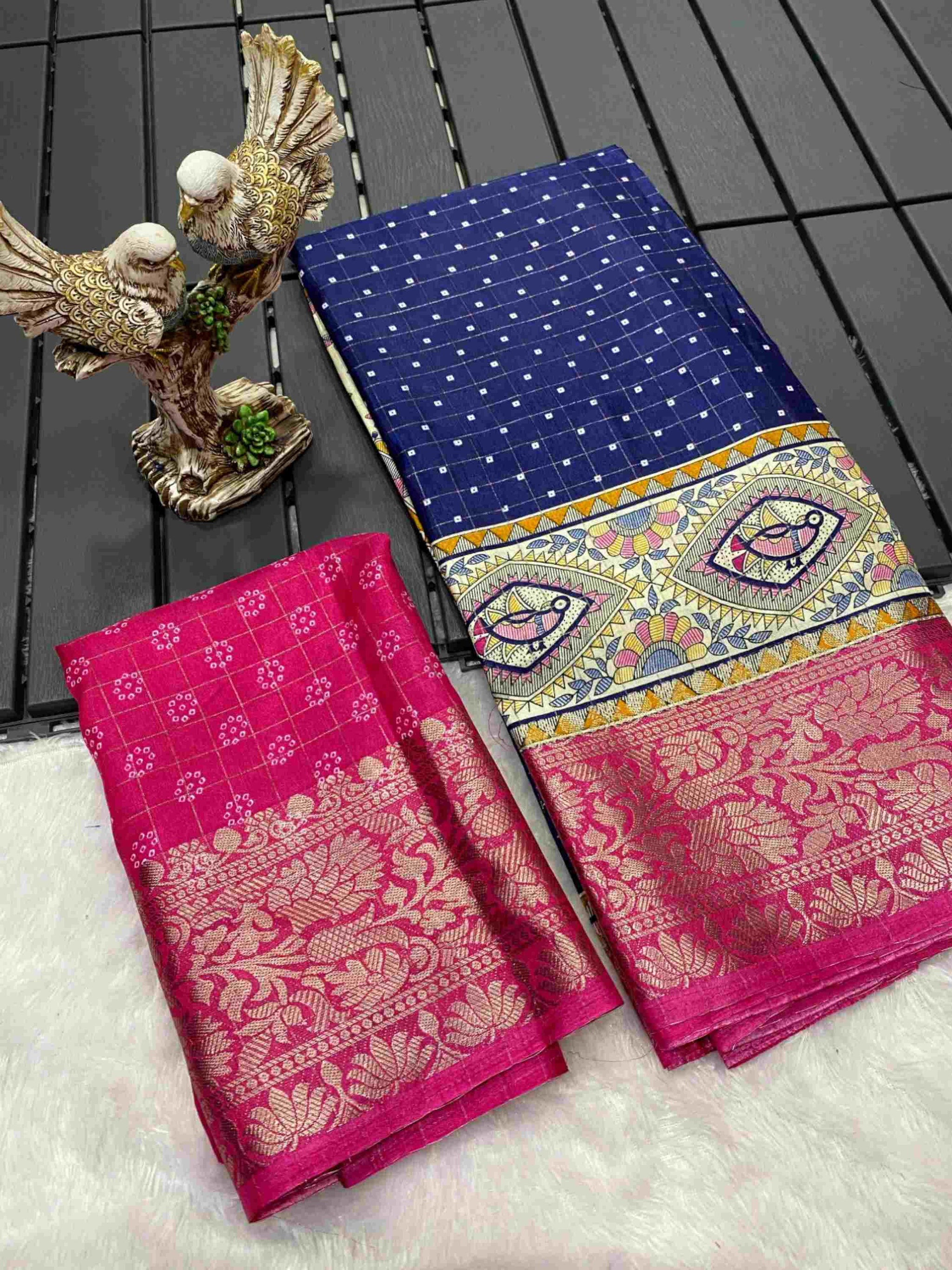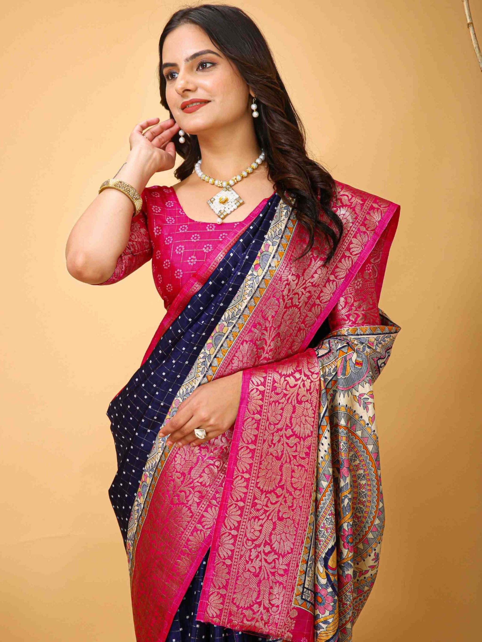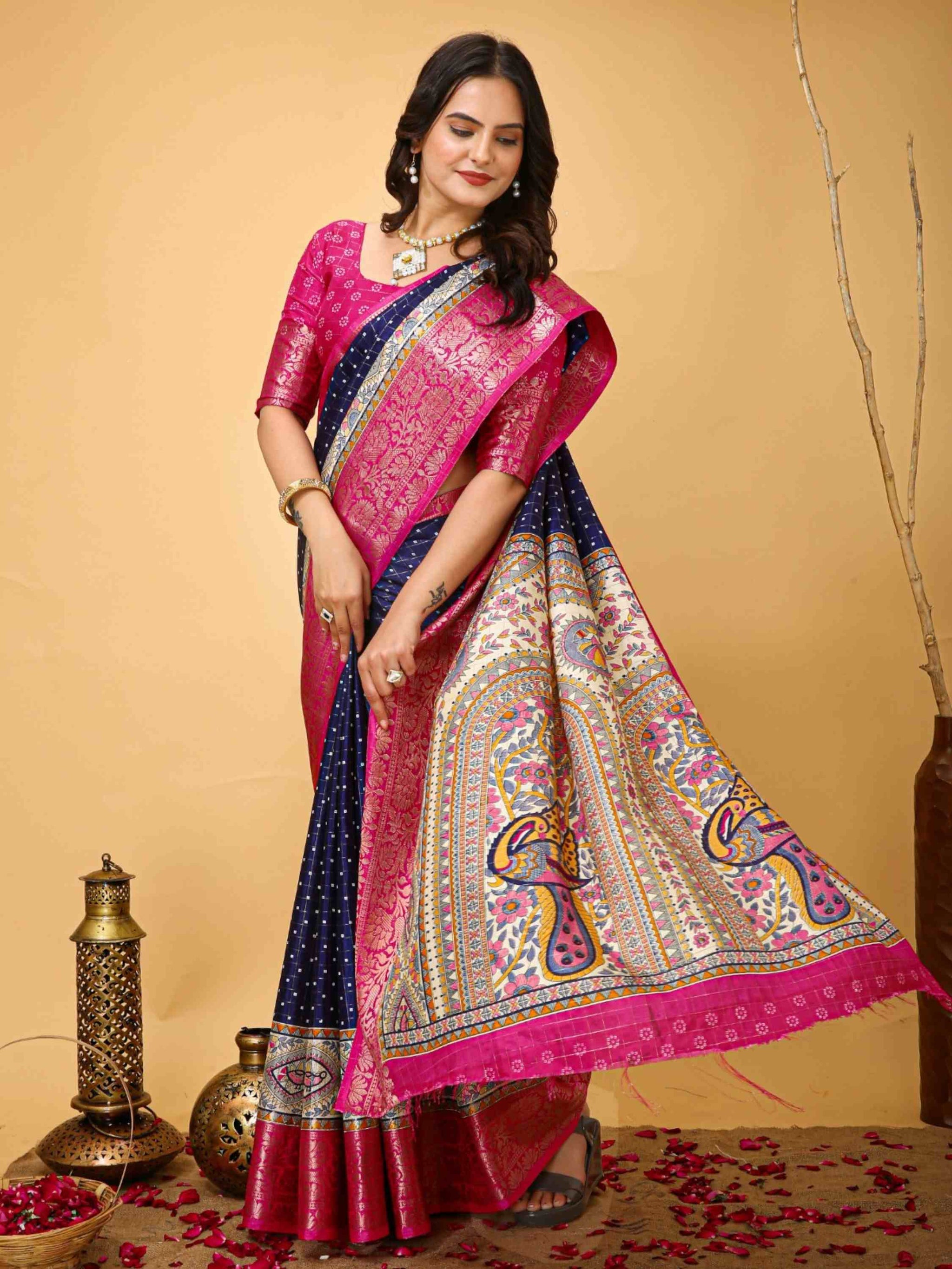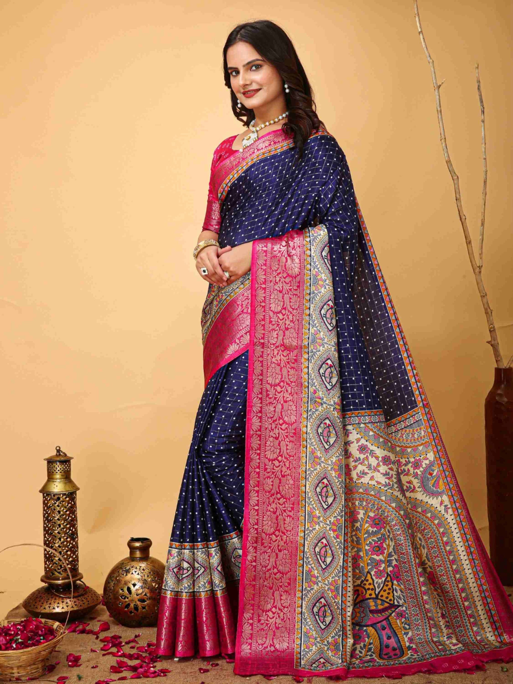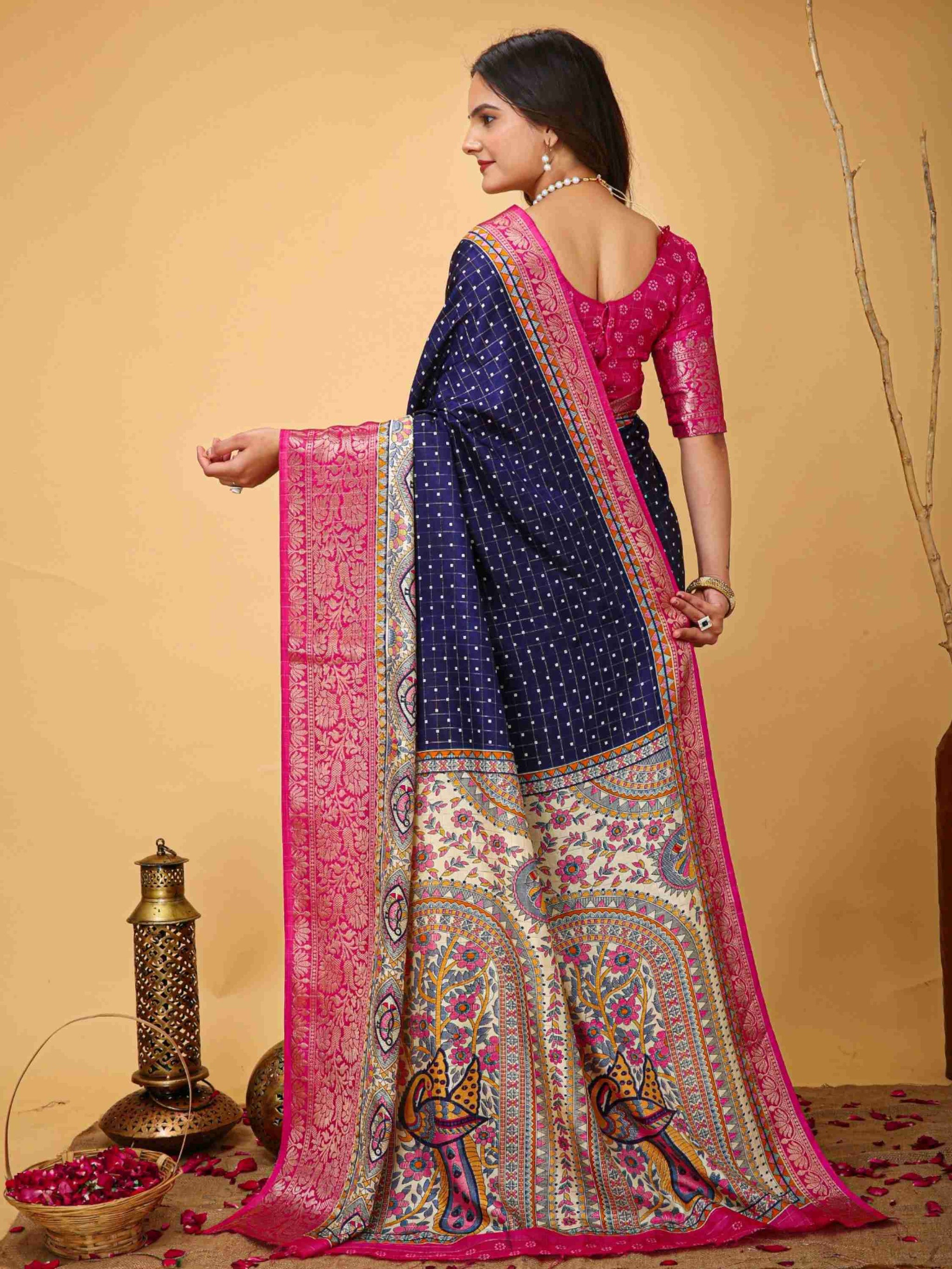 Navy Blue Dola Silk Cotton Saree with Kalamkari print, zari checks and zari border is ideal for festivals, weddings, poojas, office events & family gatherings.