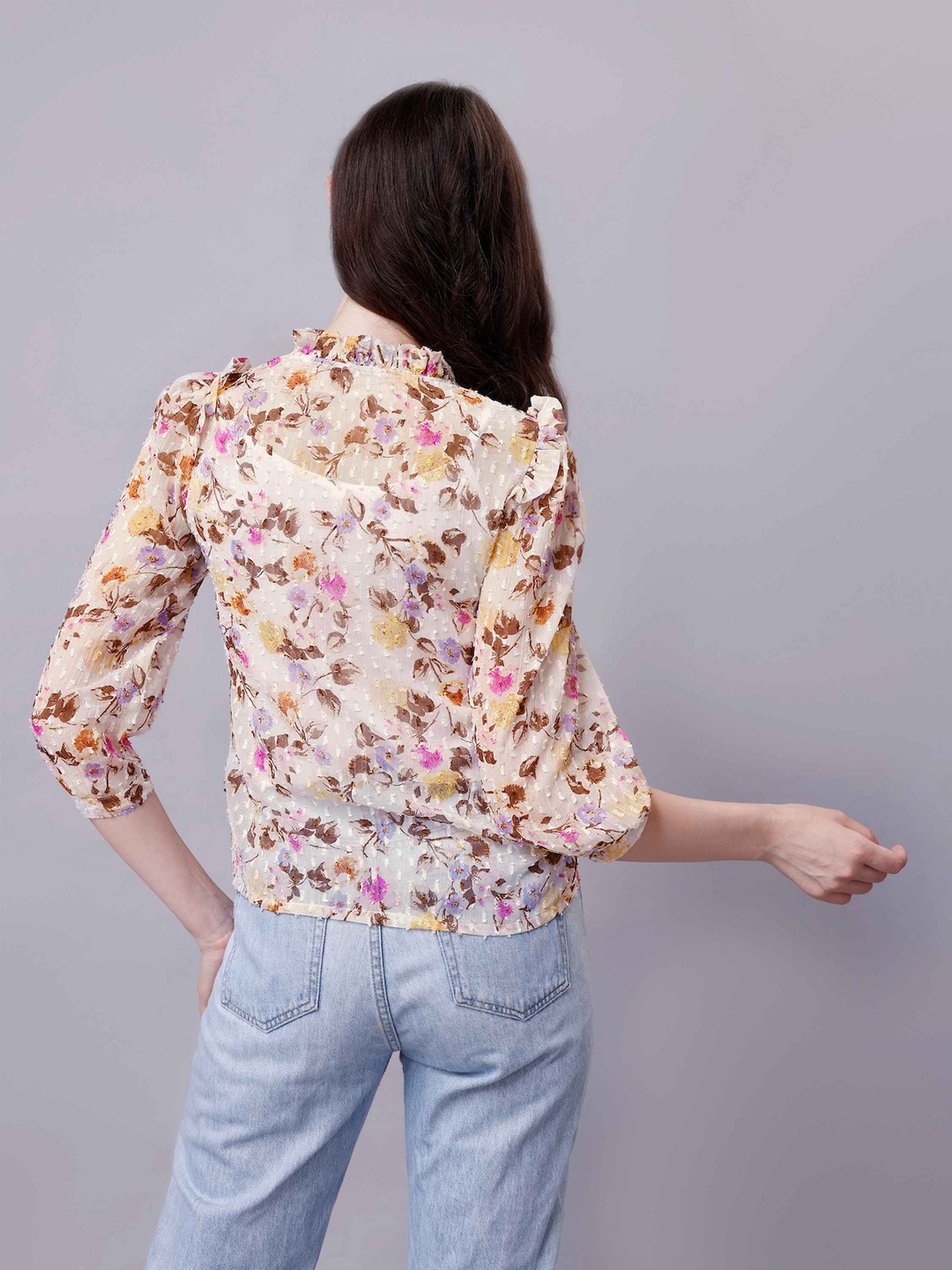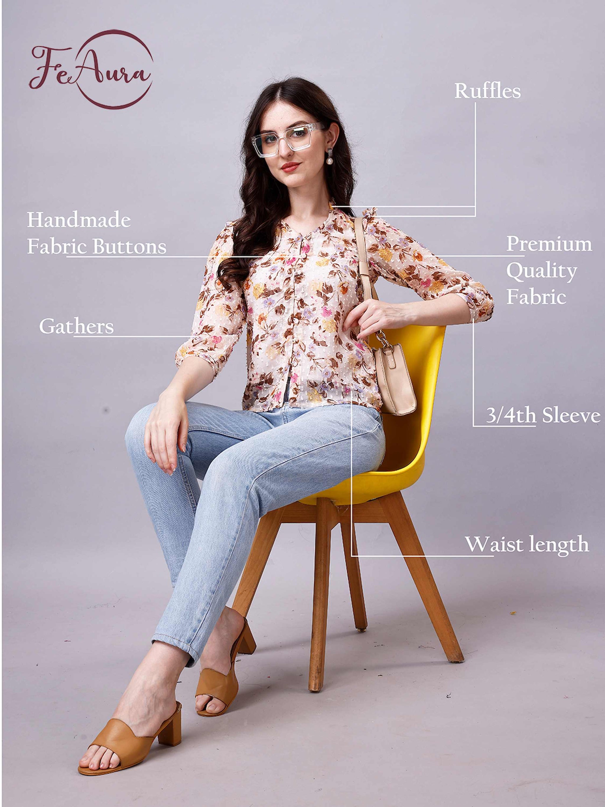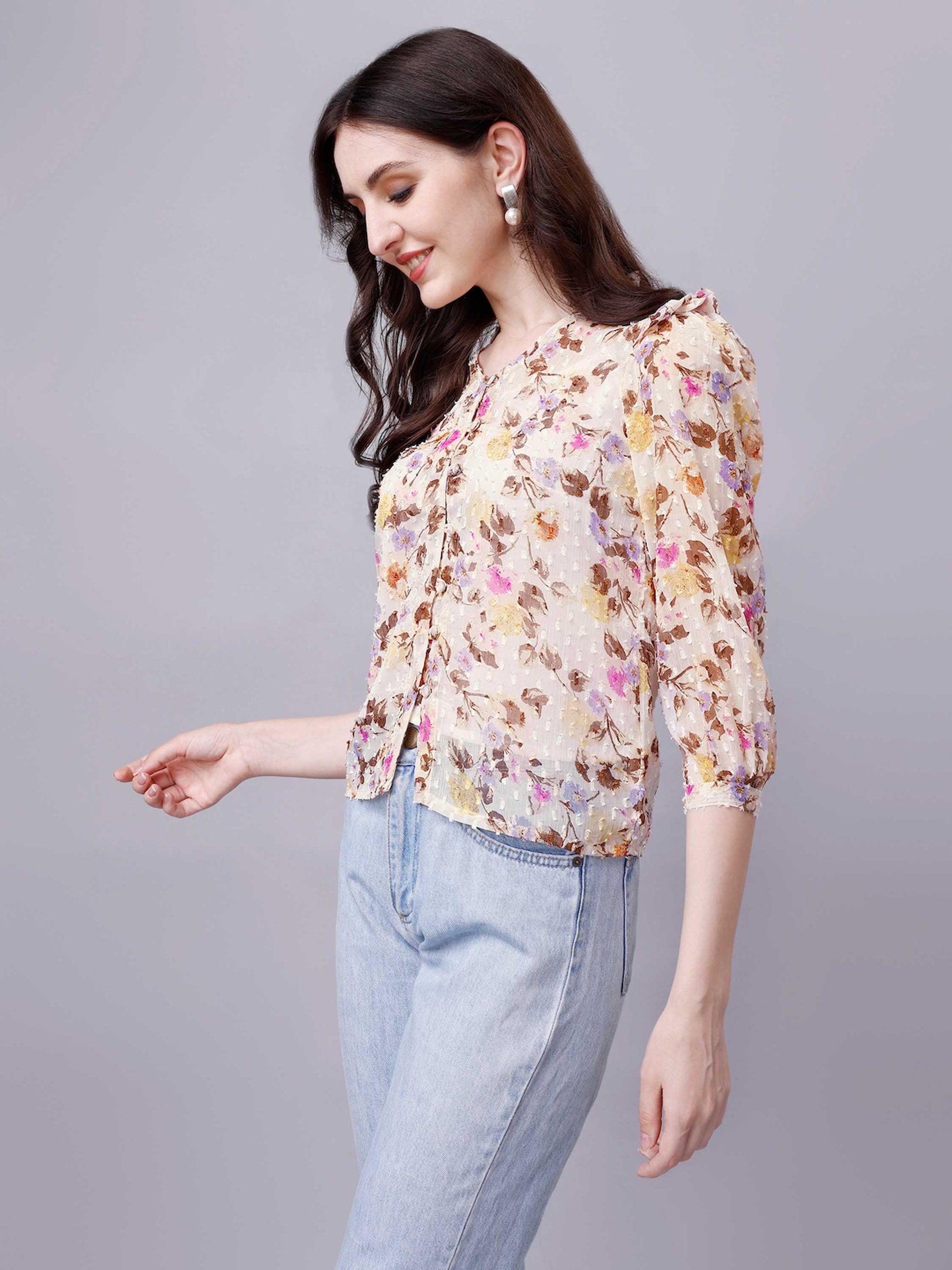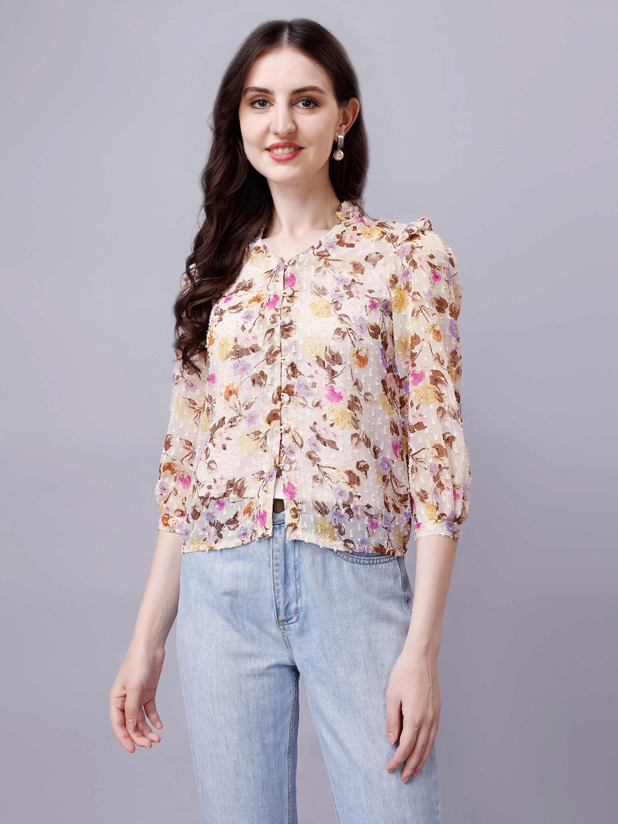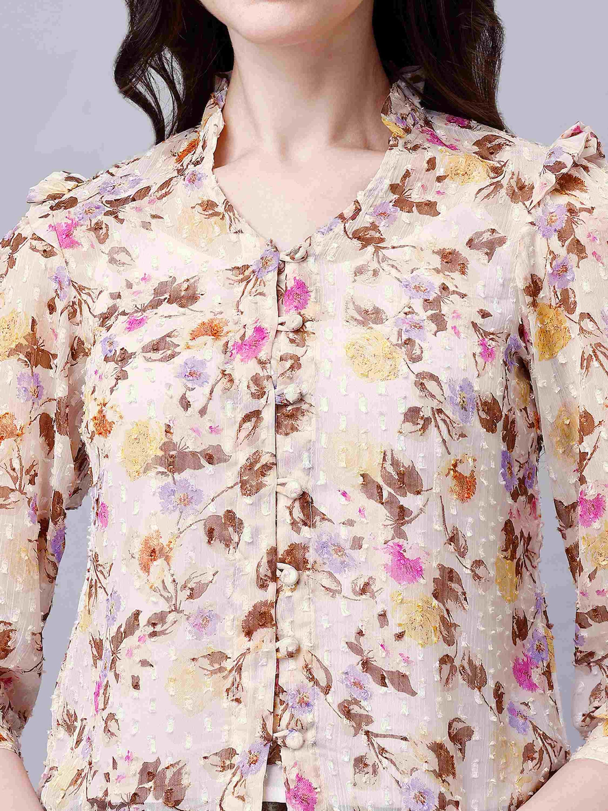 Chiffon Floral Print Sheer Shirt in Off-white is super soft, light weight and comfortable. This casual shirt can be worn throughout the day and in any occasion.