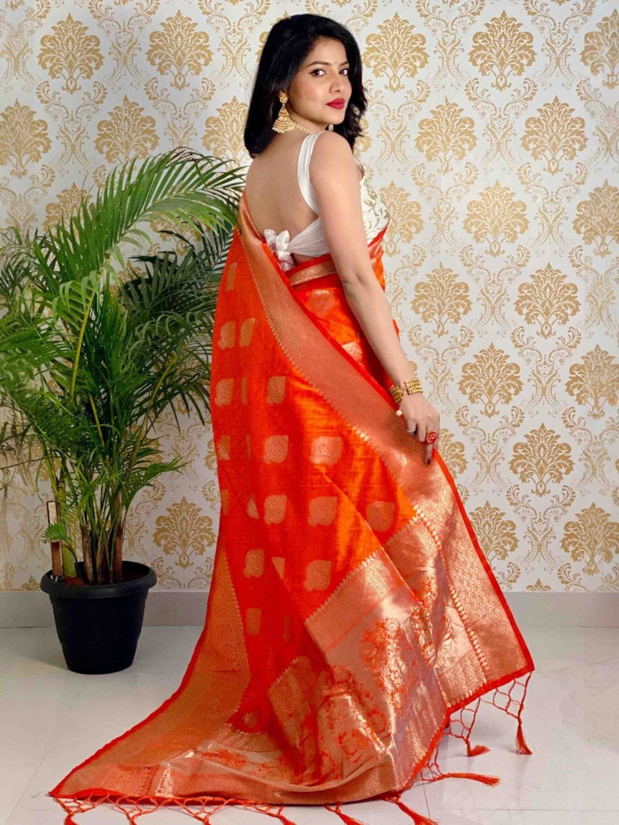 Elegant Orange Banarasi Silk Saree with geometric, floral motifs and rich zari work, comes with blouse piece. It's perfect for weddings, festivals, and parties.
