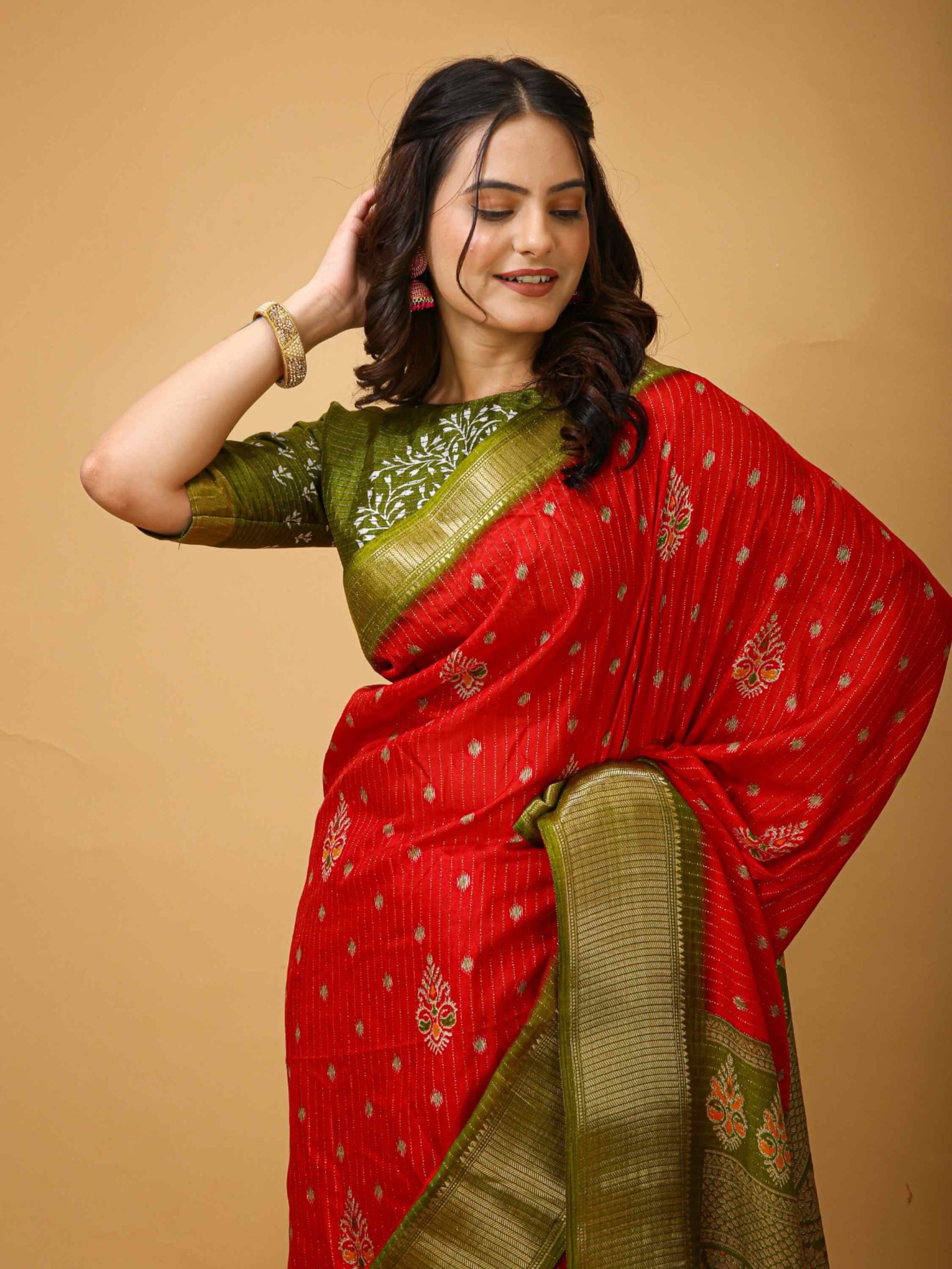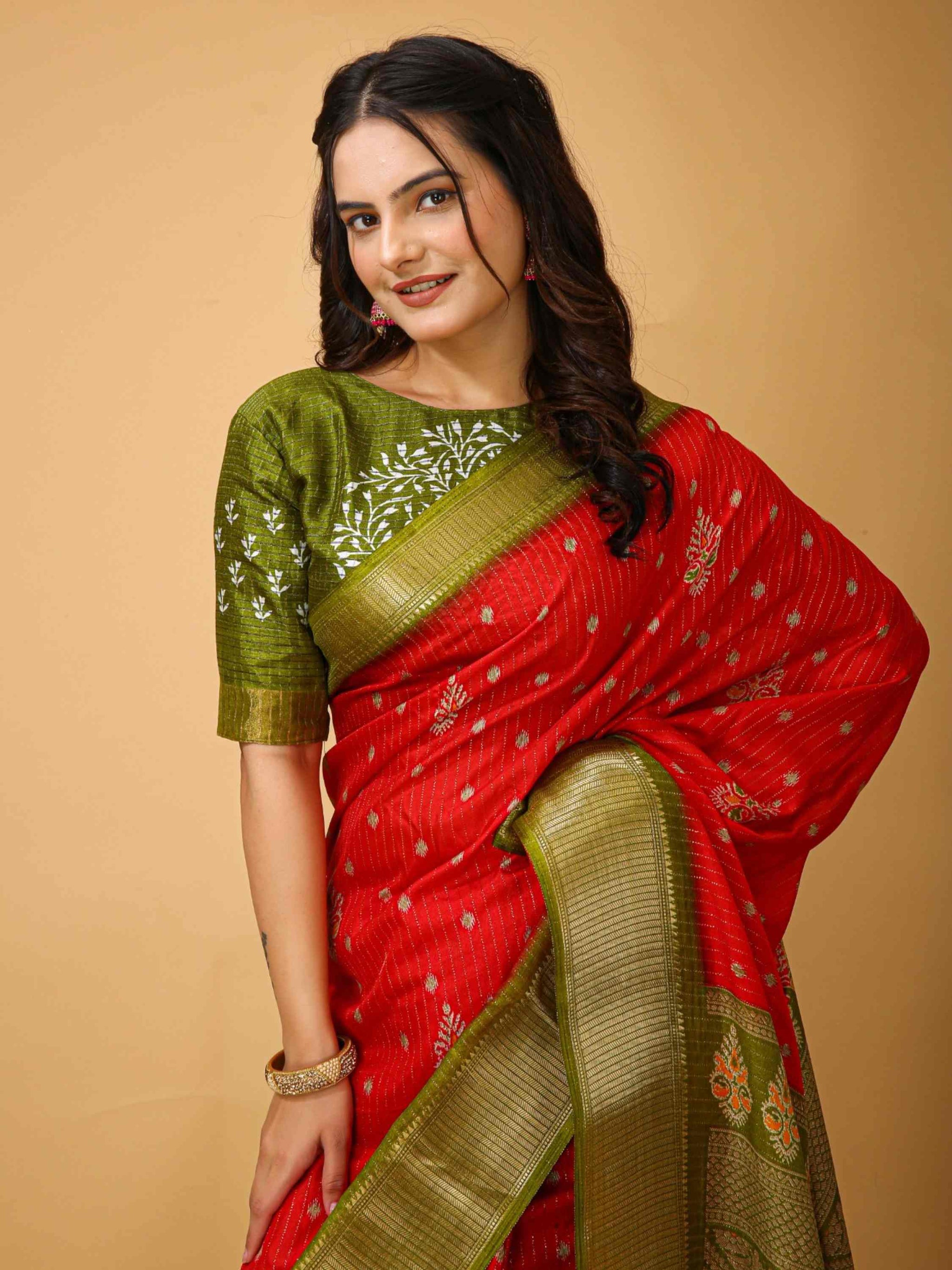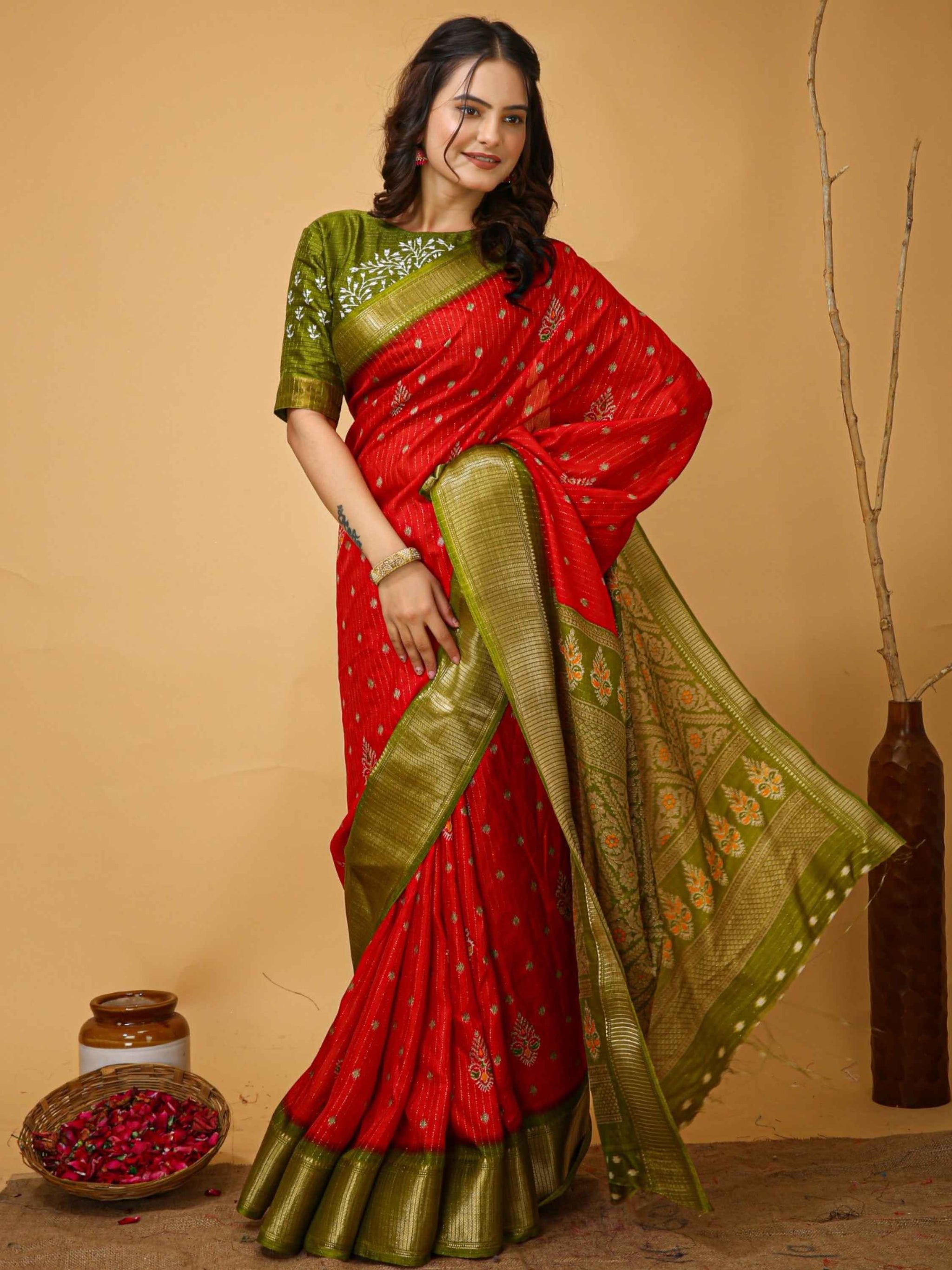 Orange Dola Silk Saree comes with mehandi green pallu, border and blouse piece. It has ethnic hand kalamkari print with zari border and all-over zari stripes.