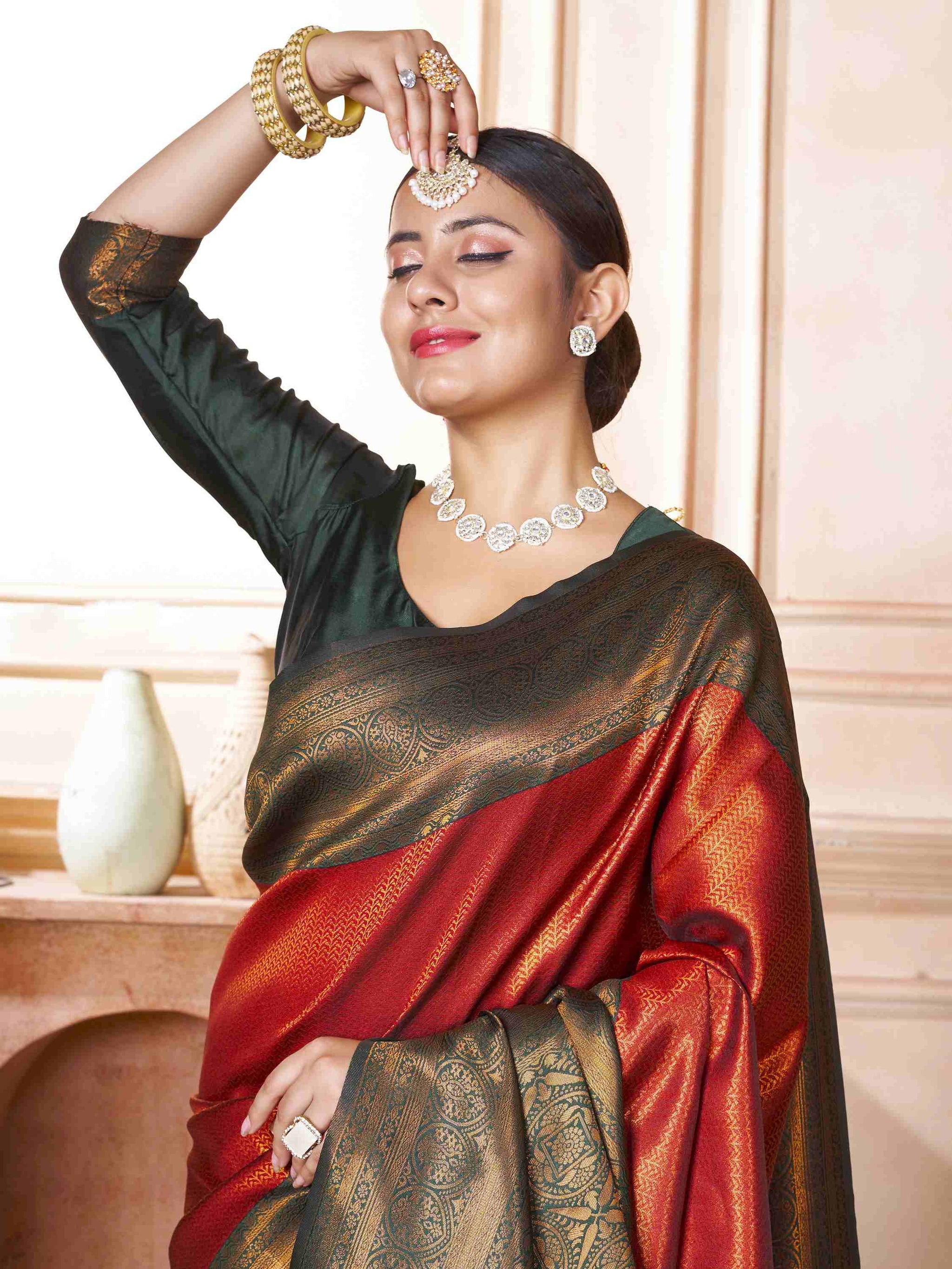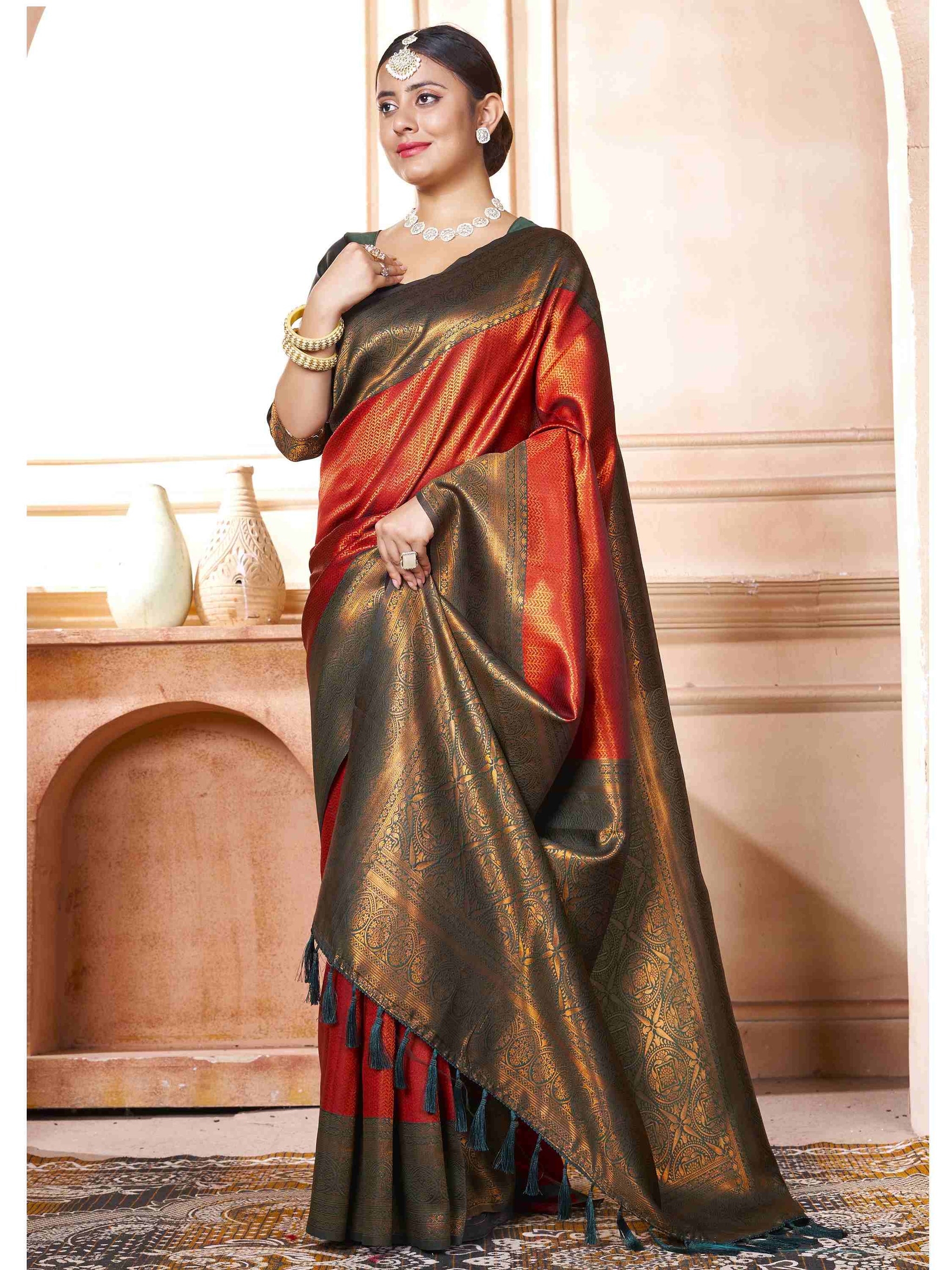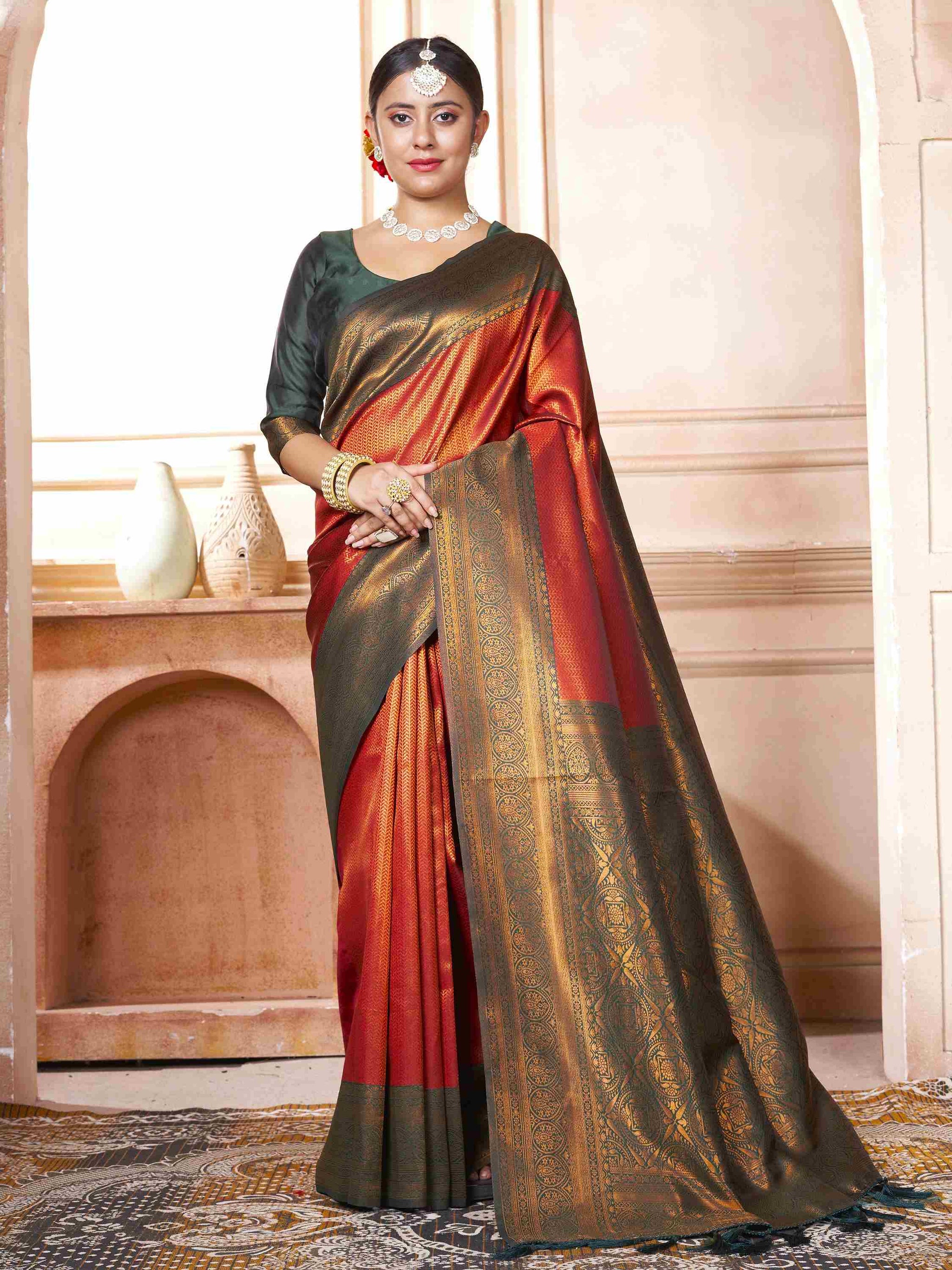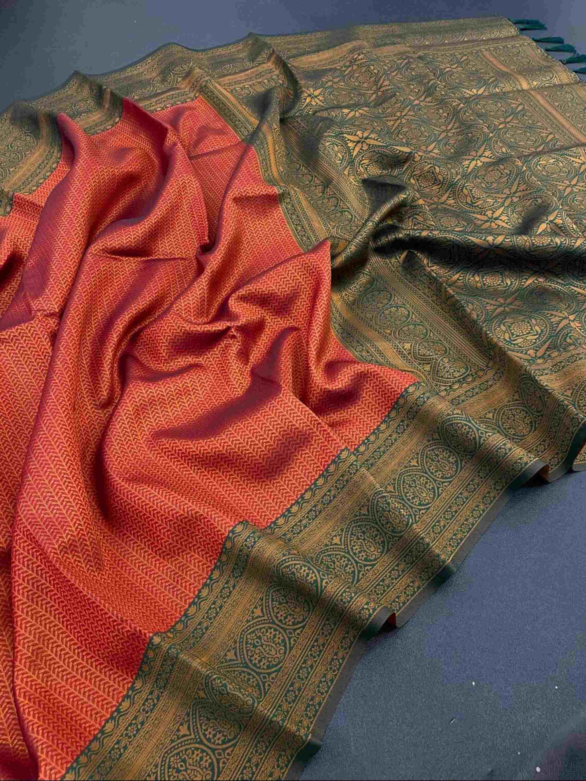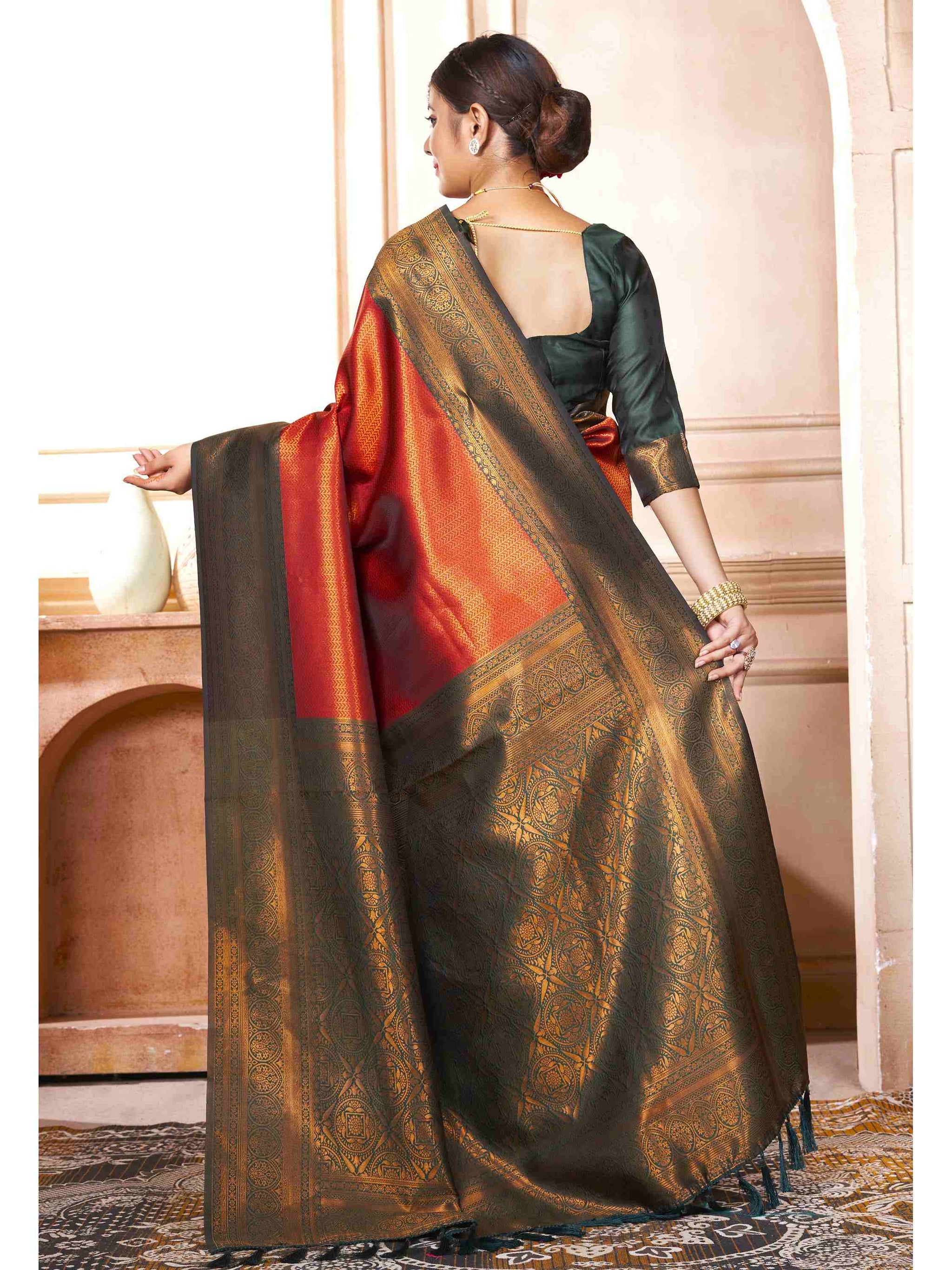 Orange Kanchipuram Silk Saree has green border, Kubera pattu, and blouse piece. This Kanjivaram saree is perfect for festivals, wedding, party, etc.