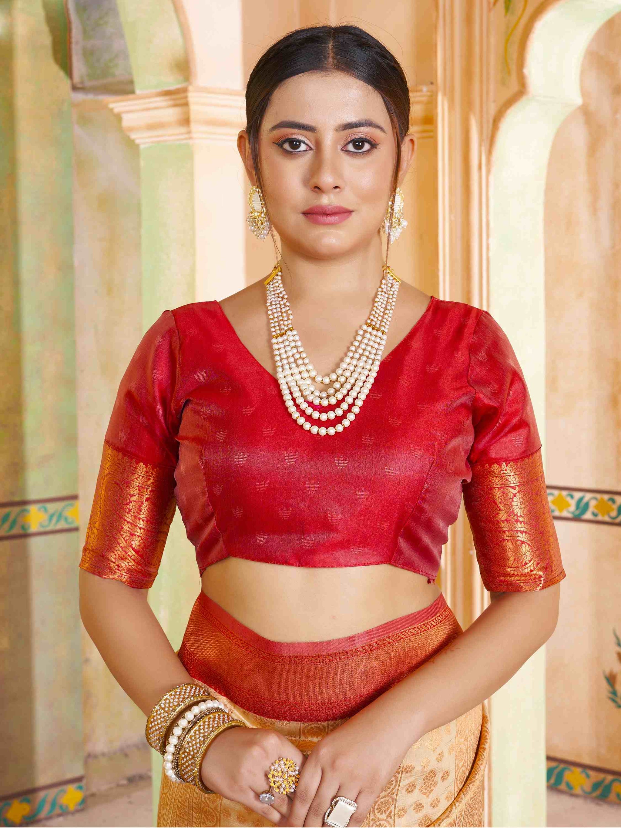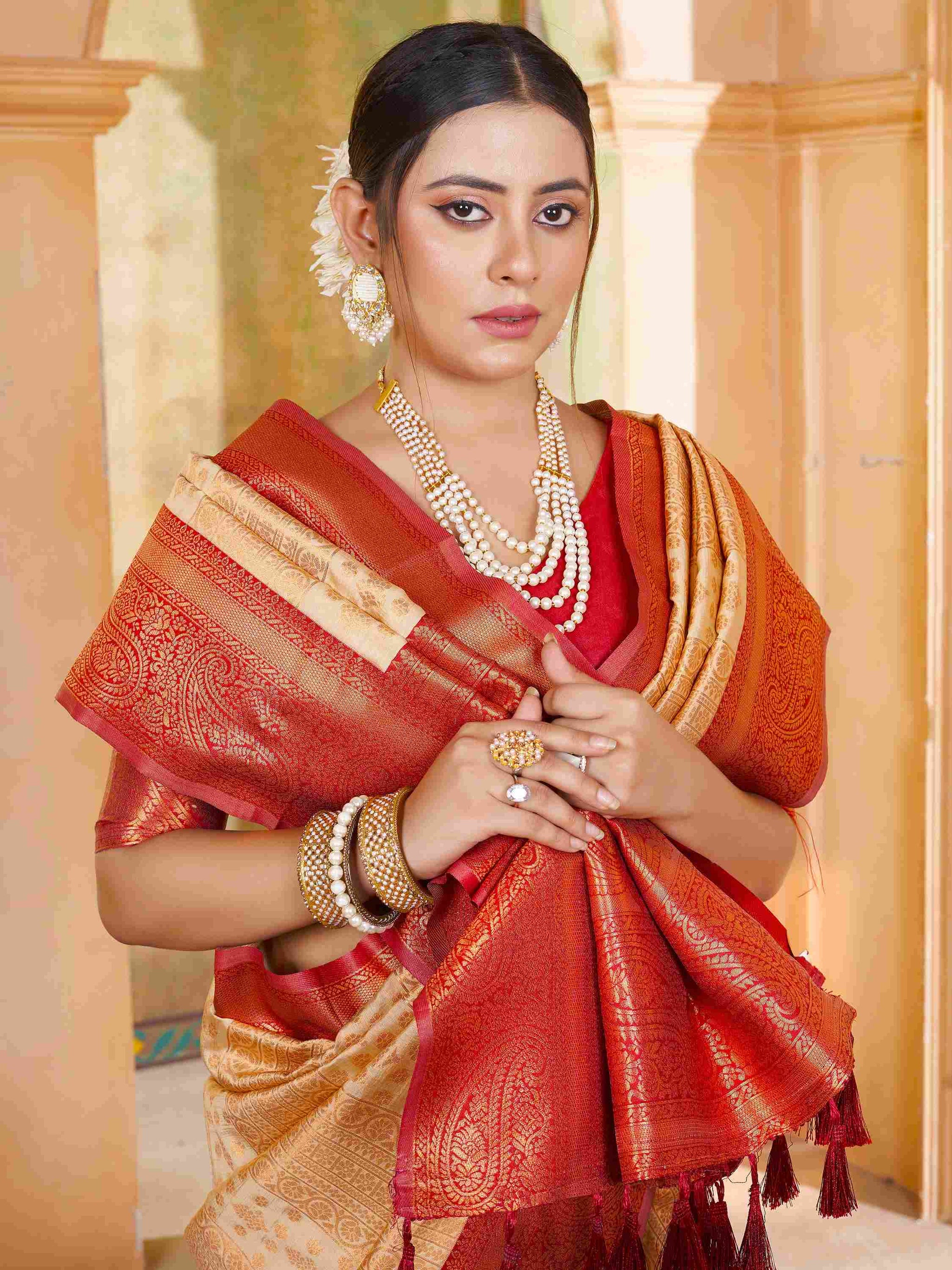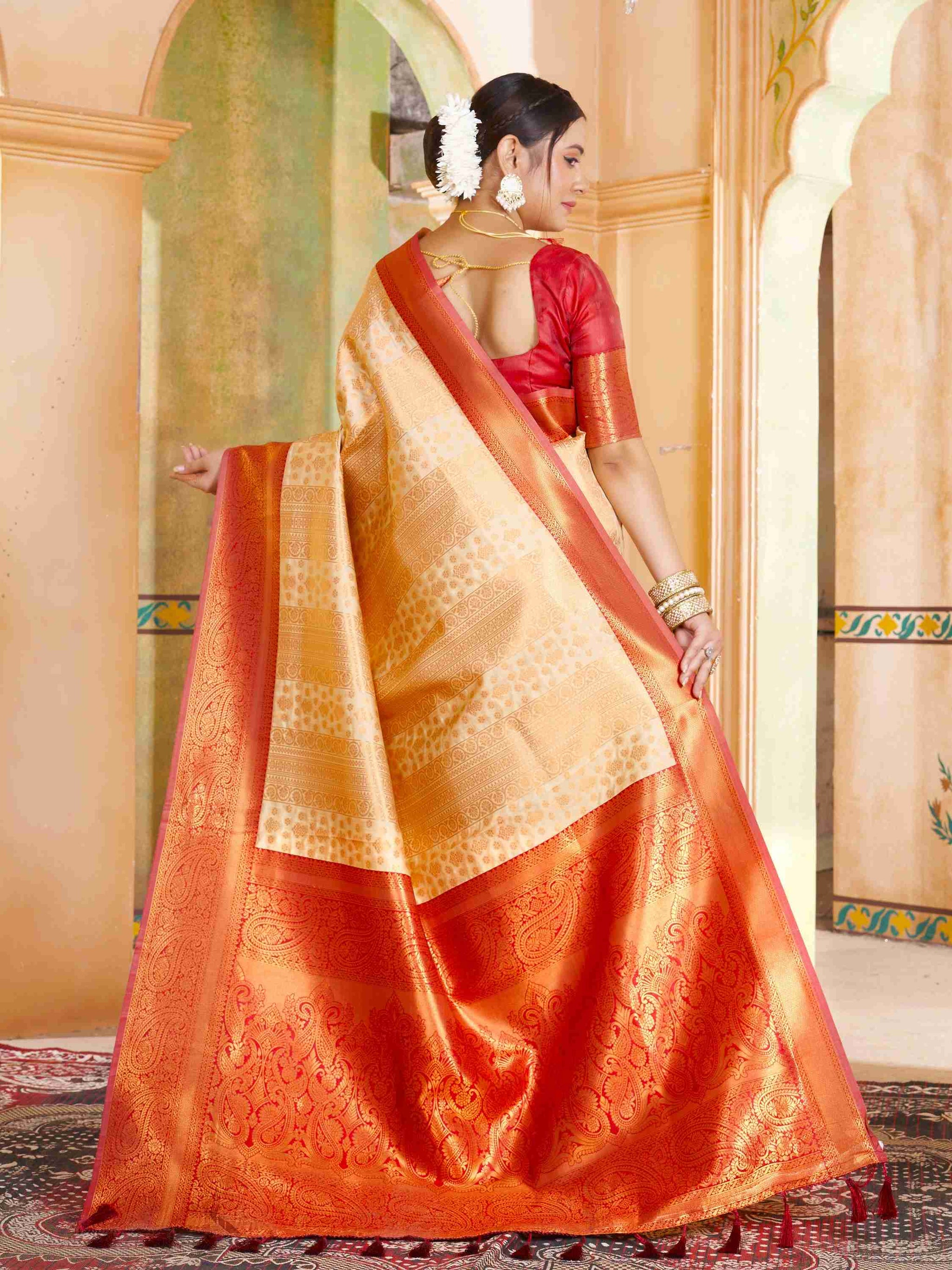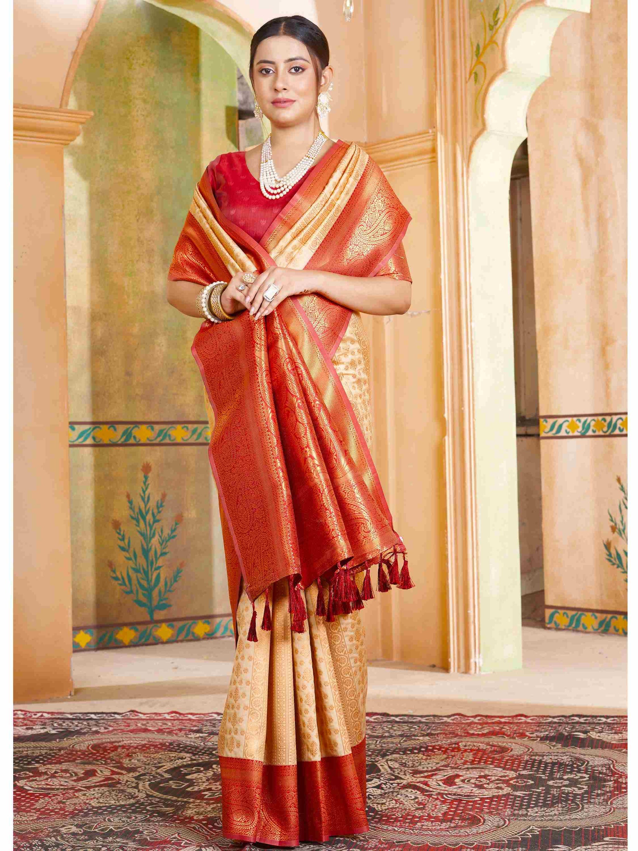 Party Wear Cream Kanjivaram Silk Saree with rich zari weave, ethnic motifs, and zari border. Paired with unstitched blouse. Perfect for weddings and parties.