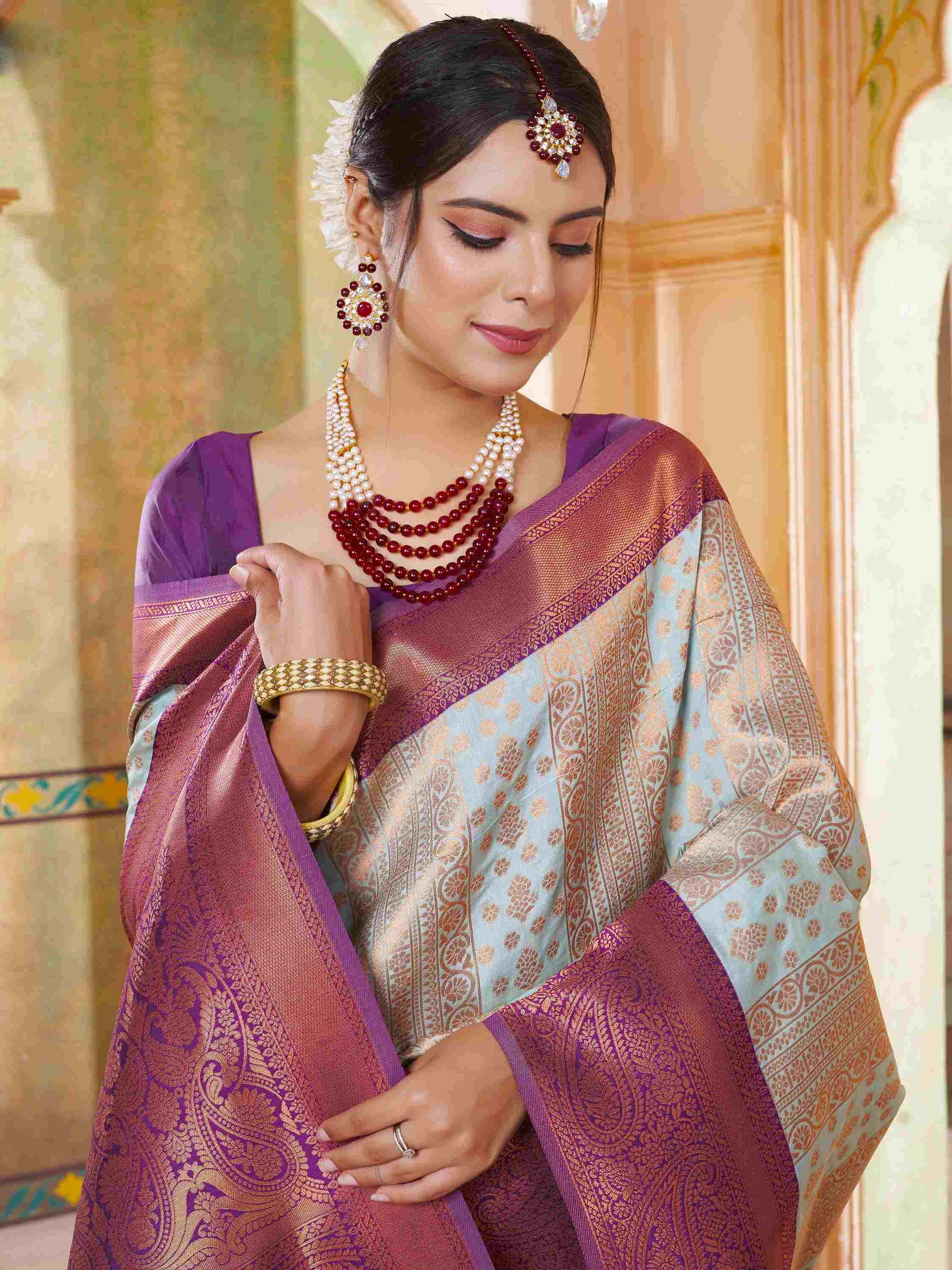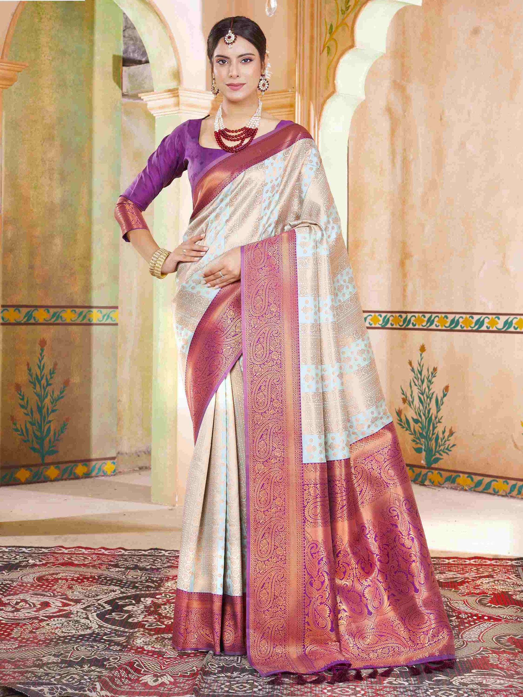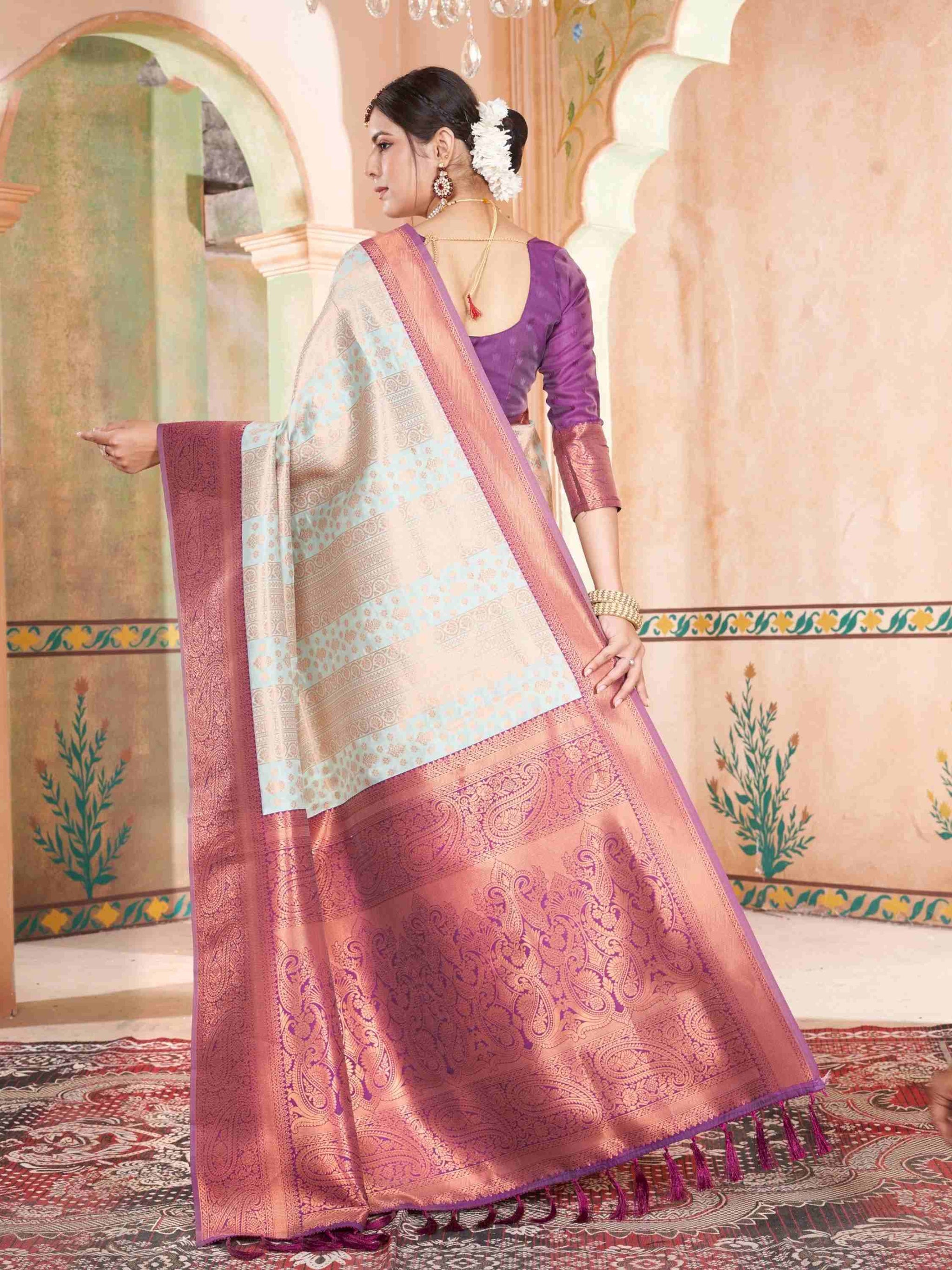 Party Wear Mint Green Kanjivaram Silk Saree with rich zari weave, ethnic motifs and zari border. Paired with unstitched blouse. Perfect for weddings and parties