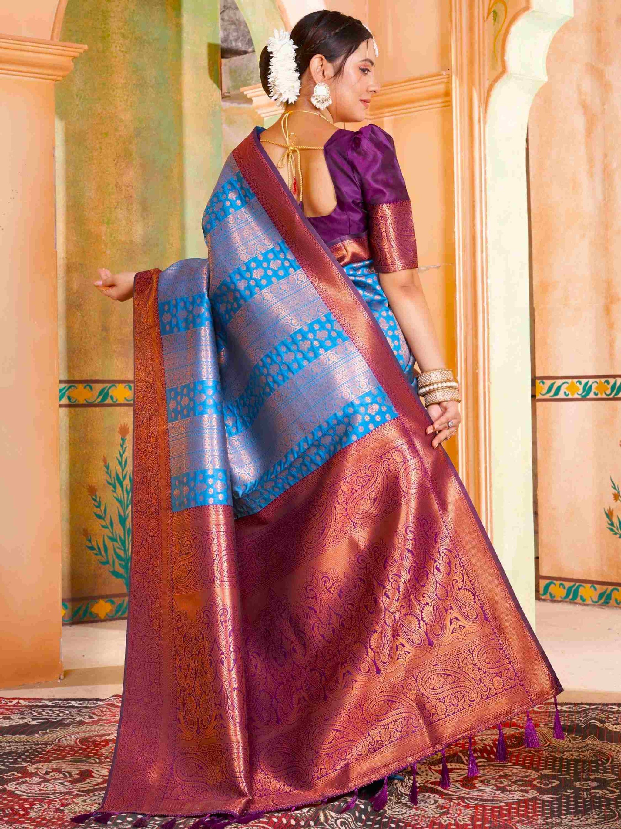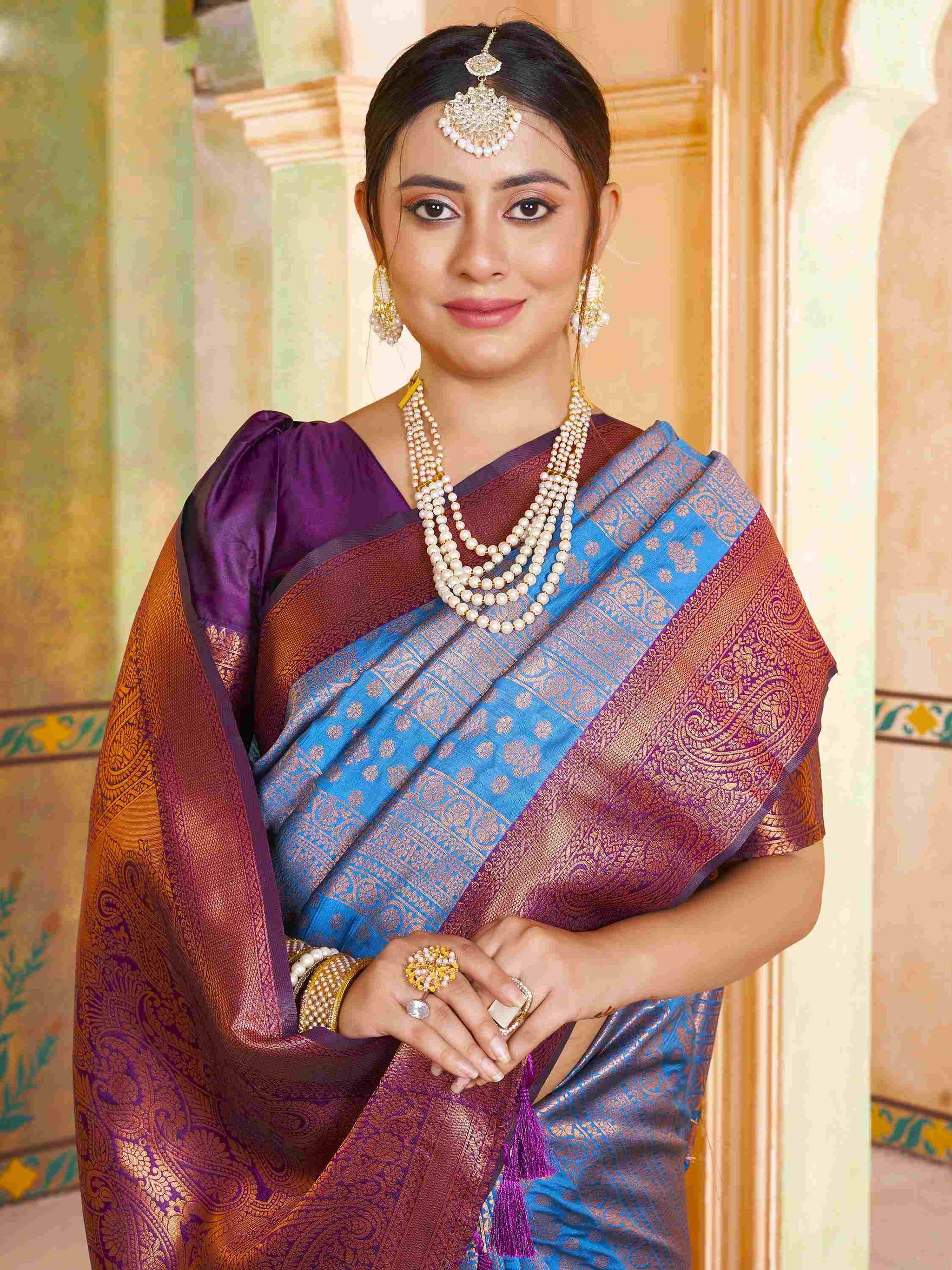 Party Wear Sky Blue Kanjivaram Silk Saree with rich zari weave, ethnic motifs, and zari border. Paired with unstitched blouse. Perfect for weddings and parties.