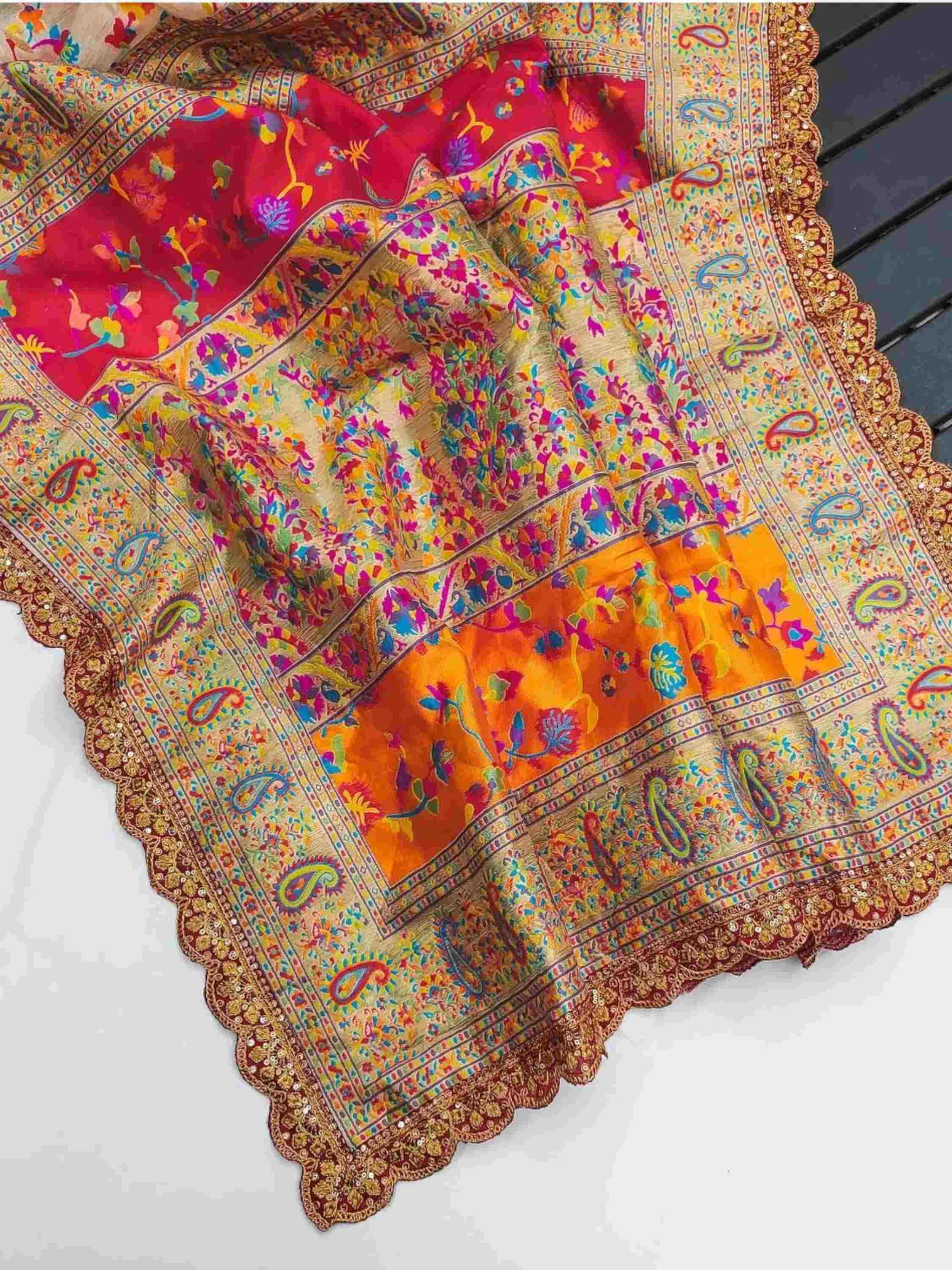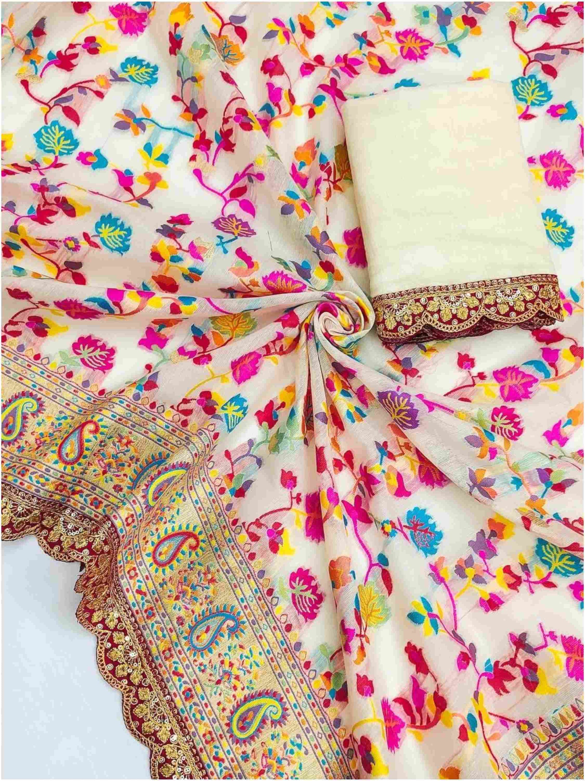 Pashmina Silk Saree has colourful woven floral patterns throughout the saree with matching solid blouse piece. It has beautiful scallop sequence lace at border.