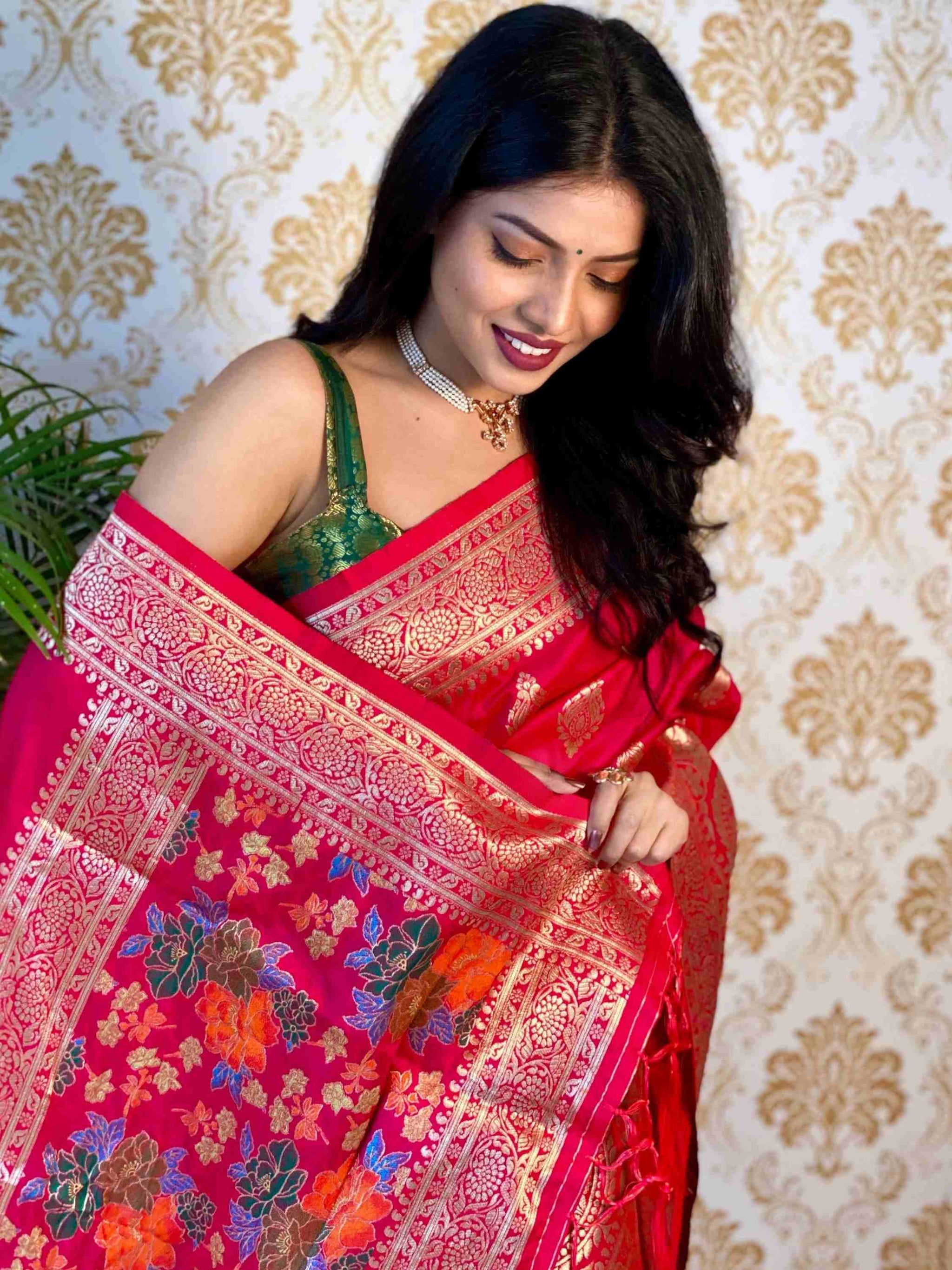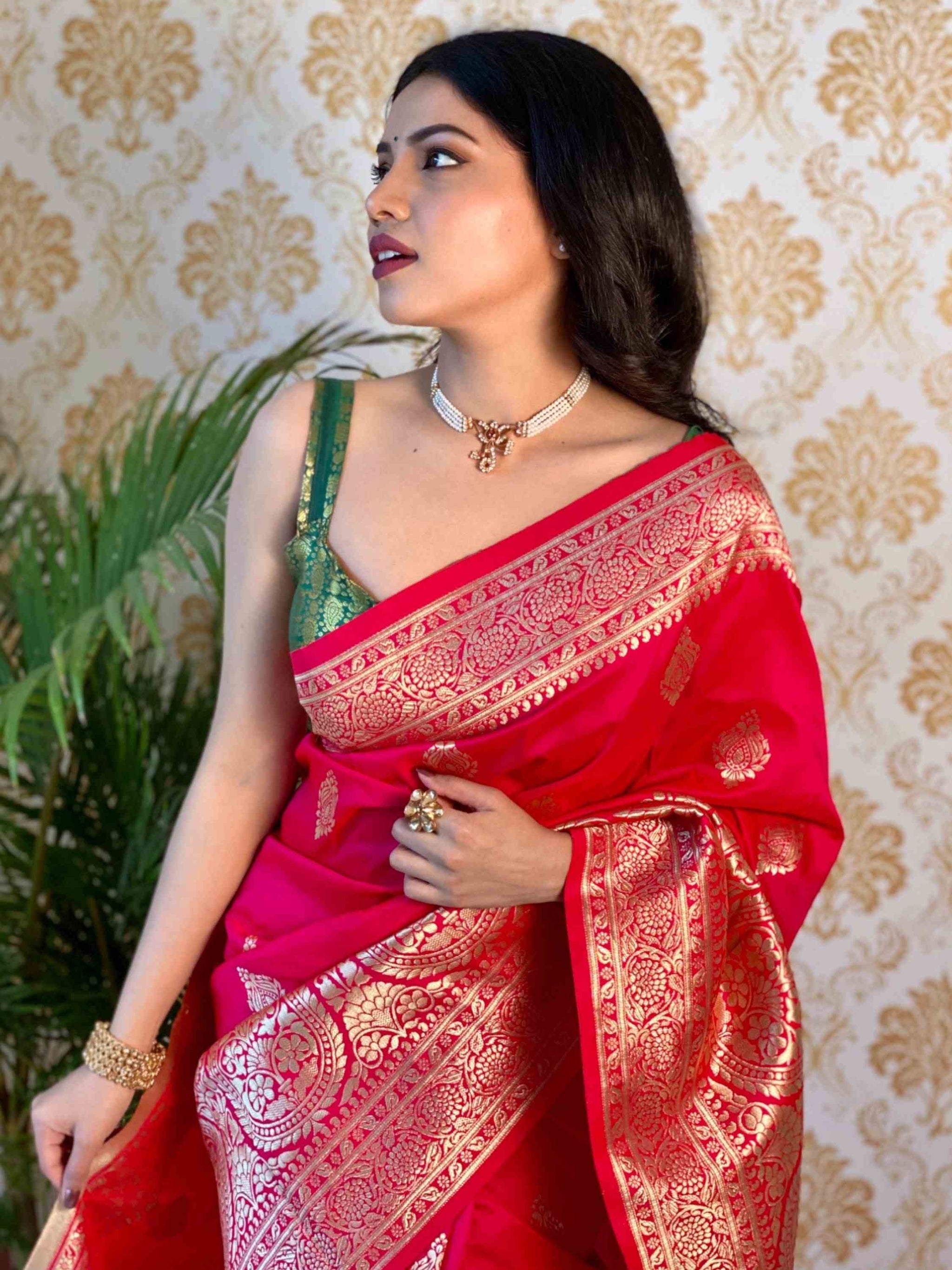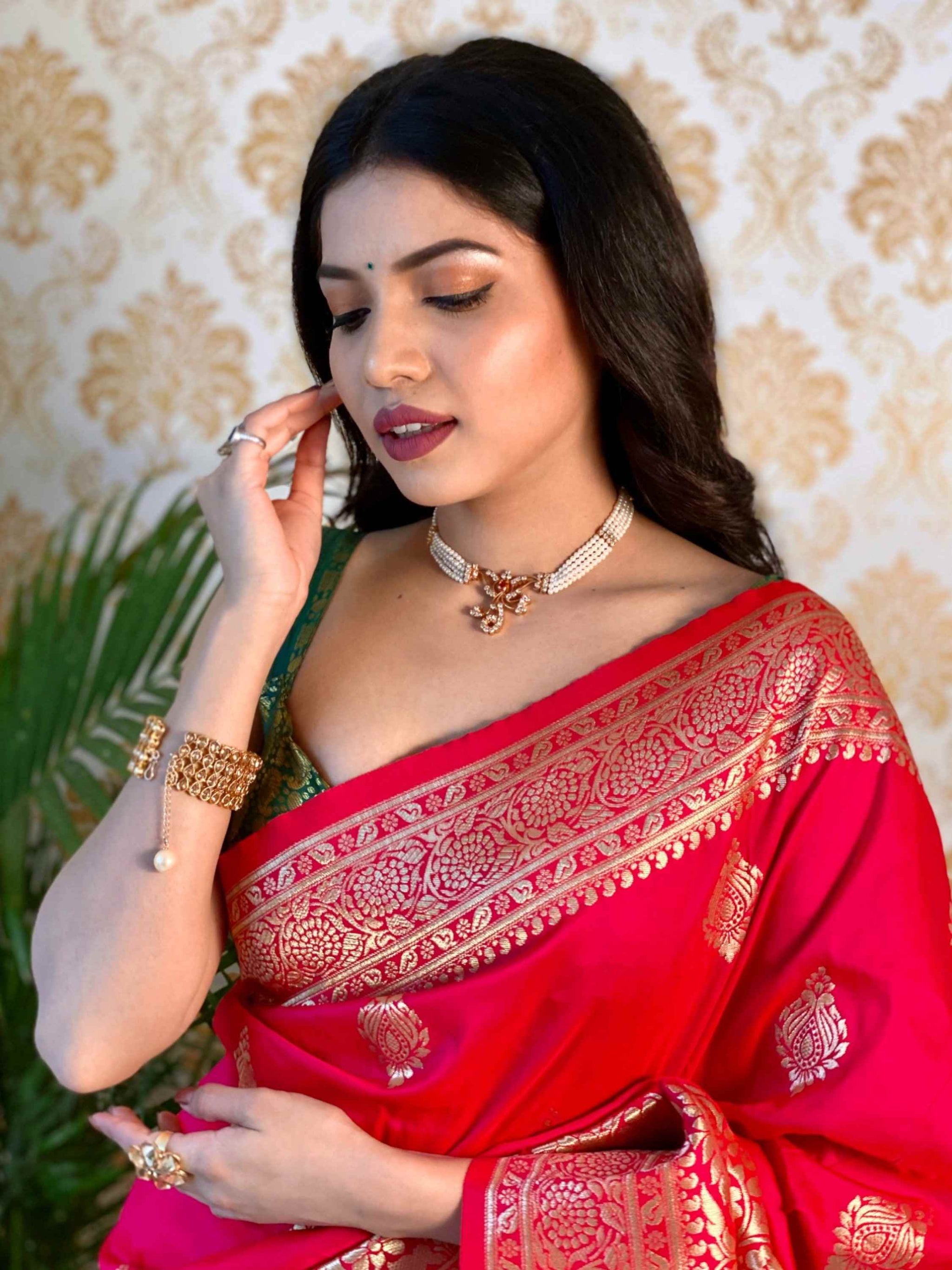 Elegant Pink Banarasi Silk Saree with Traditional Motifs and rich zari work. It comes with running blouse piece, perfect for weddings, festivals, and parties.