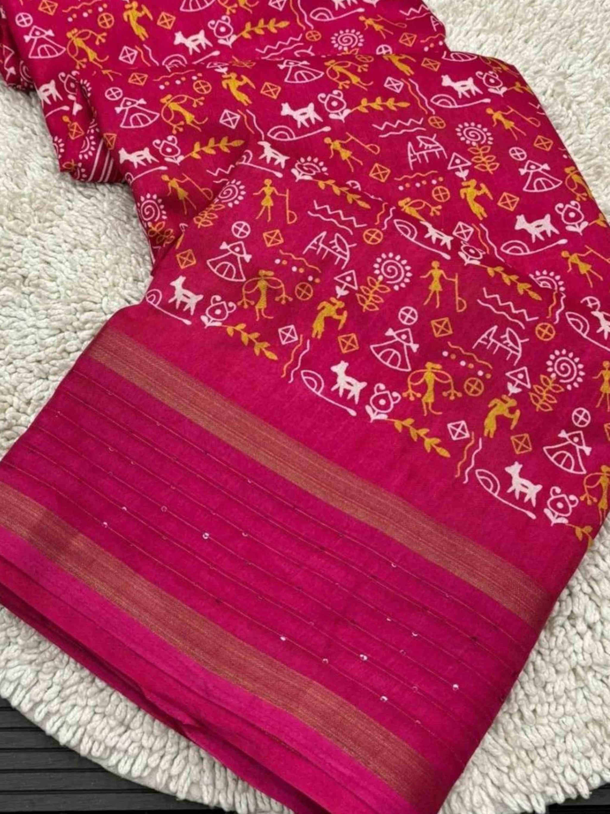 Pink Cotton Dola Silk Saree featuring all-over Warli print and a sequin border. Ideal for casual and festive occasions. Comes with a printed blouse piece.