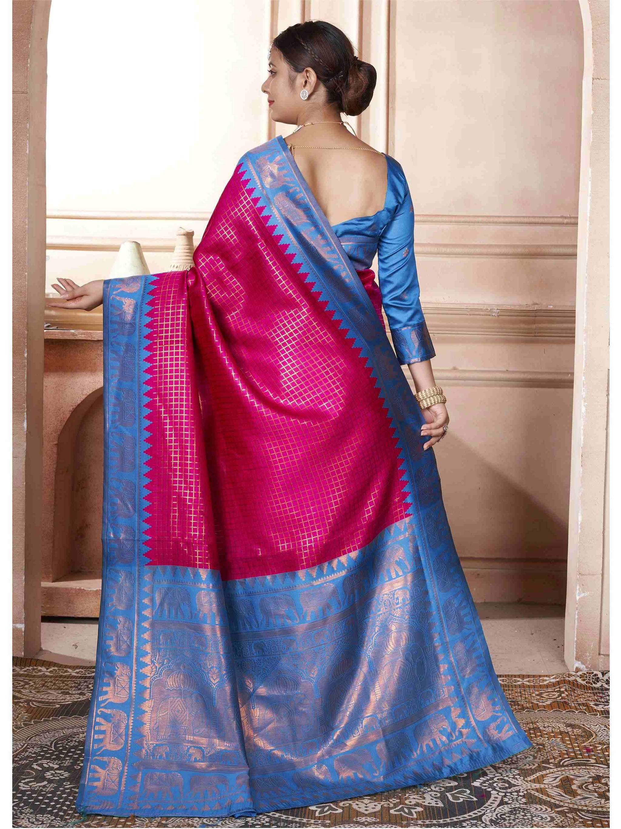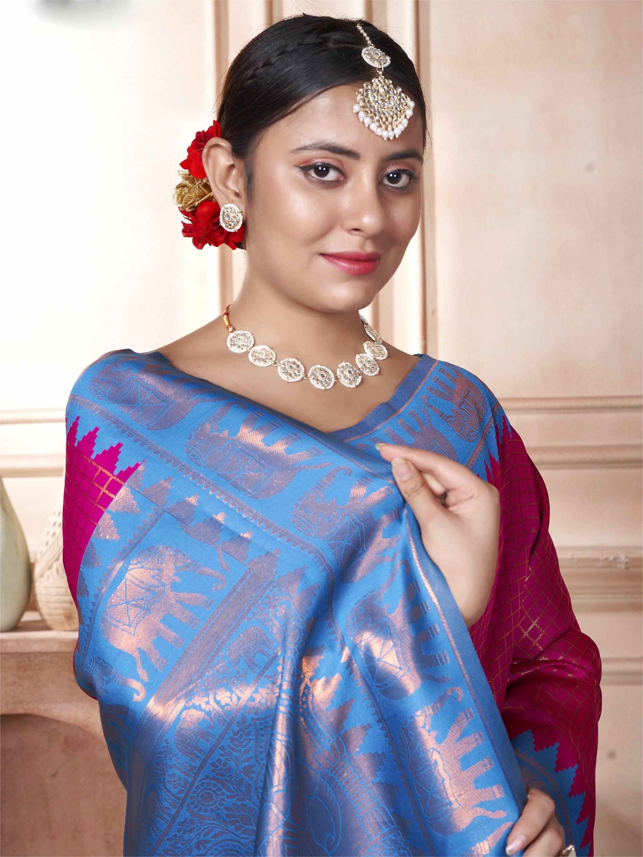 Pink Kanjivaram Silk Saree with Sky Blue Border, featuring traditional ethnic motifs and rich zari weave—perfect for weddings, festivals, and party occasions.
