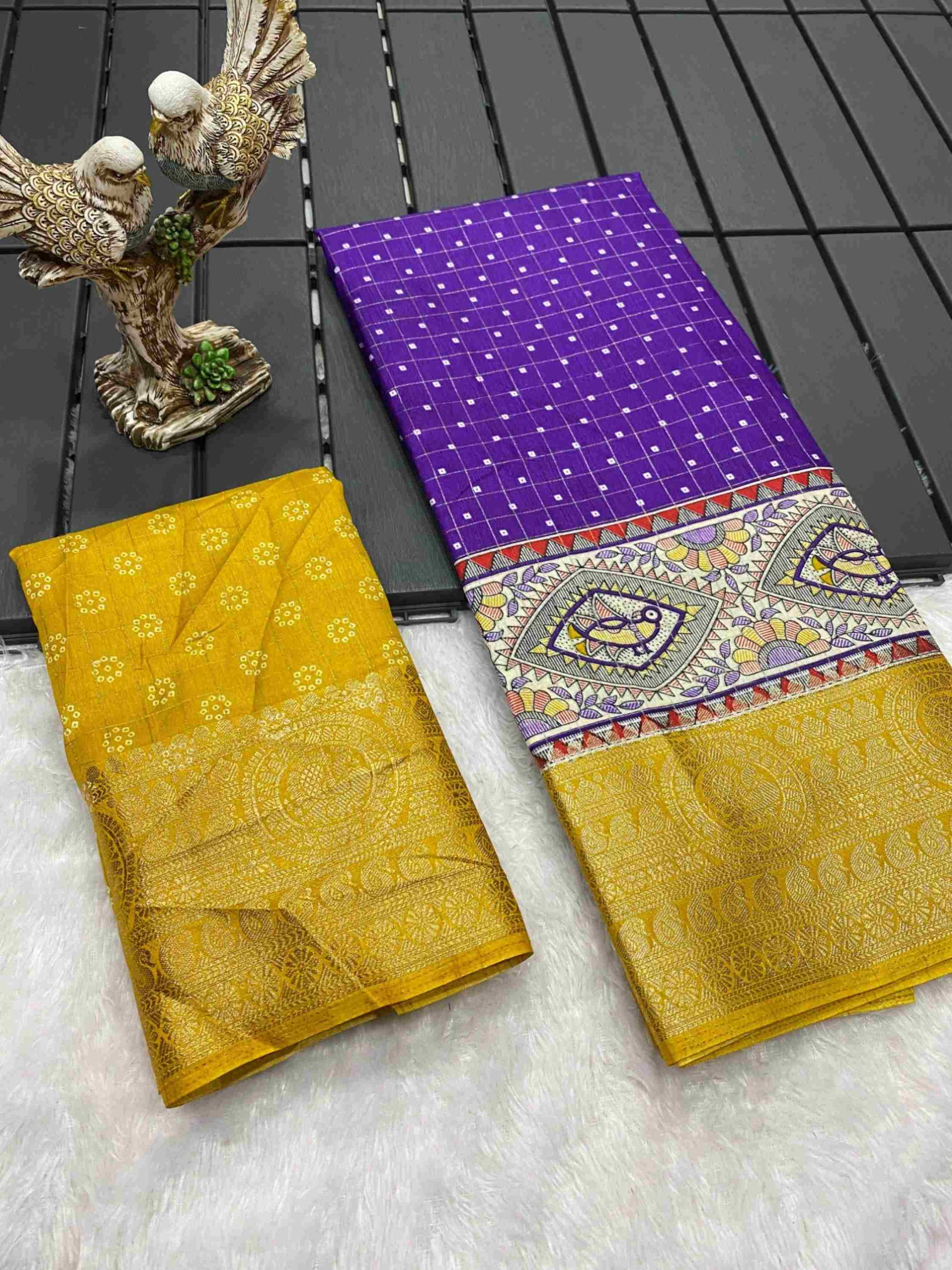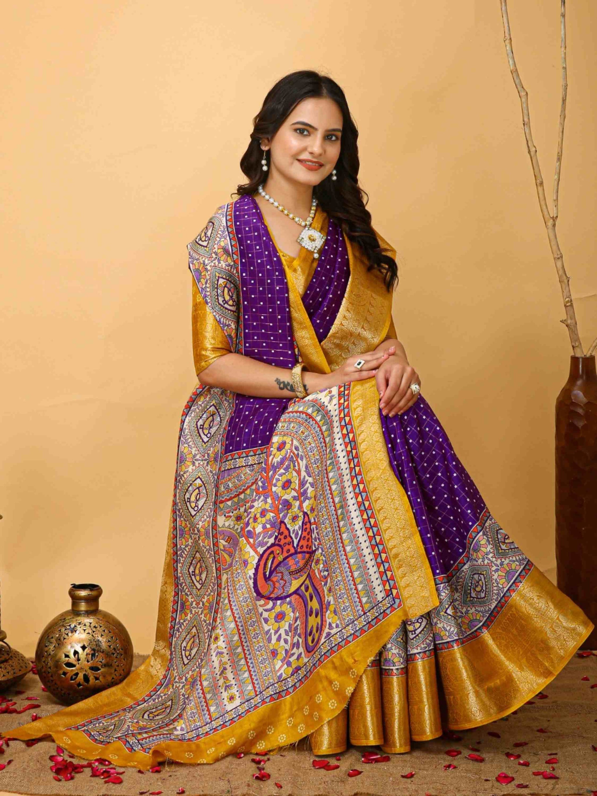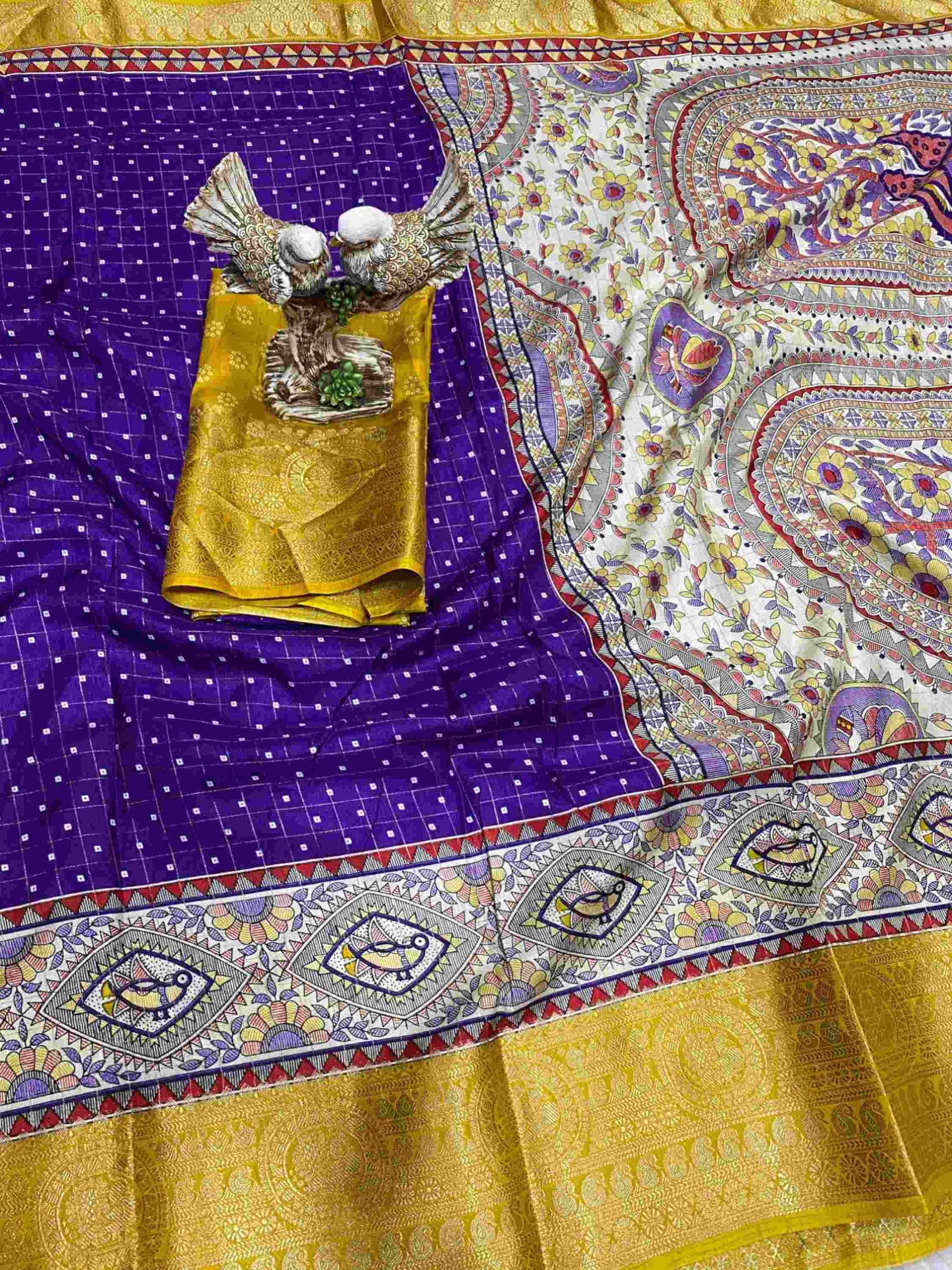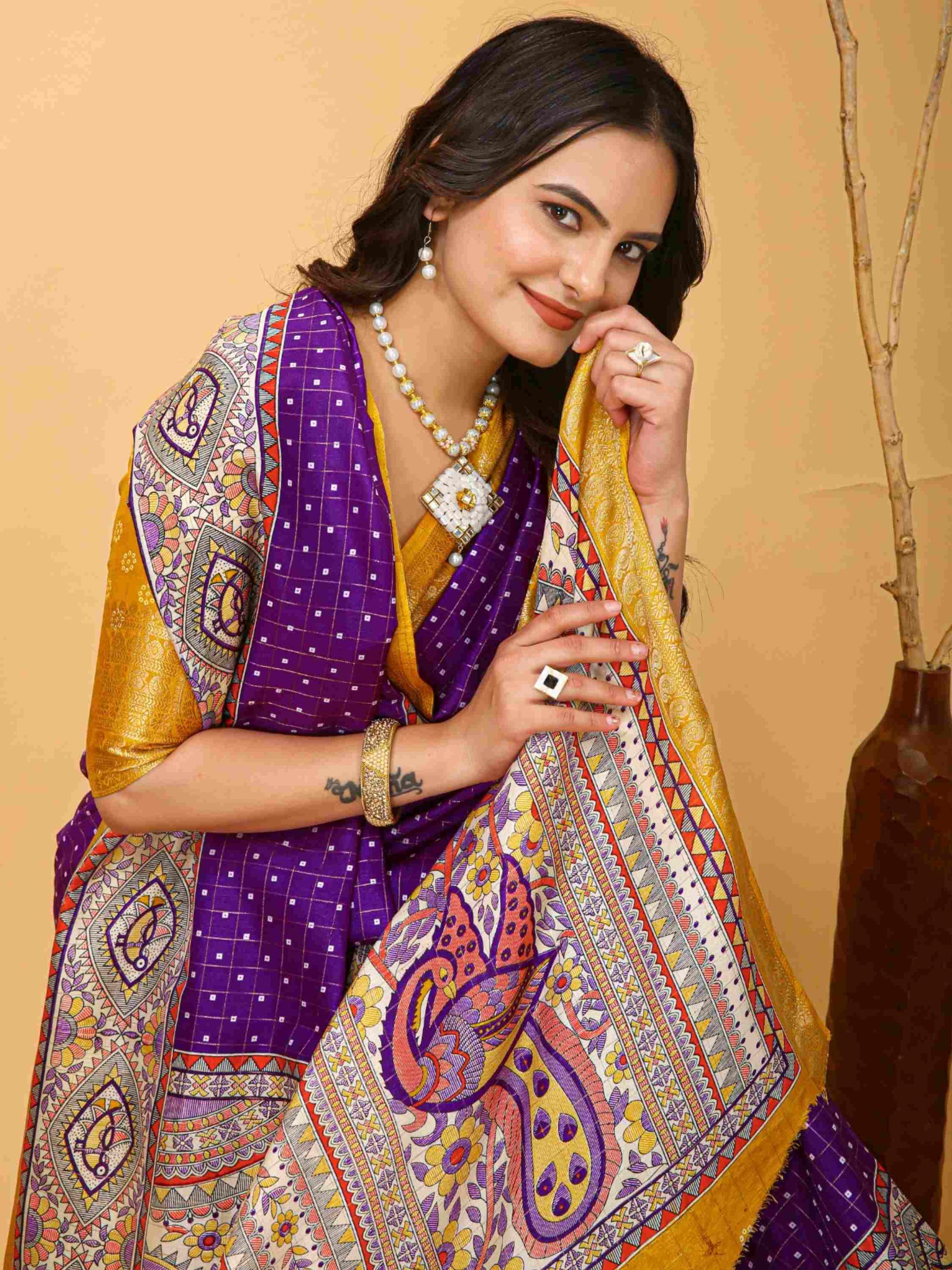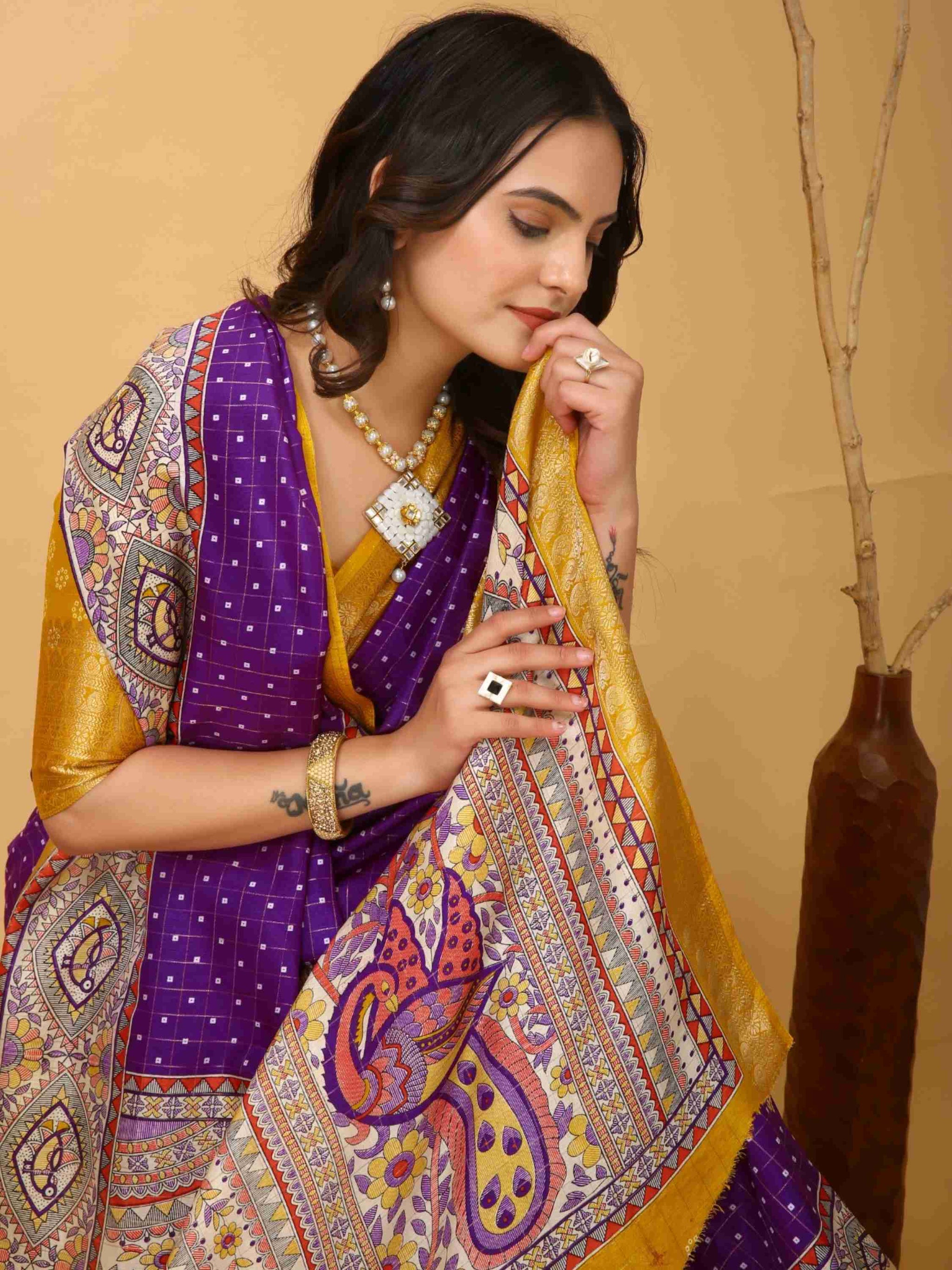 Purple Dola Silk Cotton Saree with Kalamkari print, zari checks and zari border is ideal for festivals, weddings, poojas, office events and family gatherings.