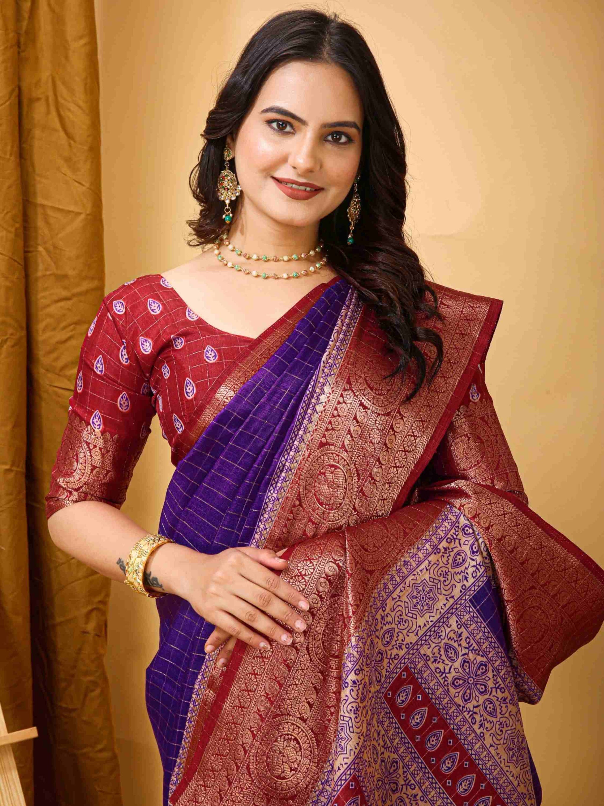 Purple Dola Silk Cotton Saree with woven zari checks Kalamkari print & zari border. Ideal for festivals, weddings, poojas, office events & family gatherings.