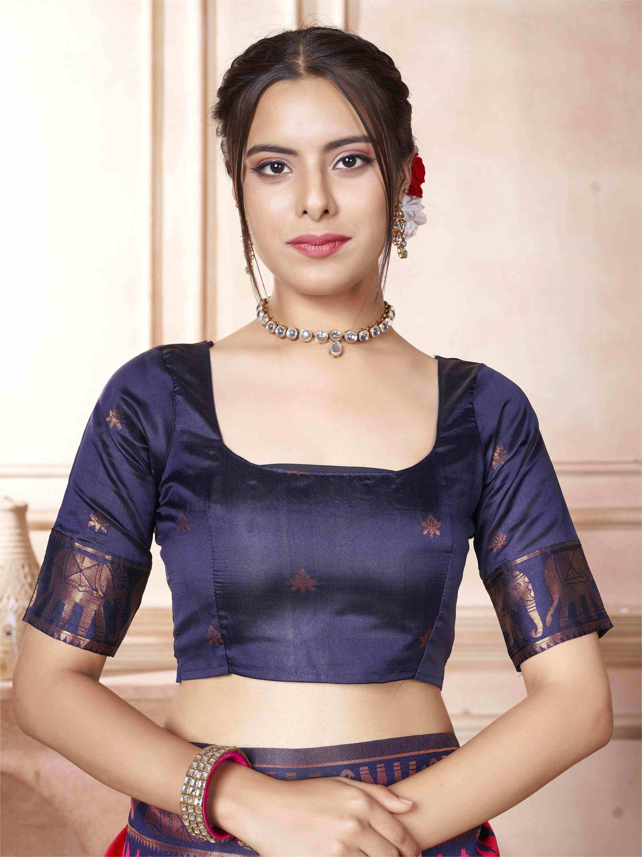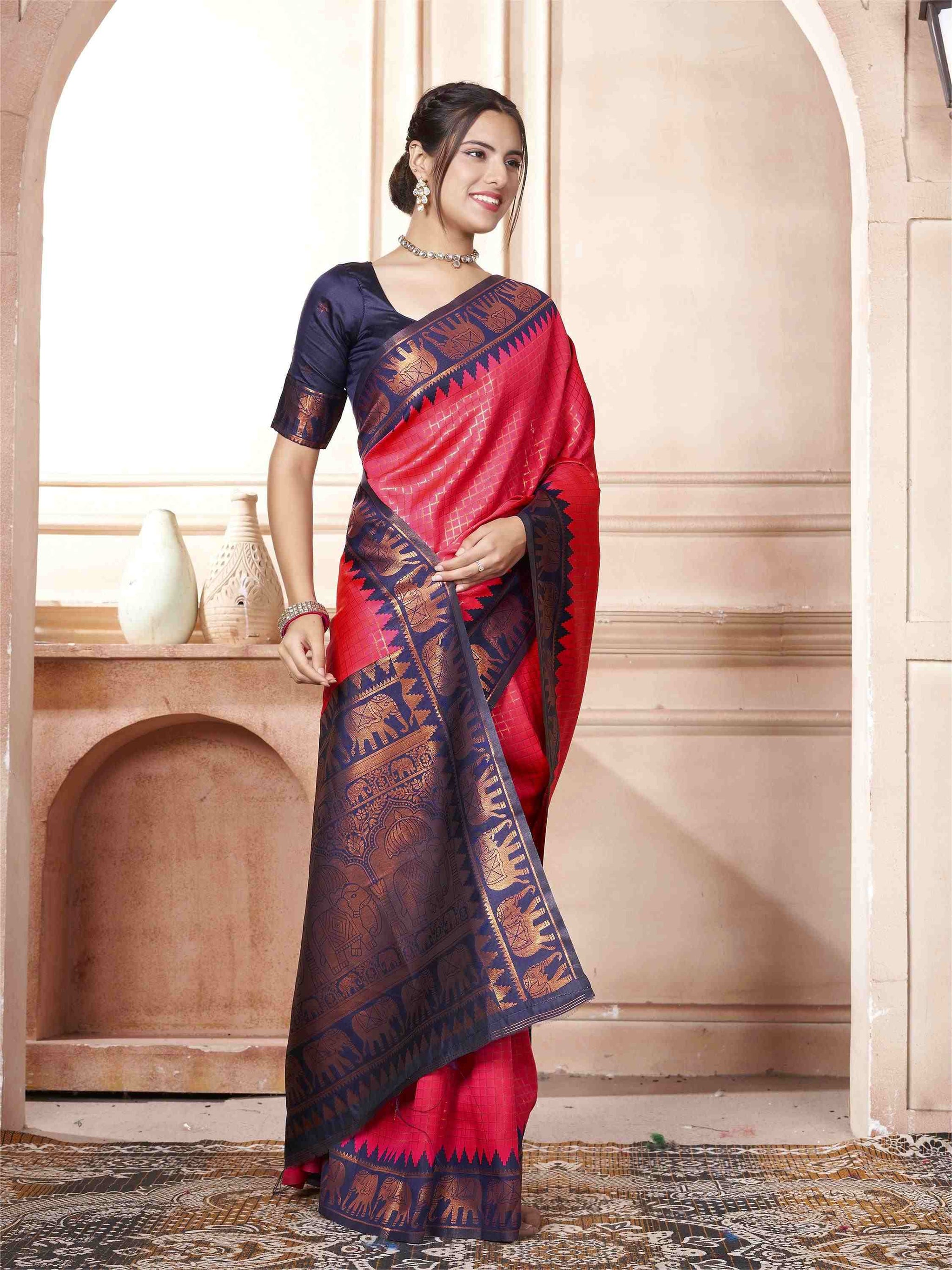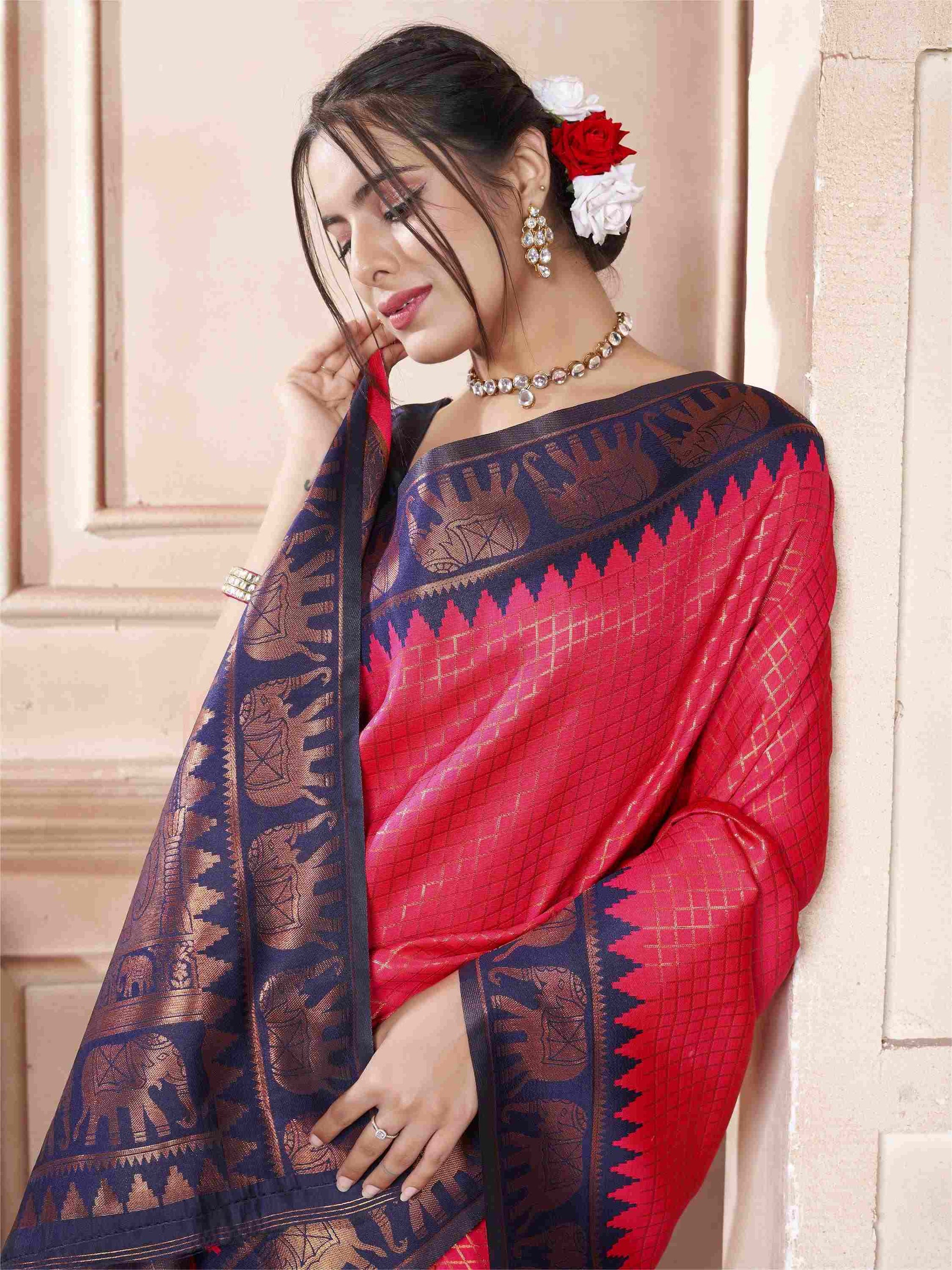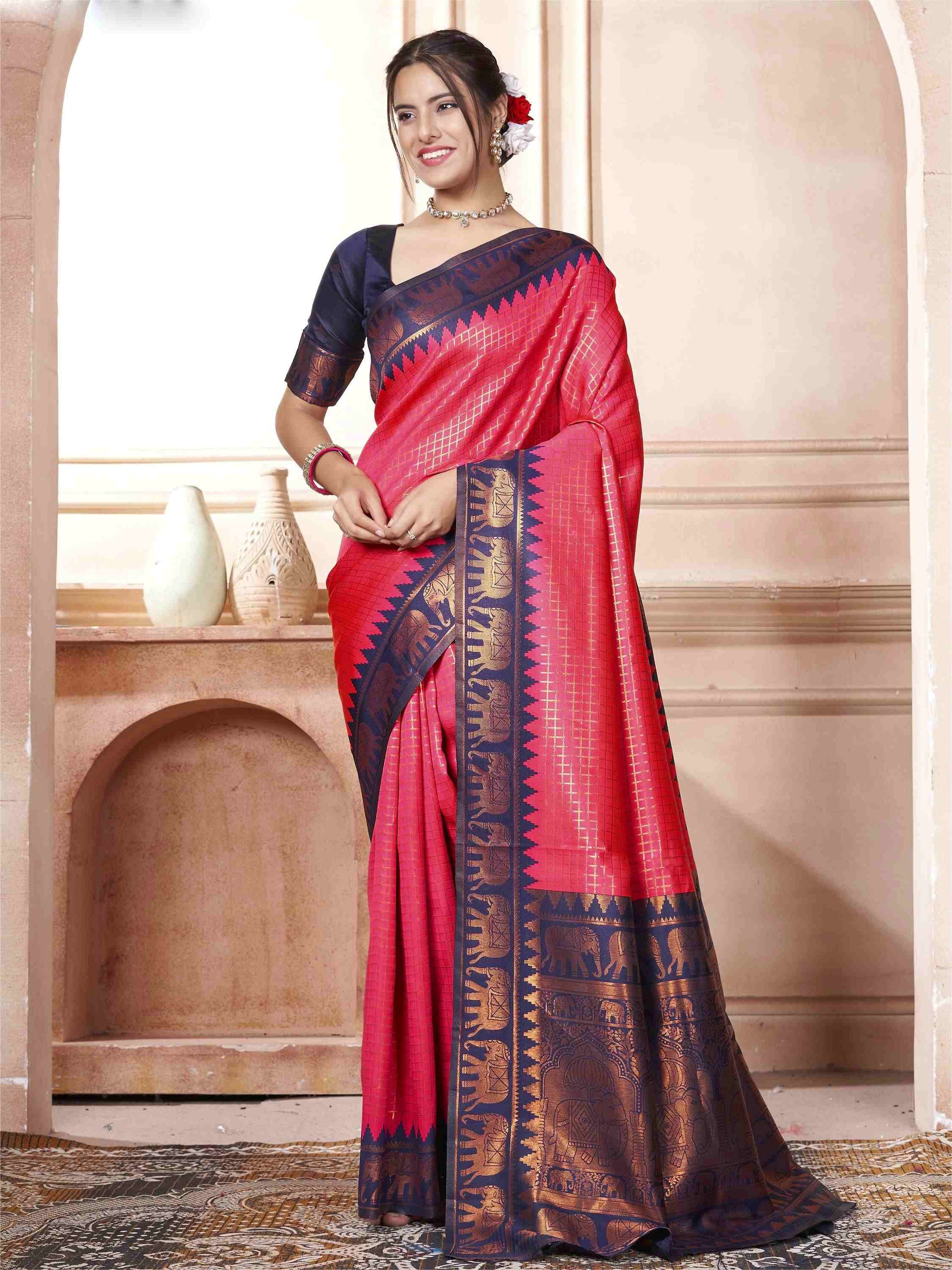 Raspberry Kanjivaram Silk Saree with Blue Border, featuring traditional ethnic motifs and rich zari weave—perfect for weddings, festivals, and party occasions.