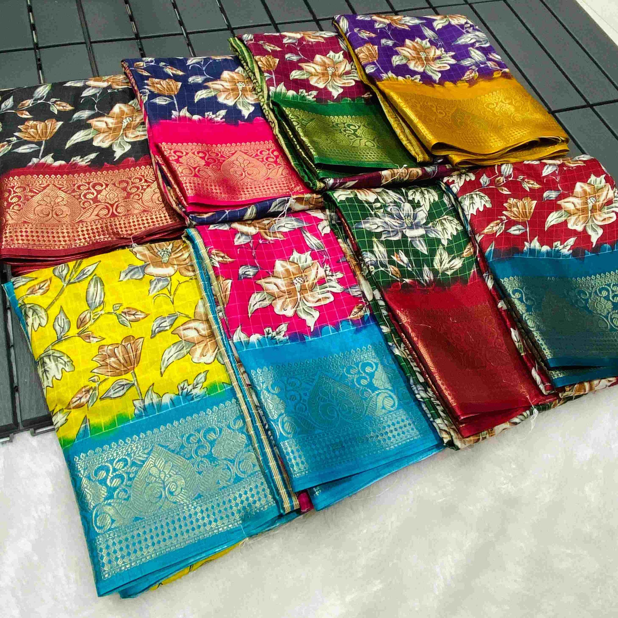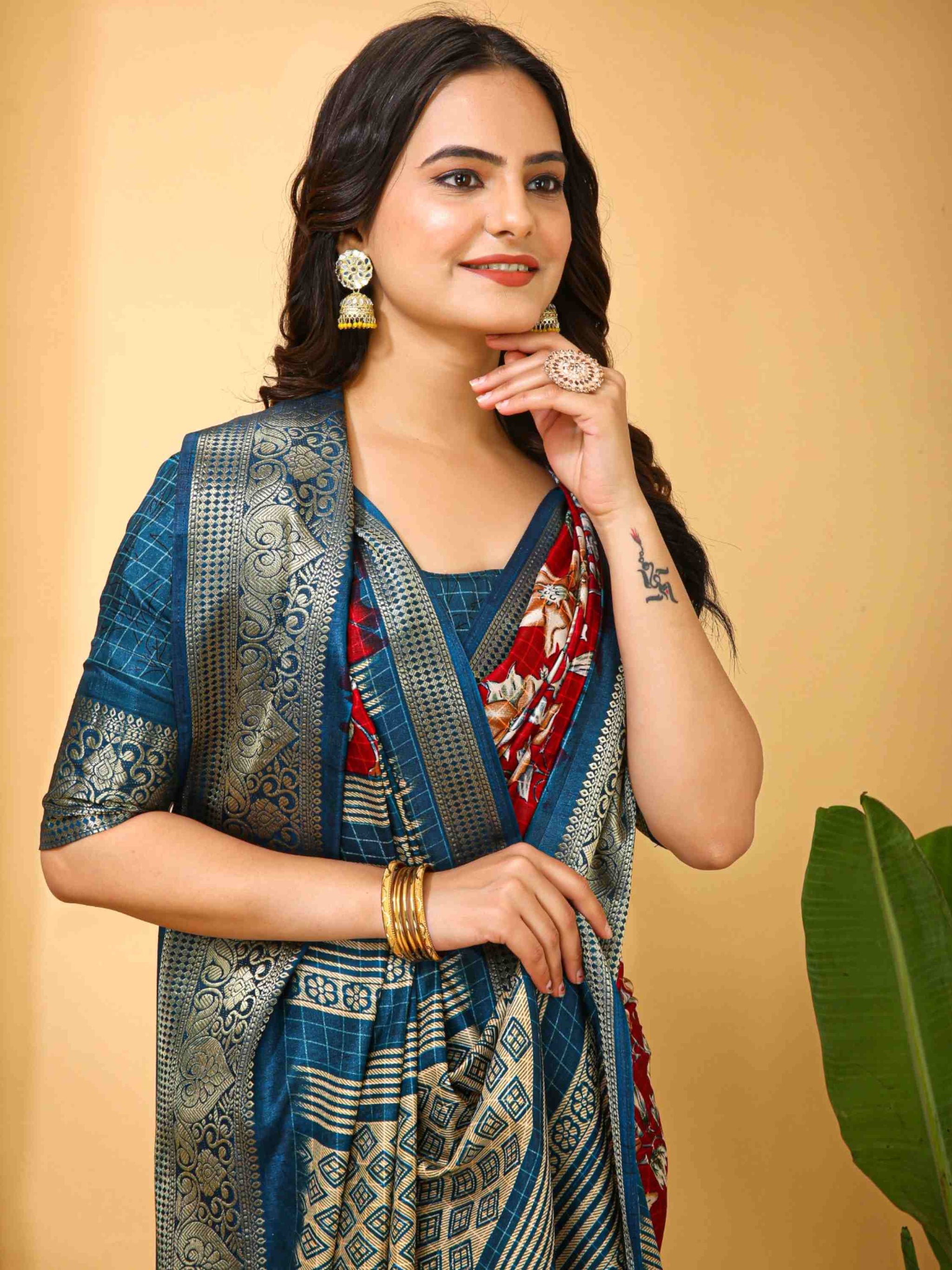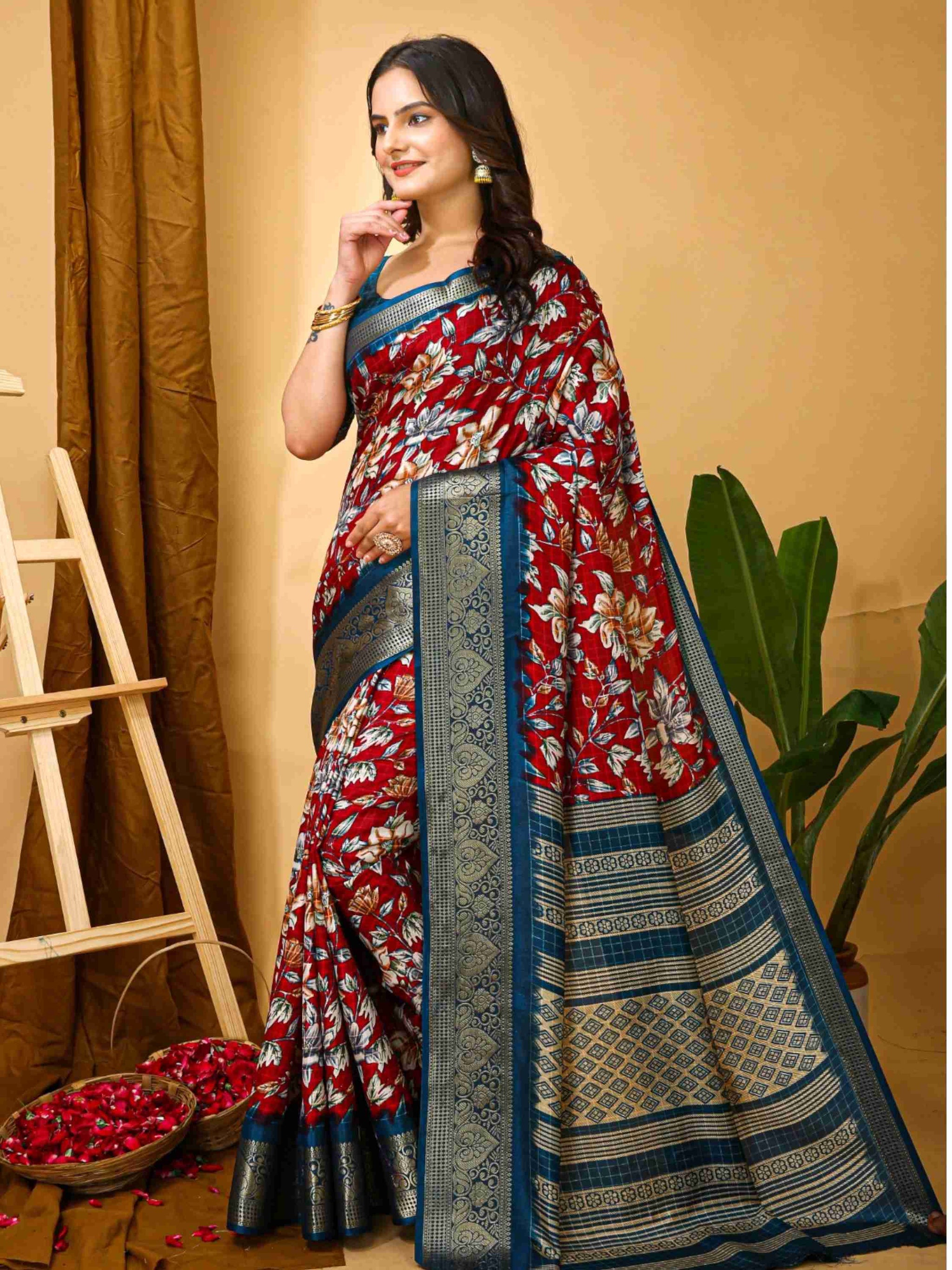 Elegant Red Dola Silk Cotton Saree with floral Kalamkari print and zari border with printed blouse piece. Perfect for weddings, festivals, and family events.