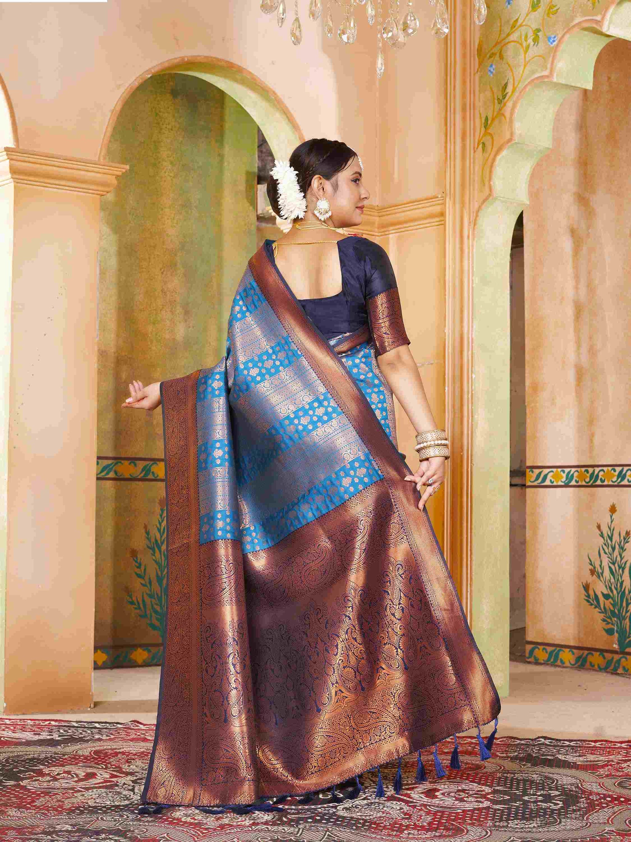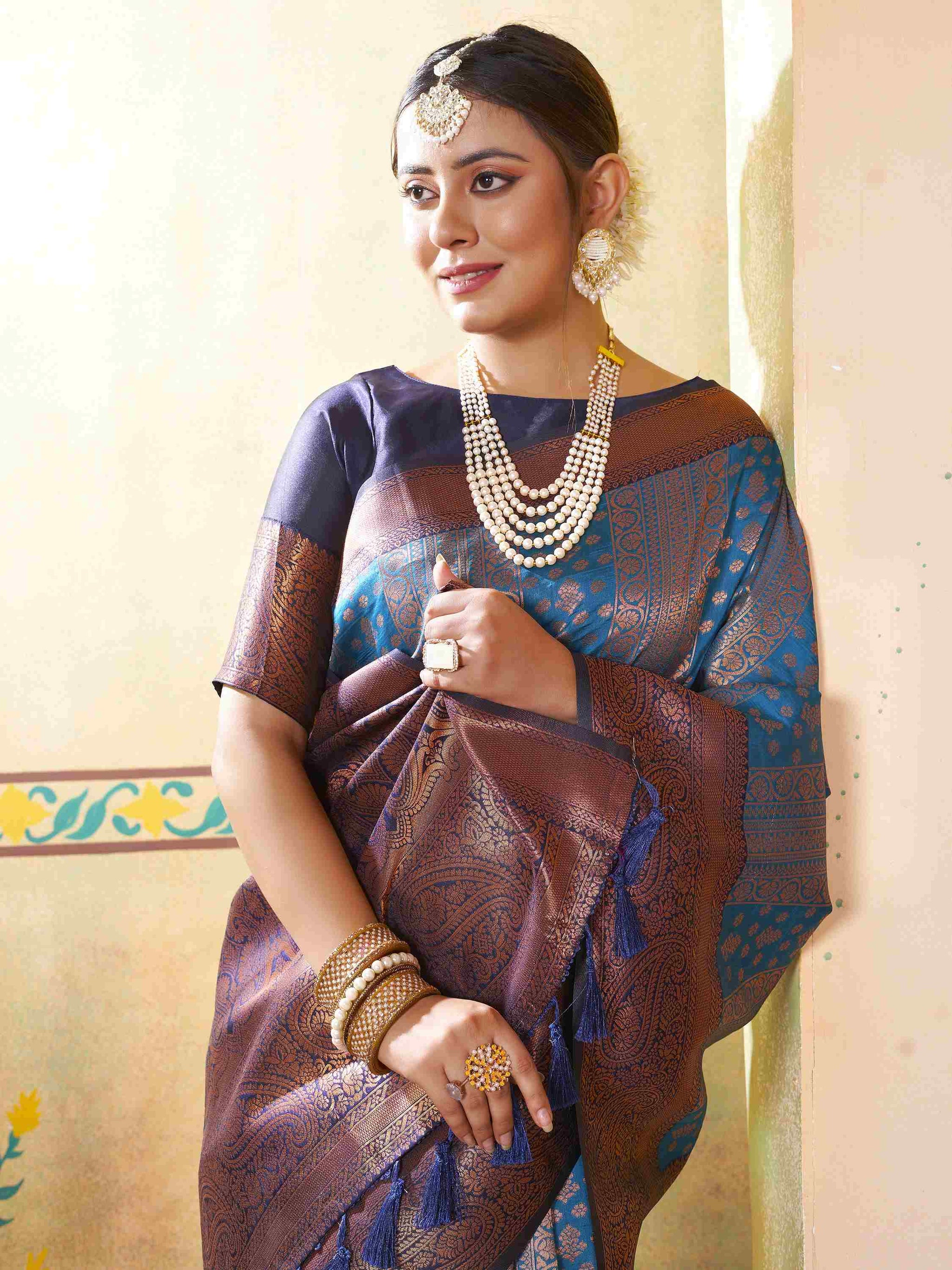 Royal Blue Kanjivaram Silk Saree featuring rich zari weave, elegant ethnic motifs, and a traditional zari border--perfect for weddings, festivals and parties.