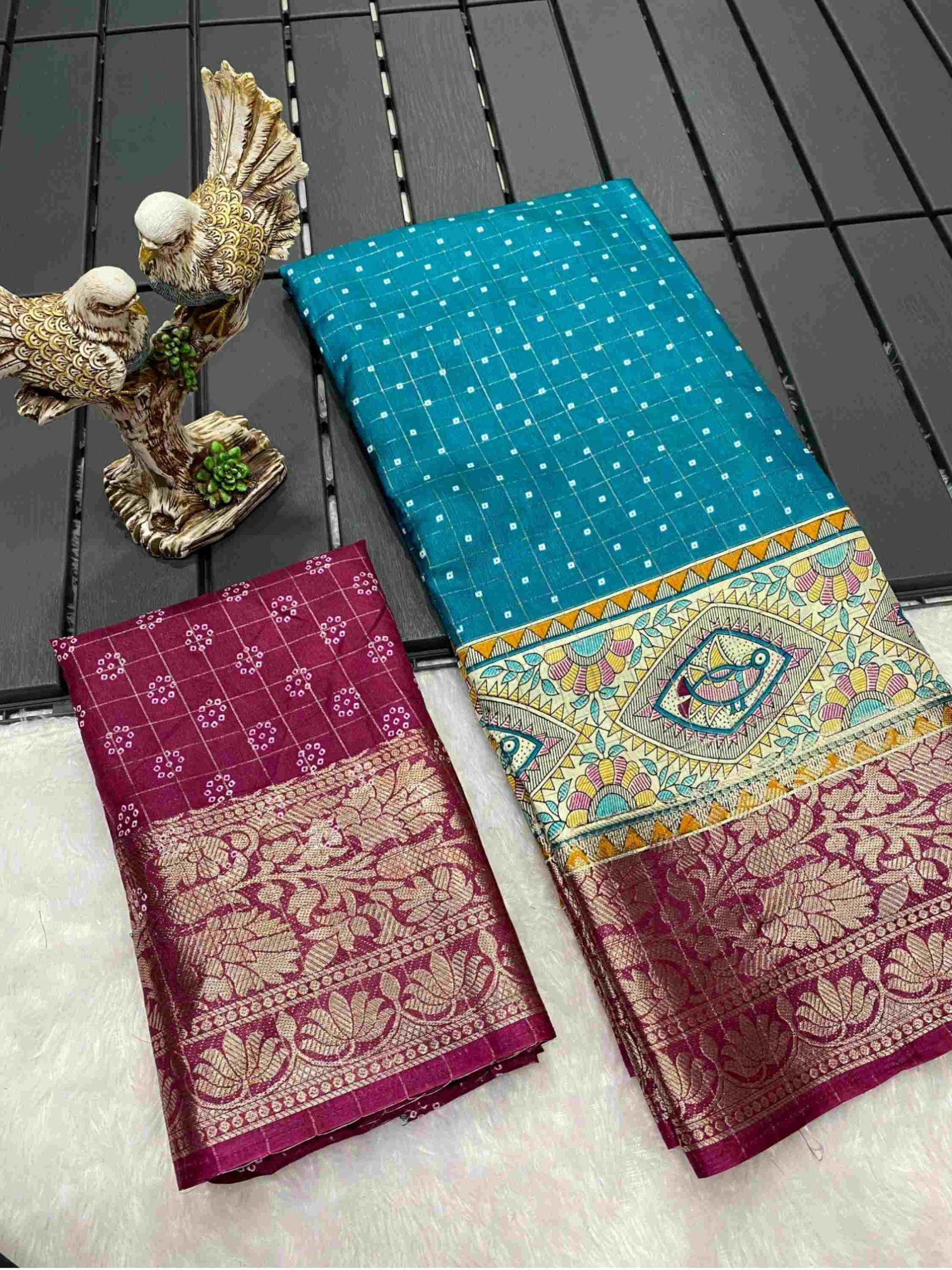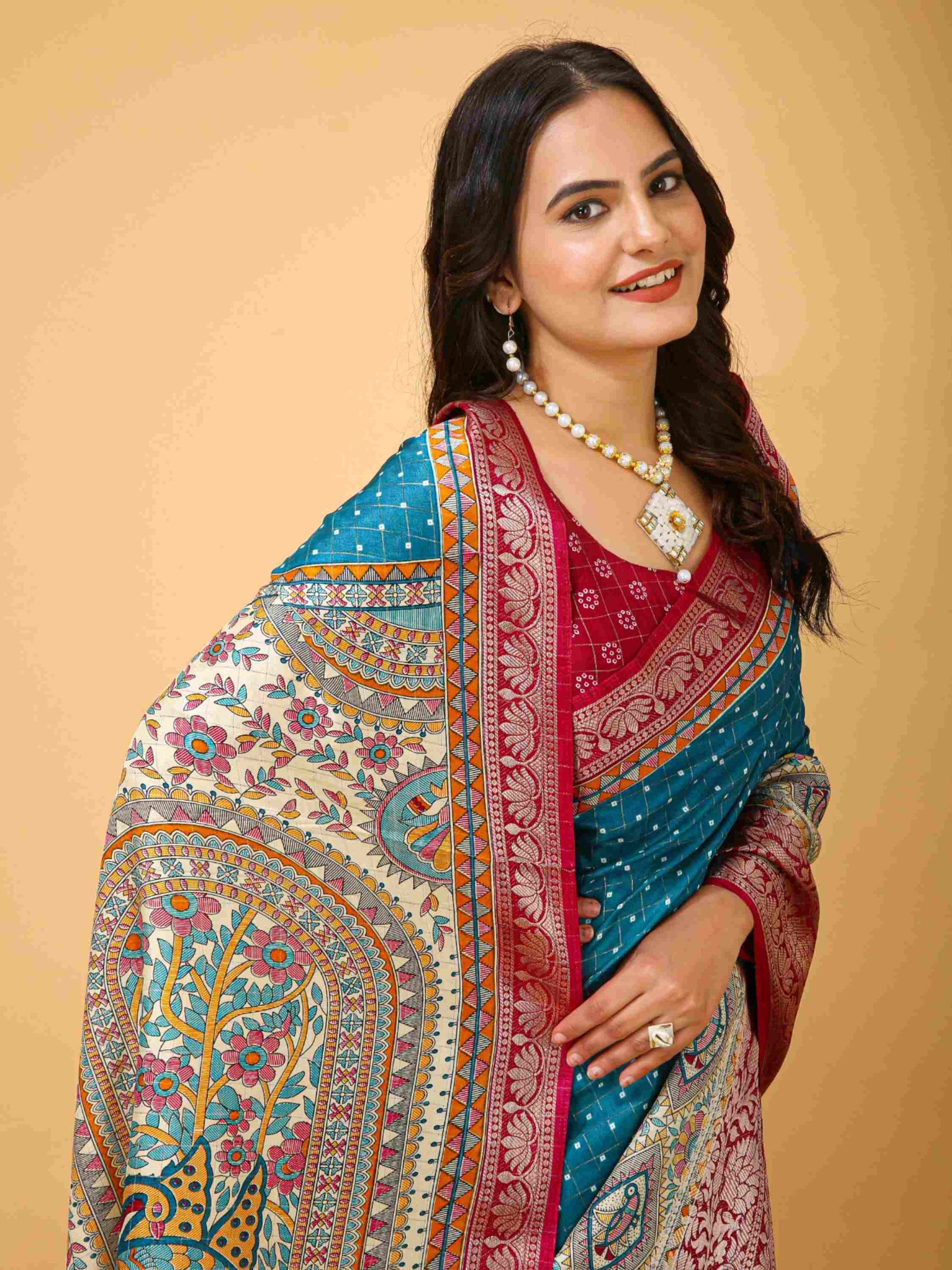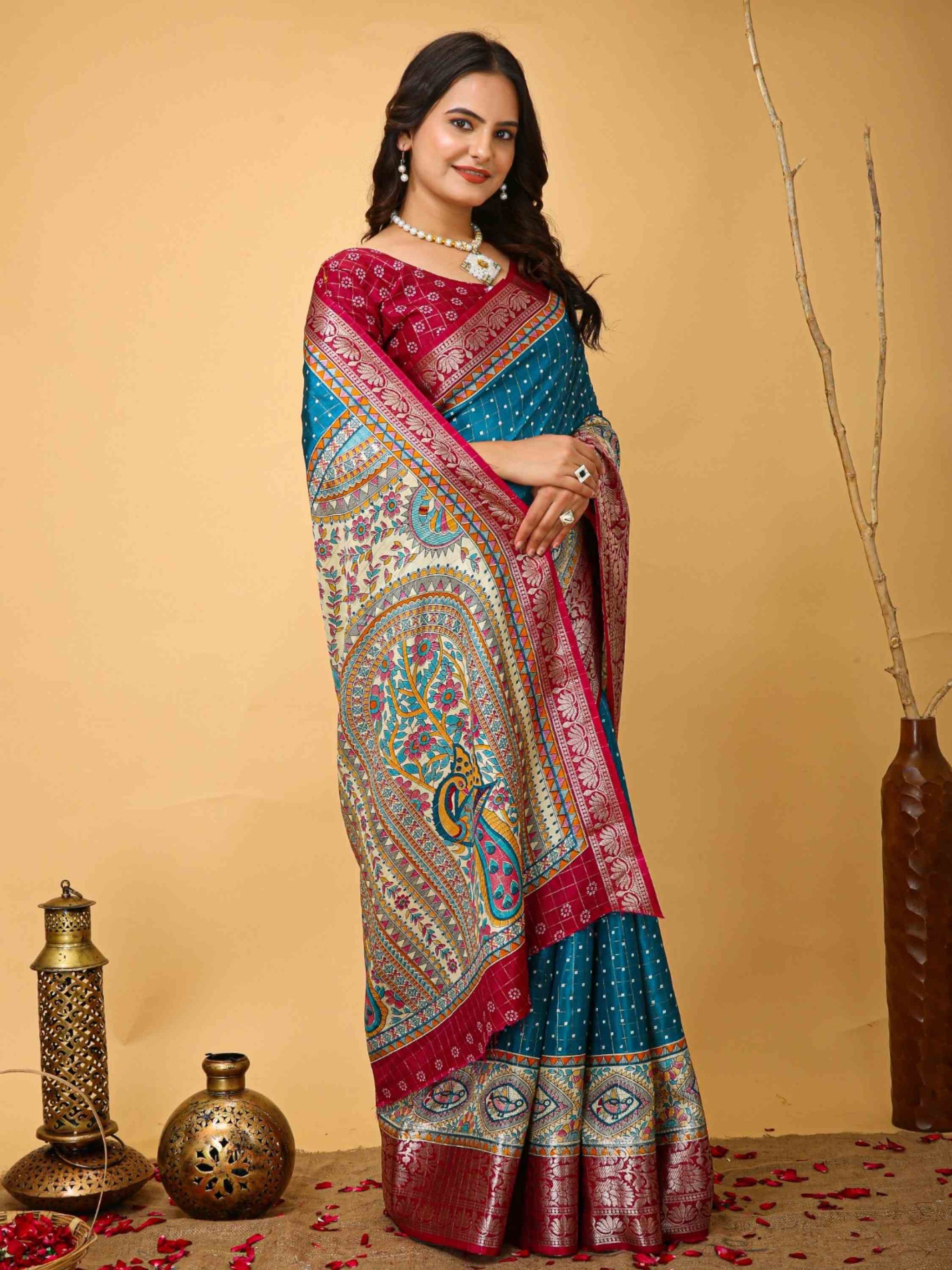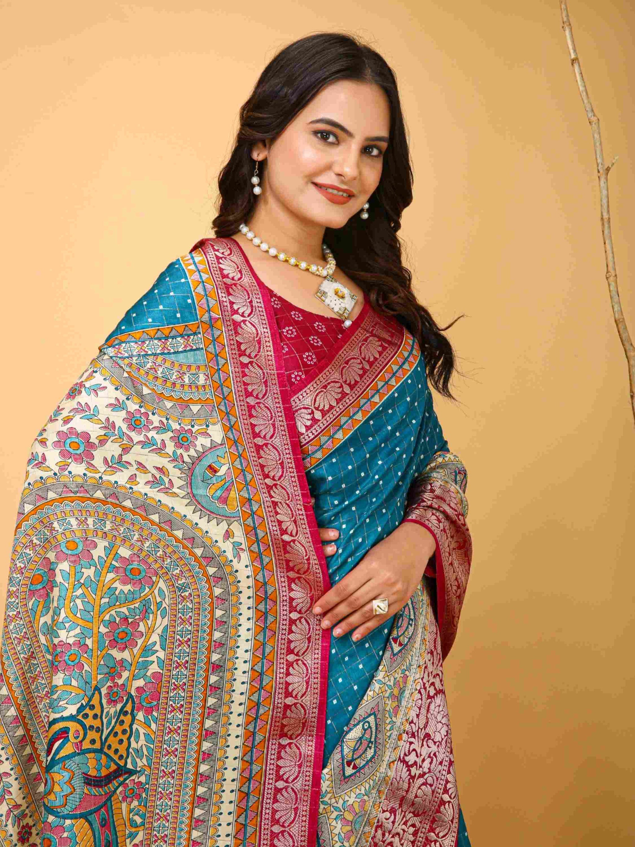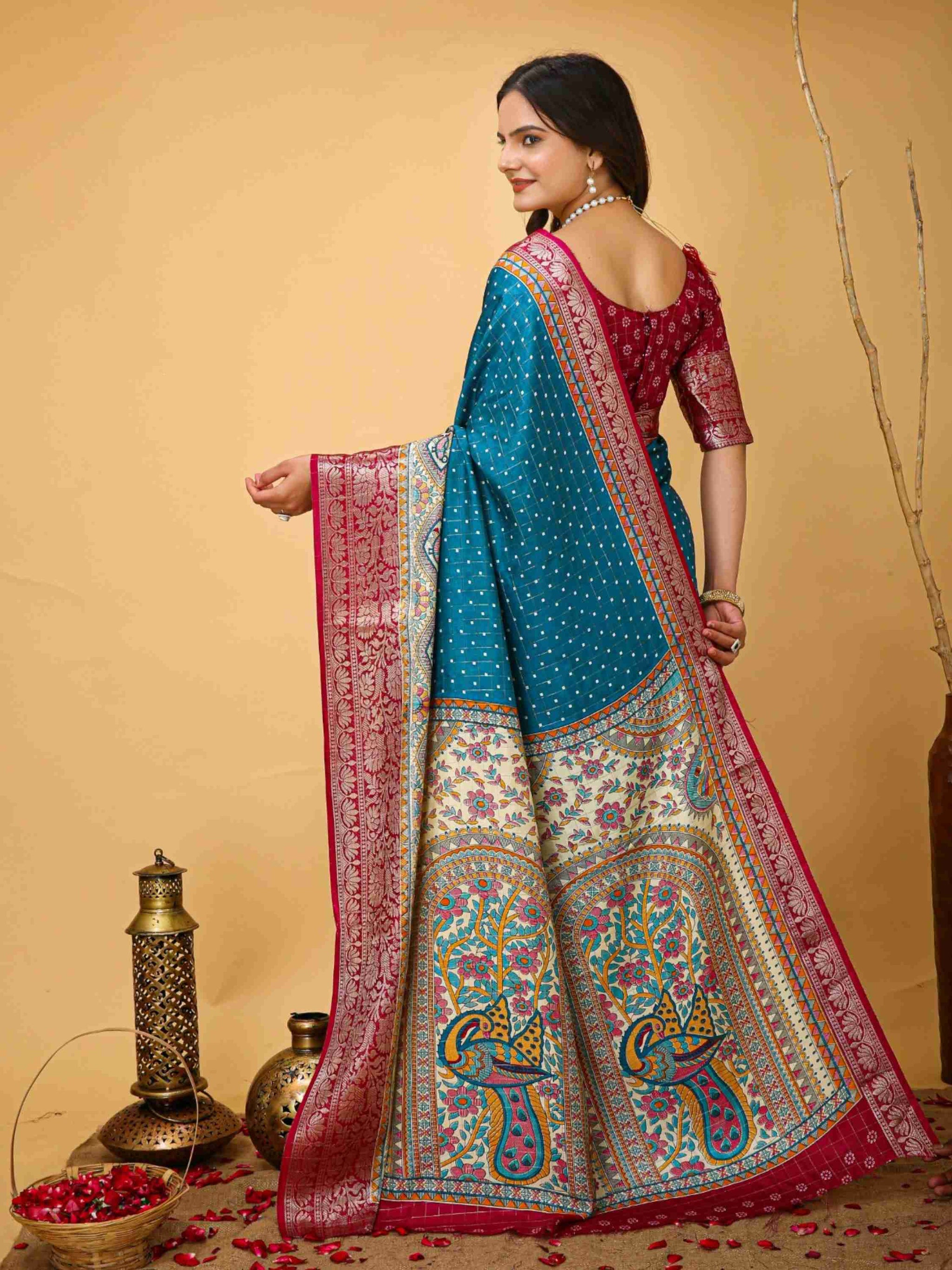 Sky Blue Dola Silk Cotton Saree with Kalamkari print, zari checks and zari border is ideal for festivals, weddings, poojas, office events and family gatherings.