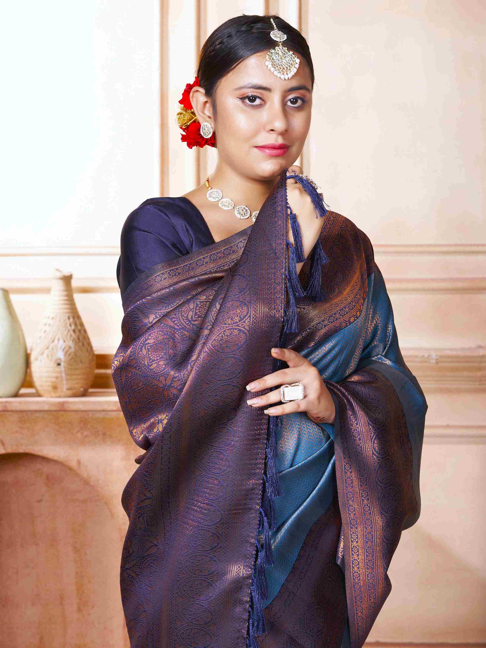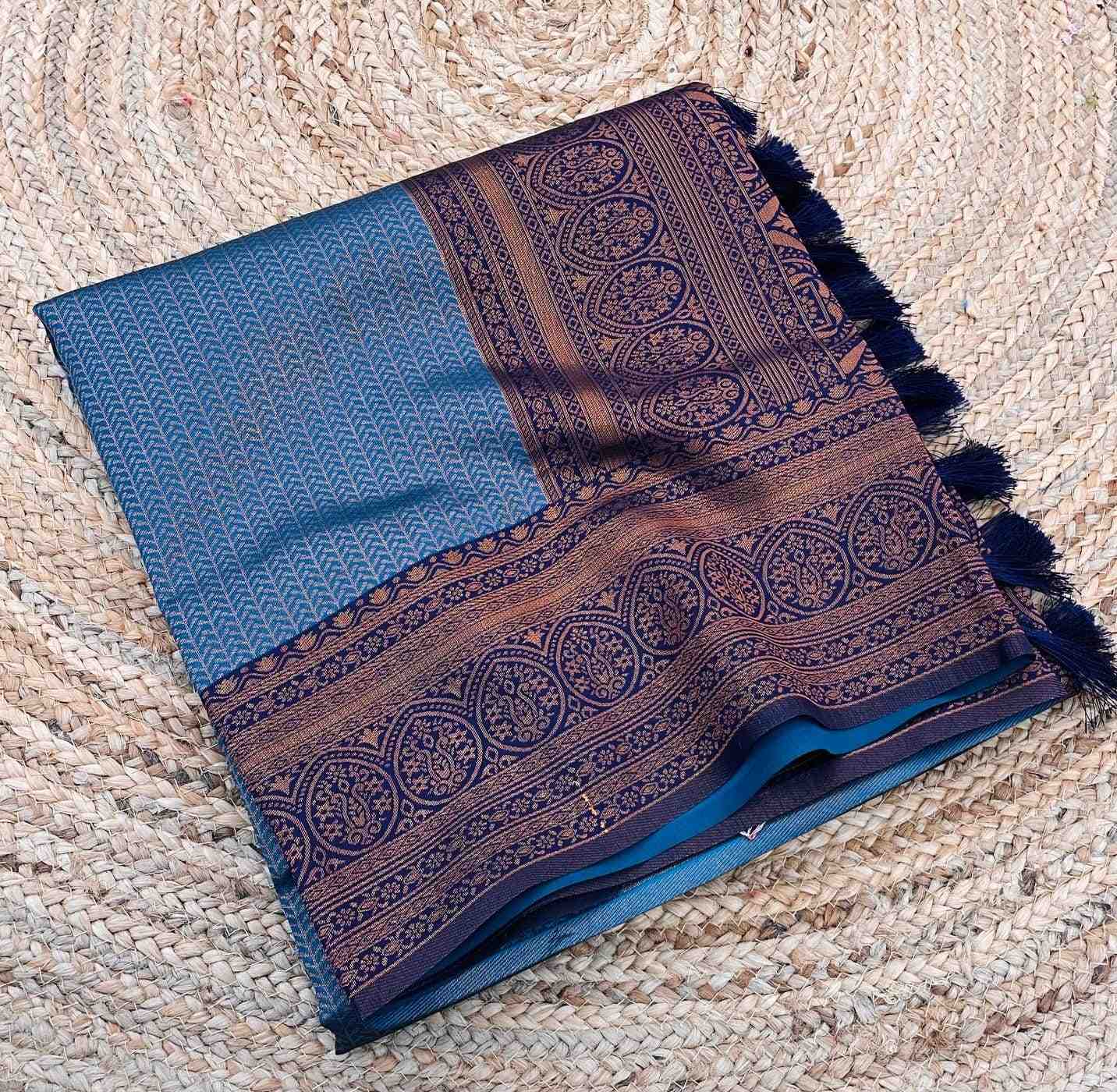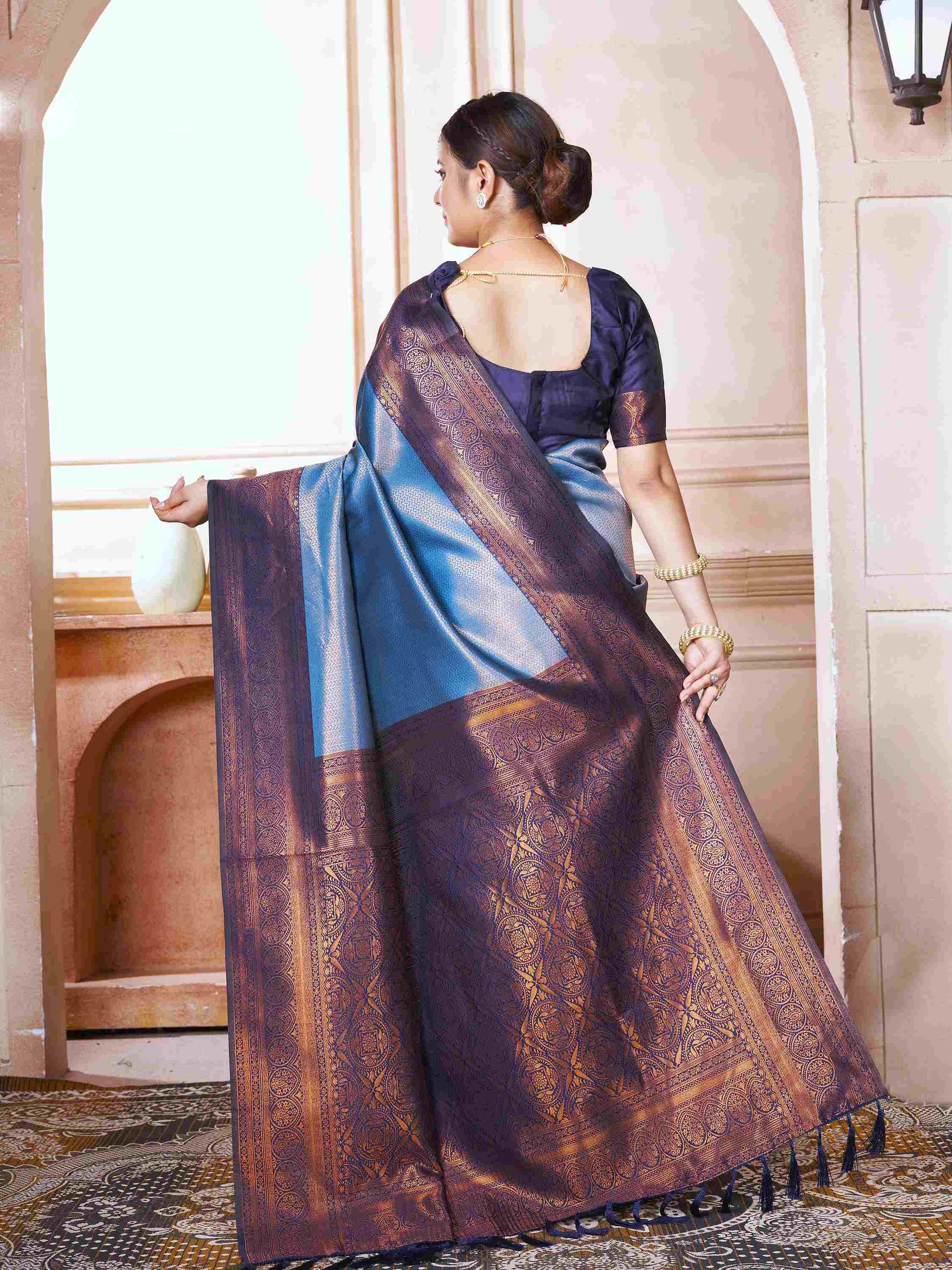 Sky Blue Kanchipuram Silk Saree has navy blue border, Kubera pattu, and blouse piece. This Kanjivaram saree is perfect for festivals, wedding, party, etc.