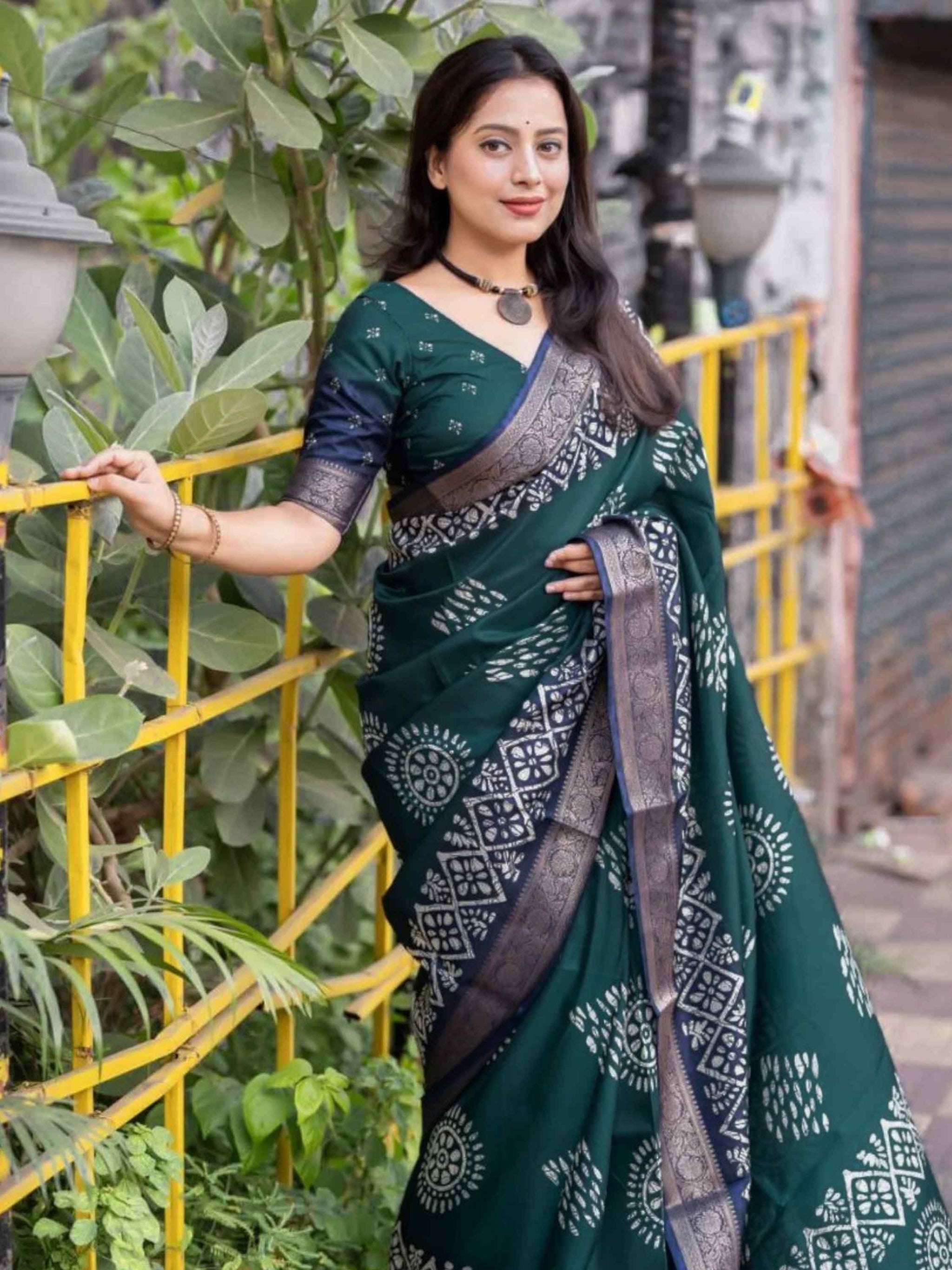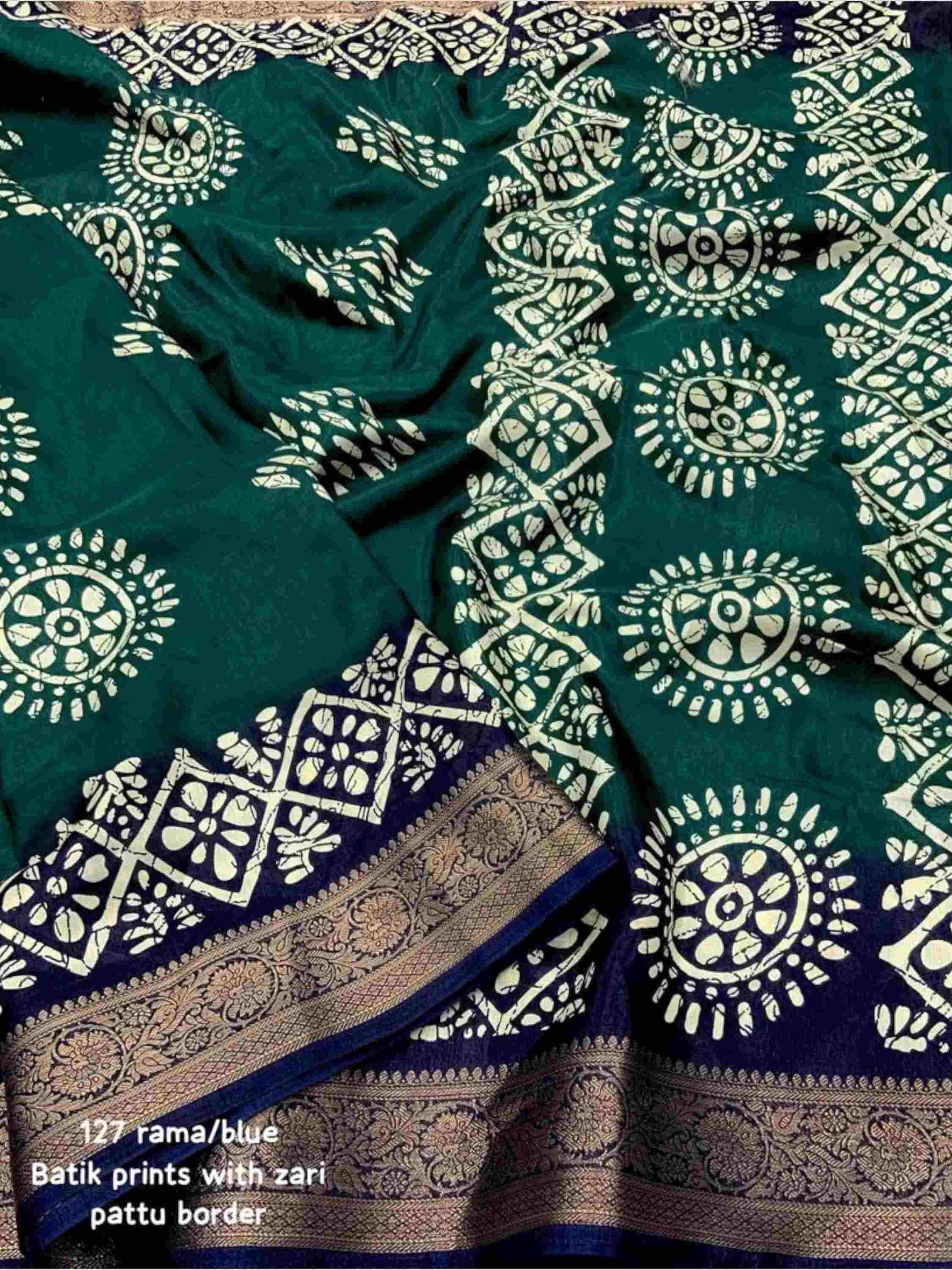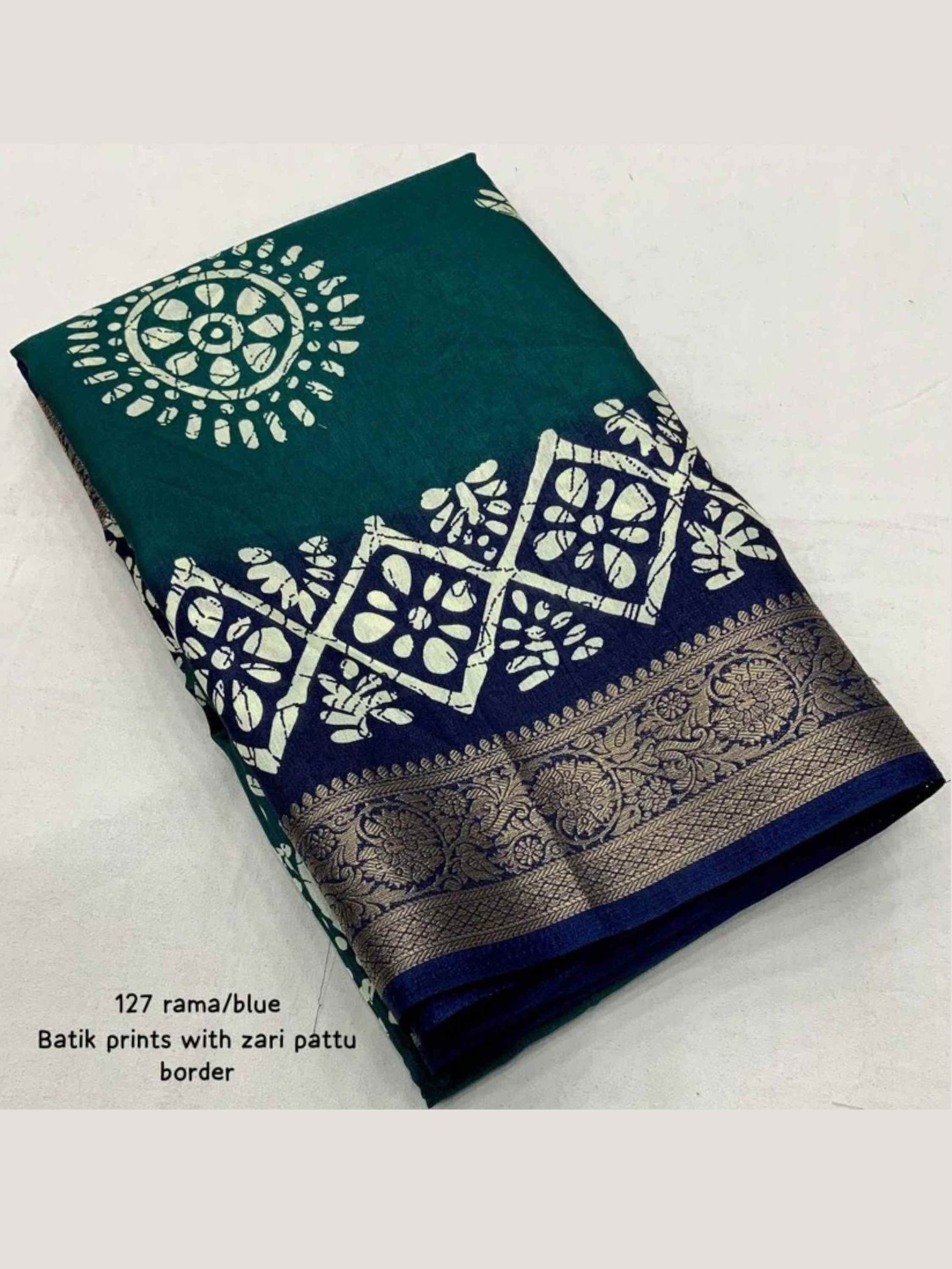 Teal Blue Dola Silk Cotton Saree featuring all-over Batik print and shimmering zari border. Soft, breathable - Ideal for festivals, summer, or daily wear.
