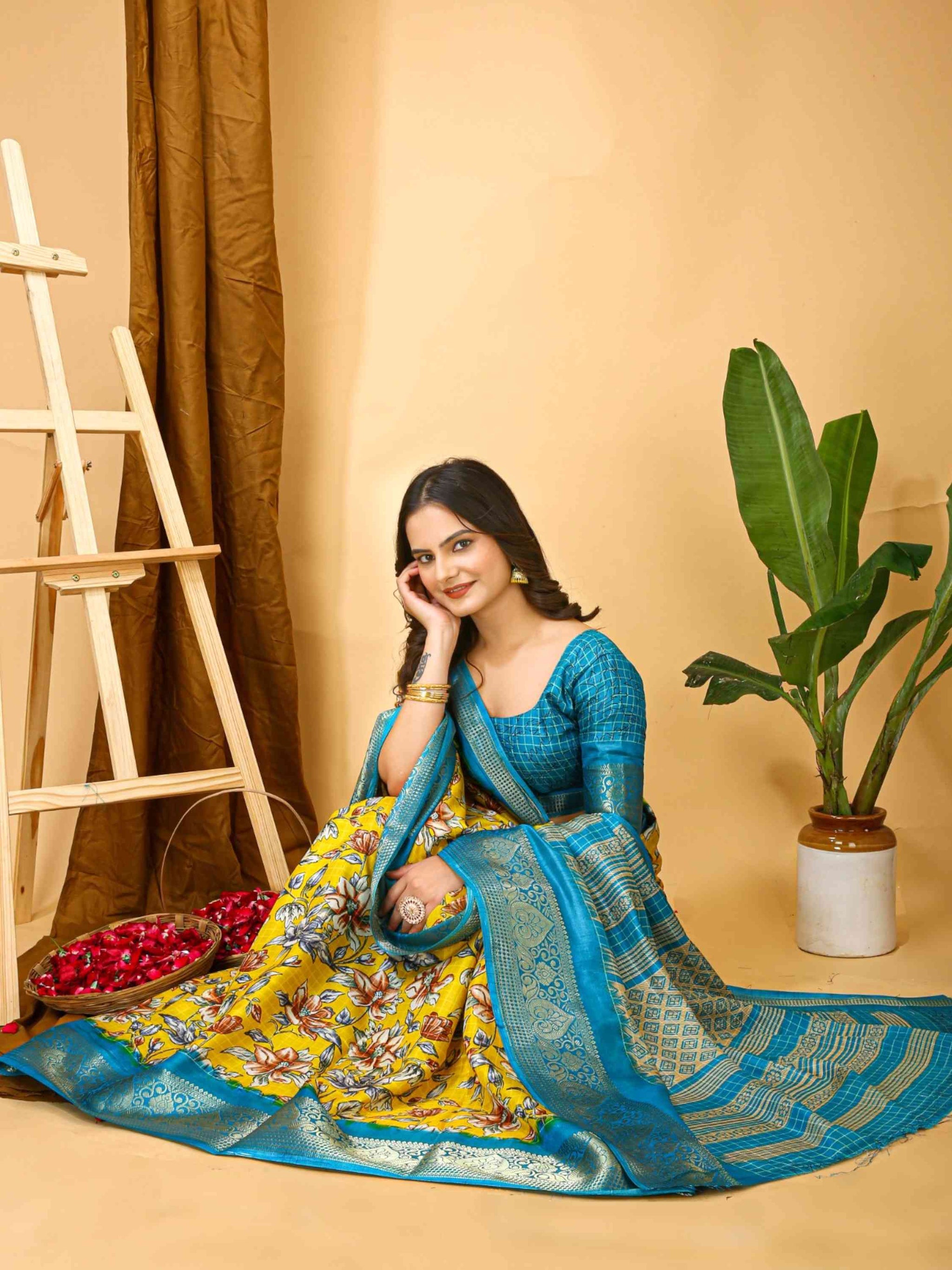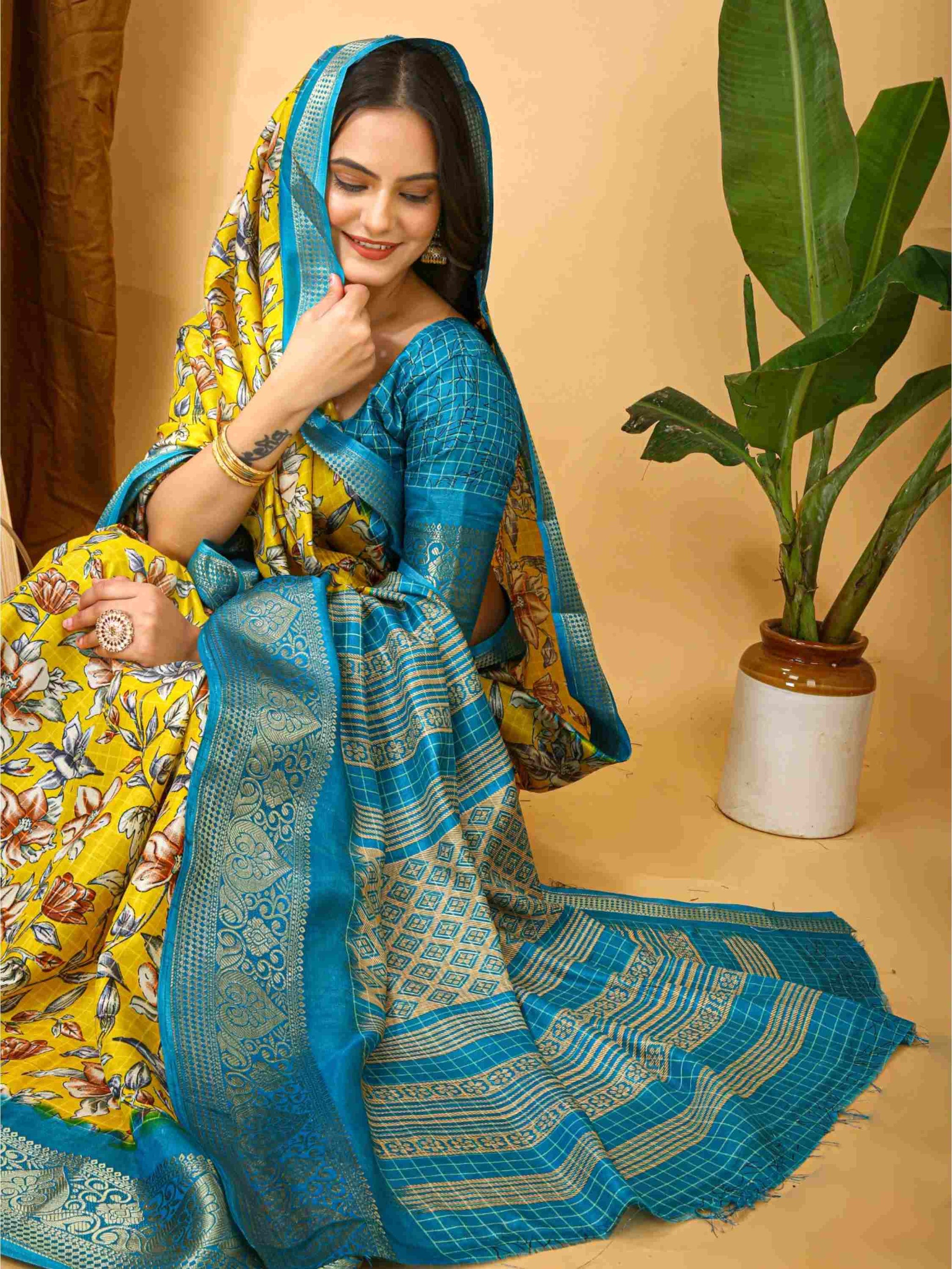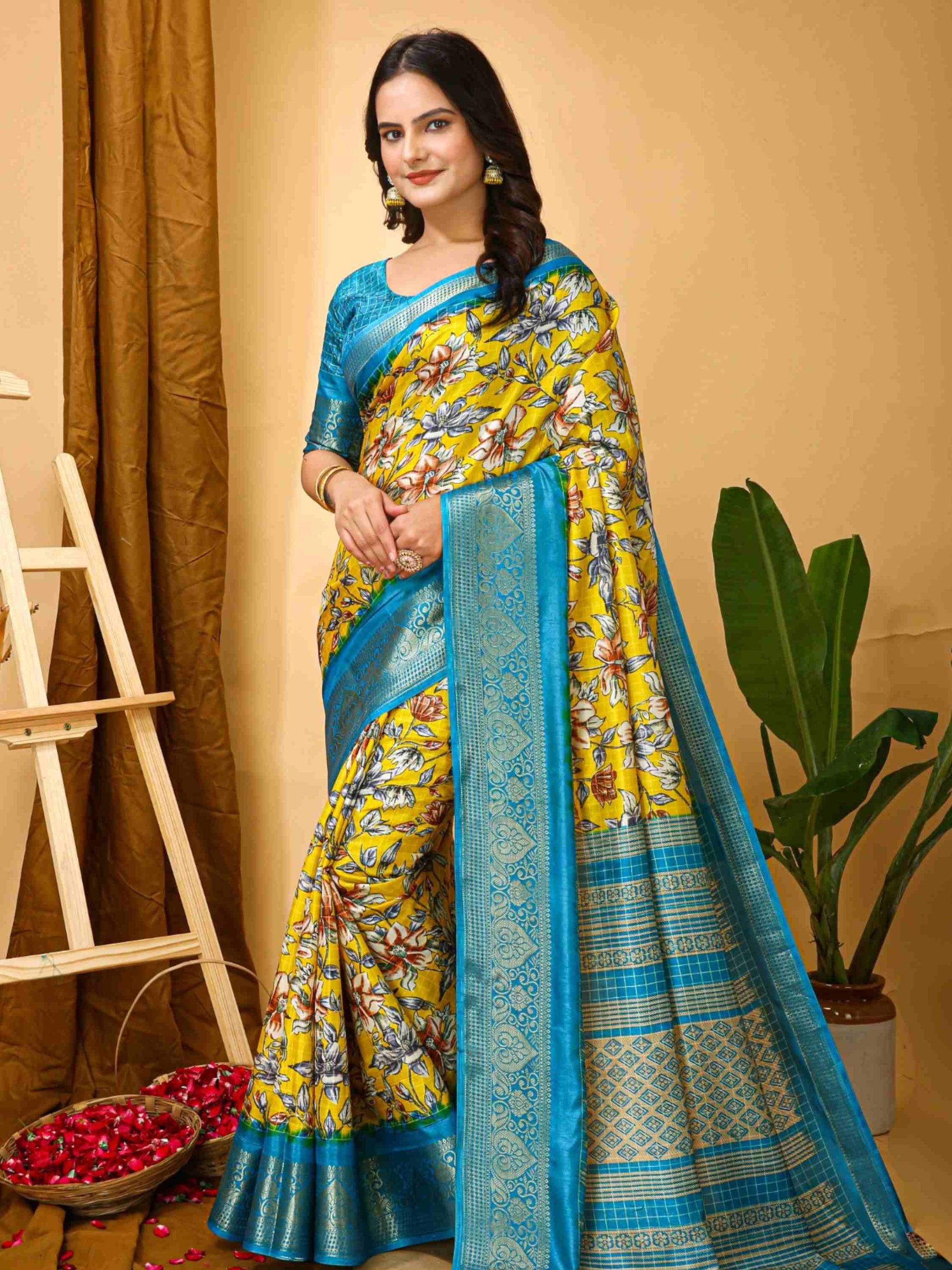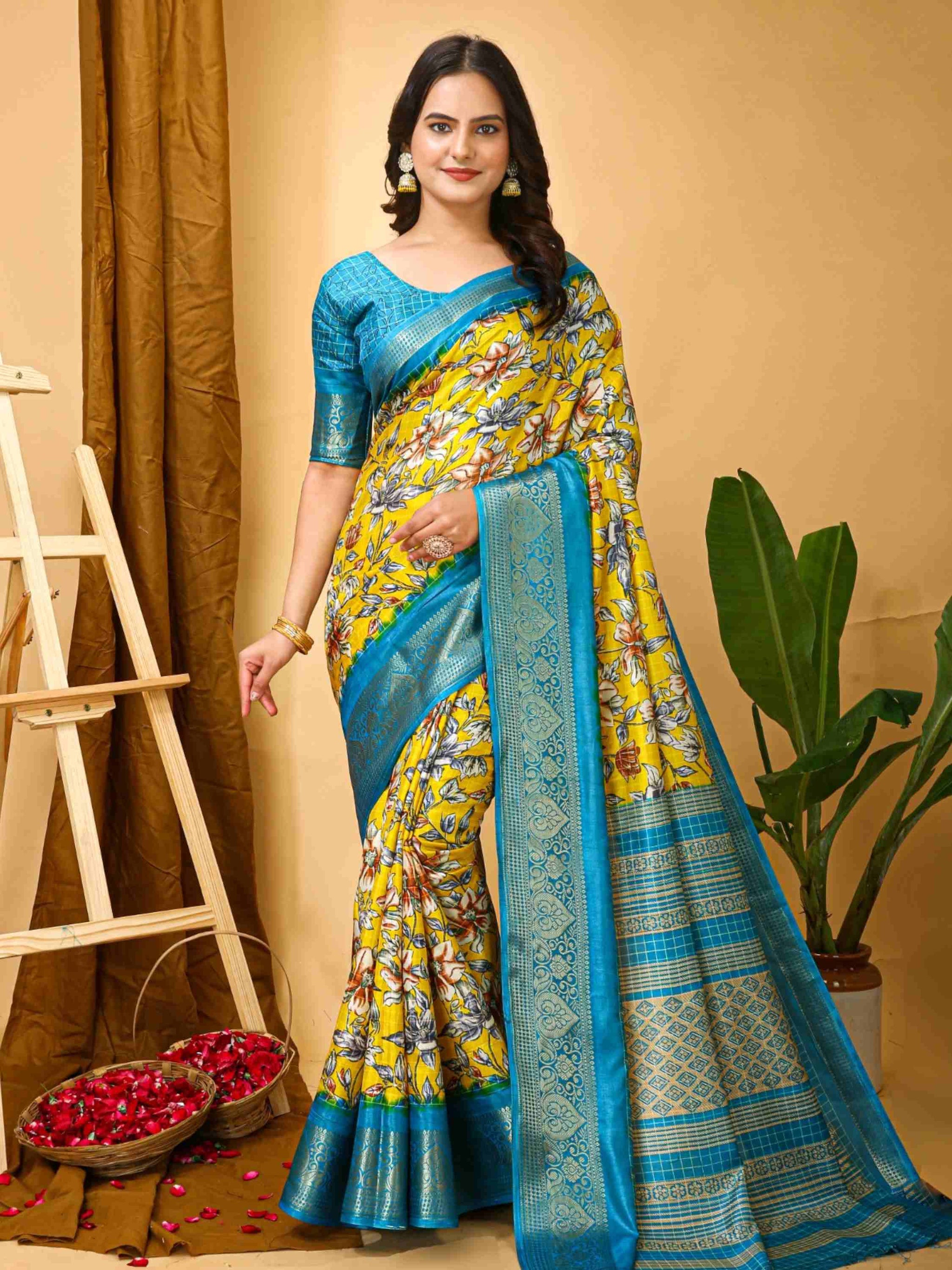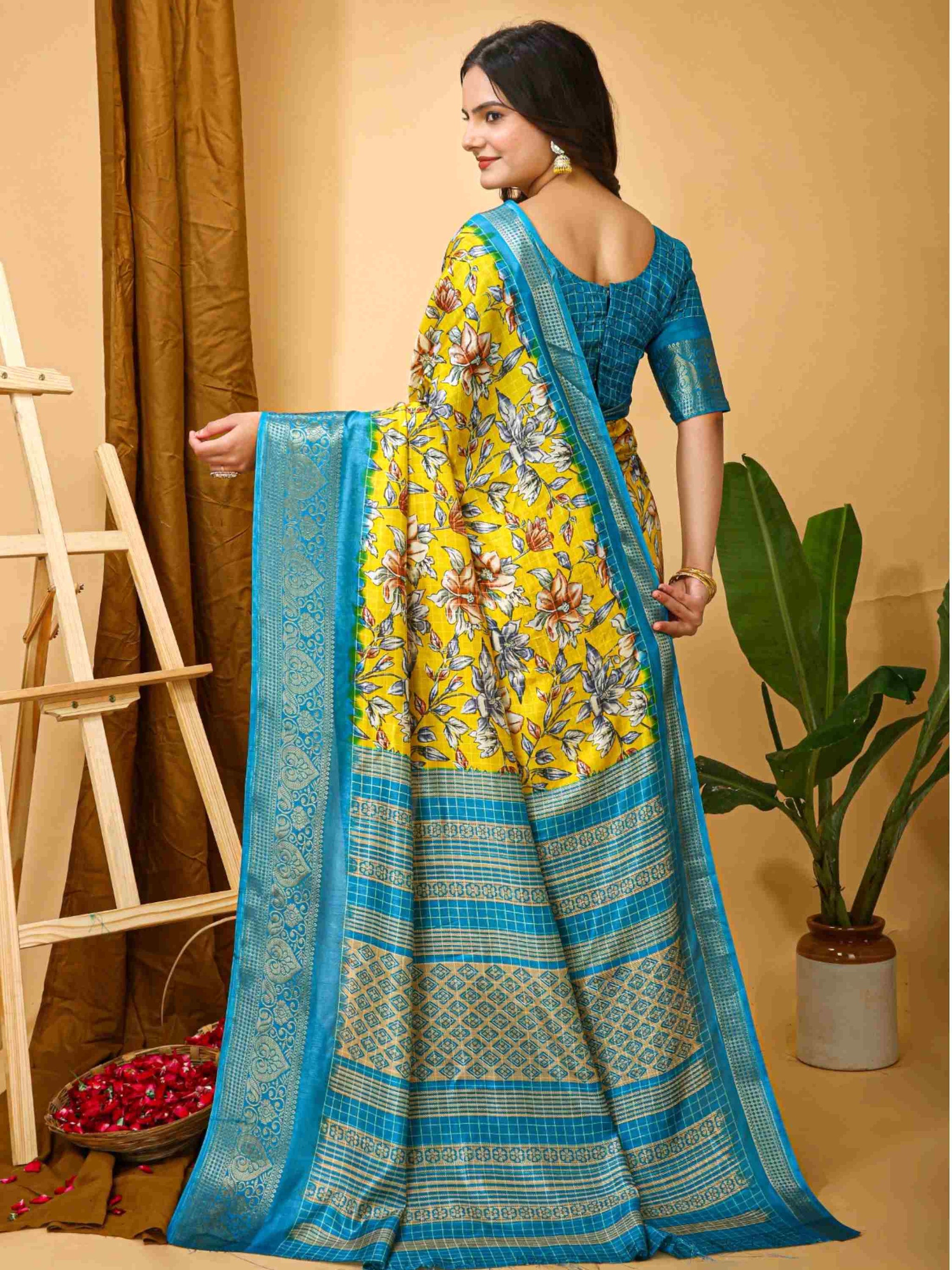 Elegant Yellow Dola Silk Cotton Saree with floral Kalamkari print and zari border with printed blouse piece. Perfect for weddings, festivals, and family events.