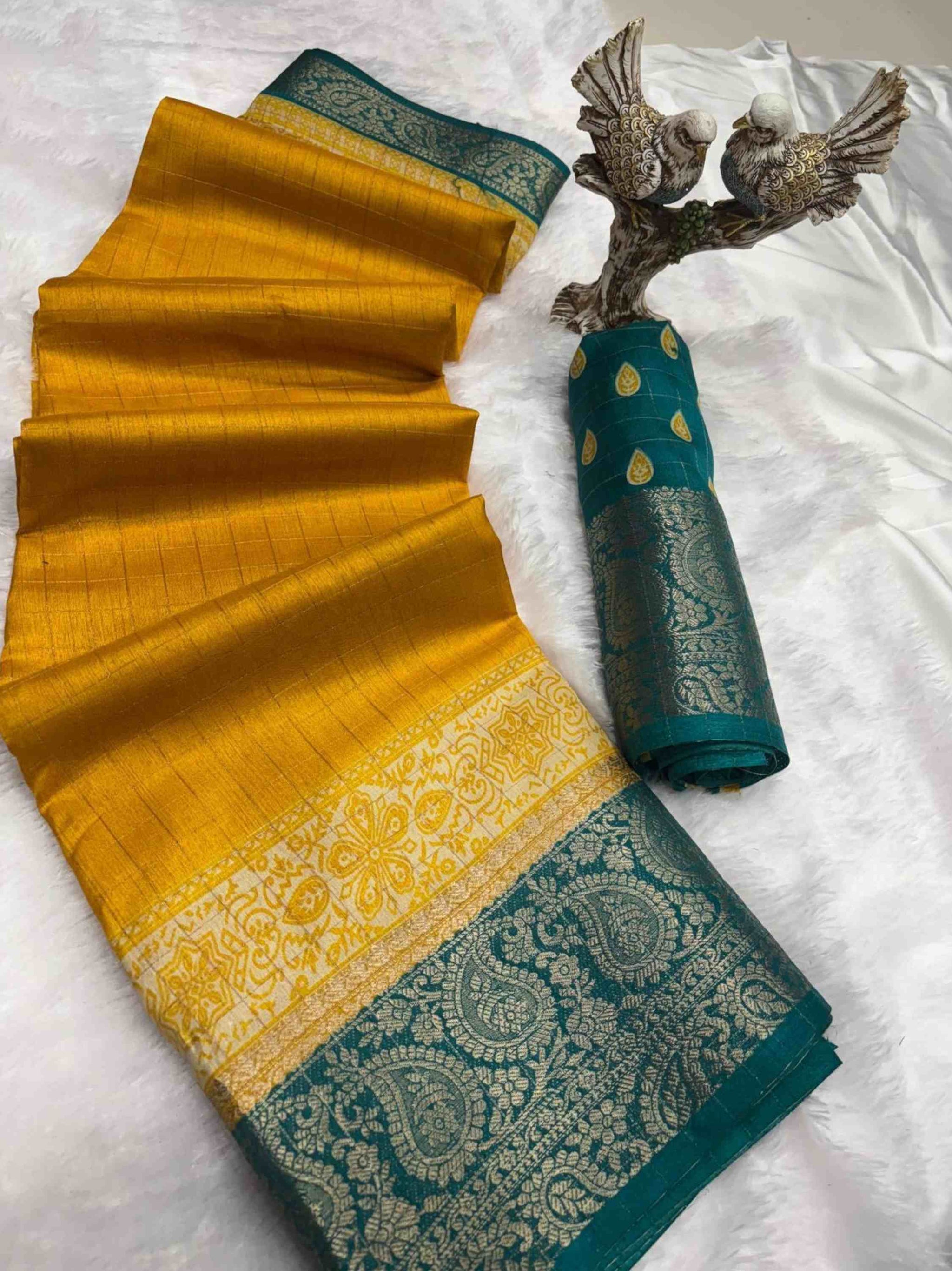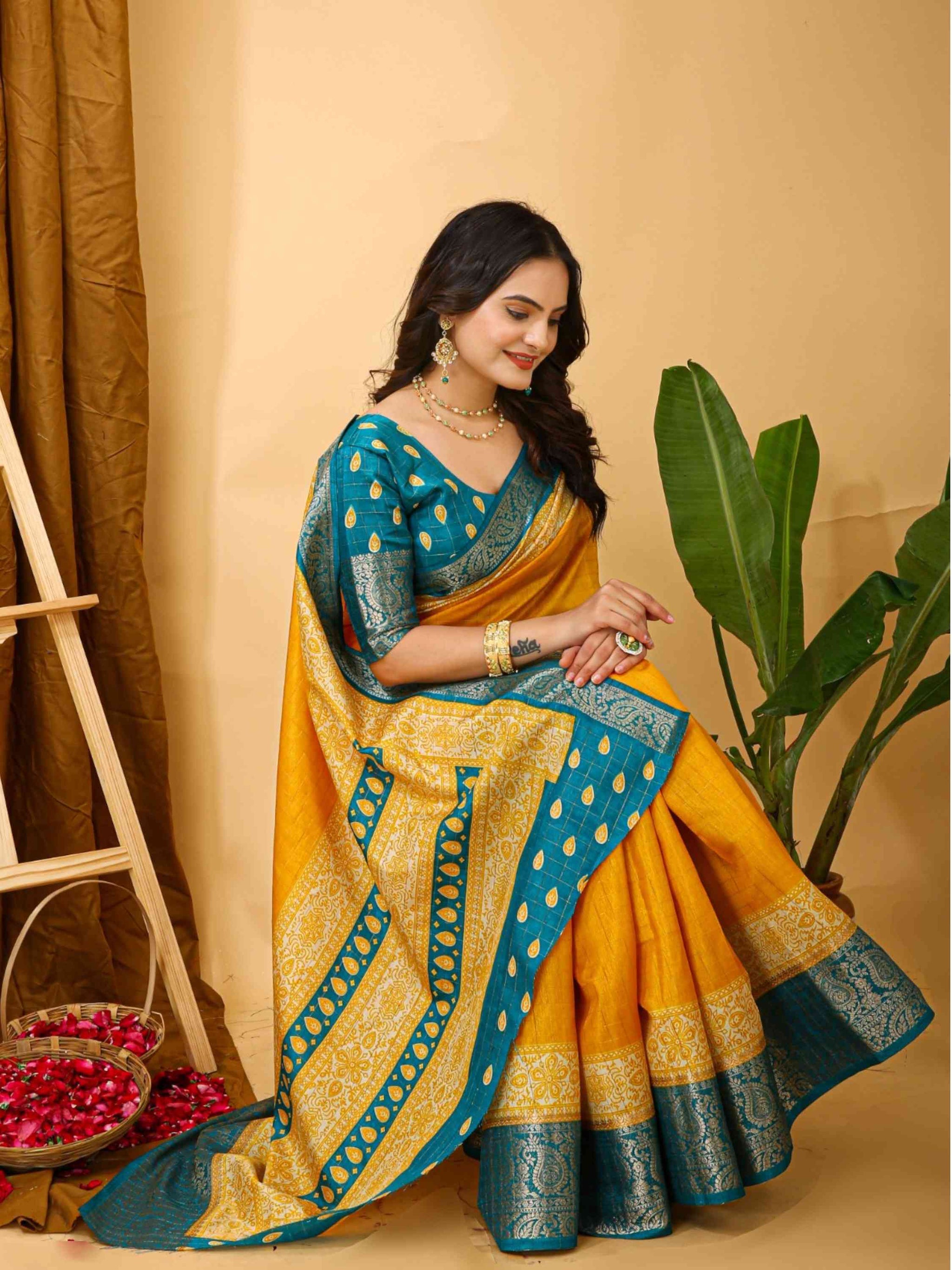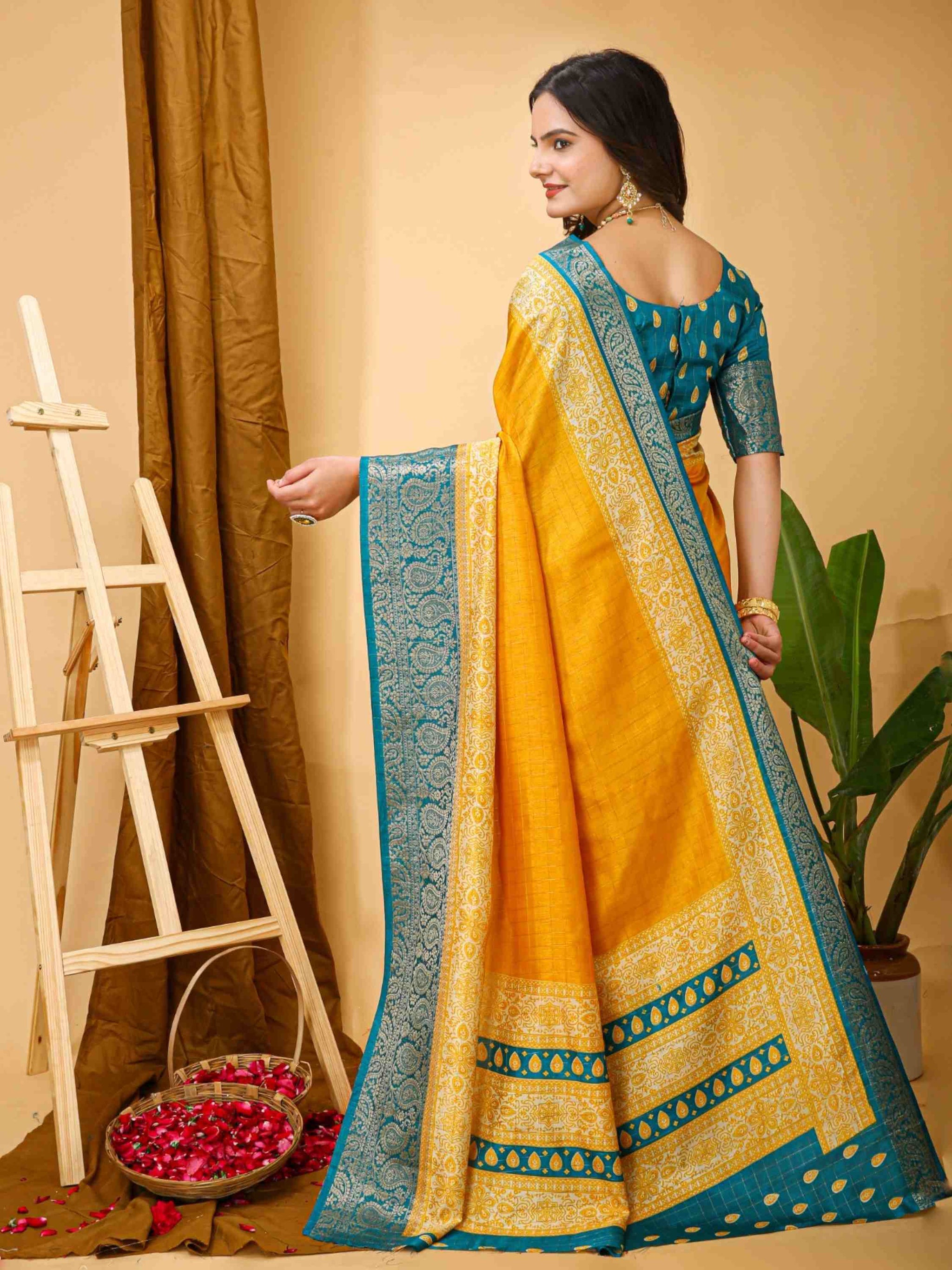 Yellow Dola Silk Cotton Saree with woven zari checks Kalamkari print & zari border. Ideal for festivals, weddings, poojas, office events & family gatherings.