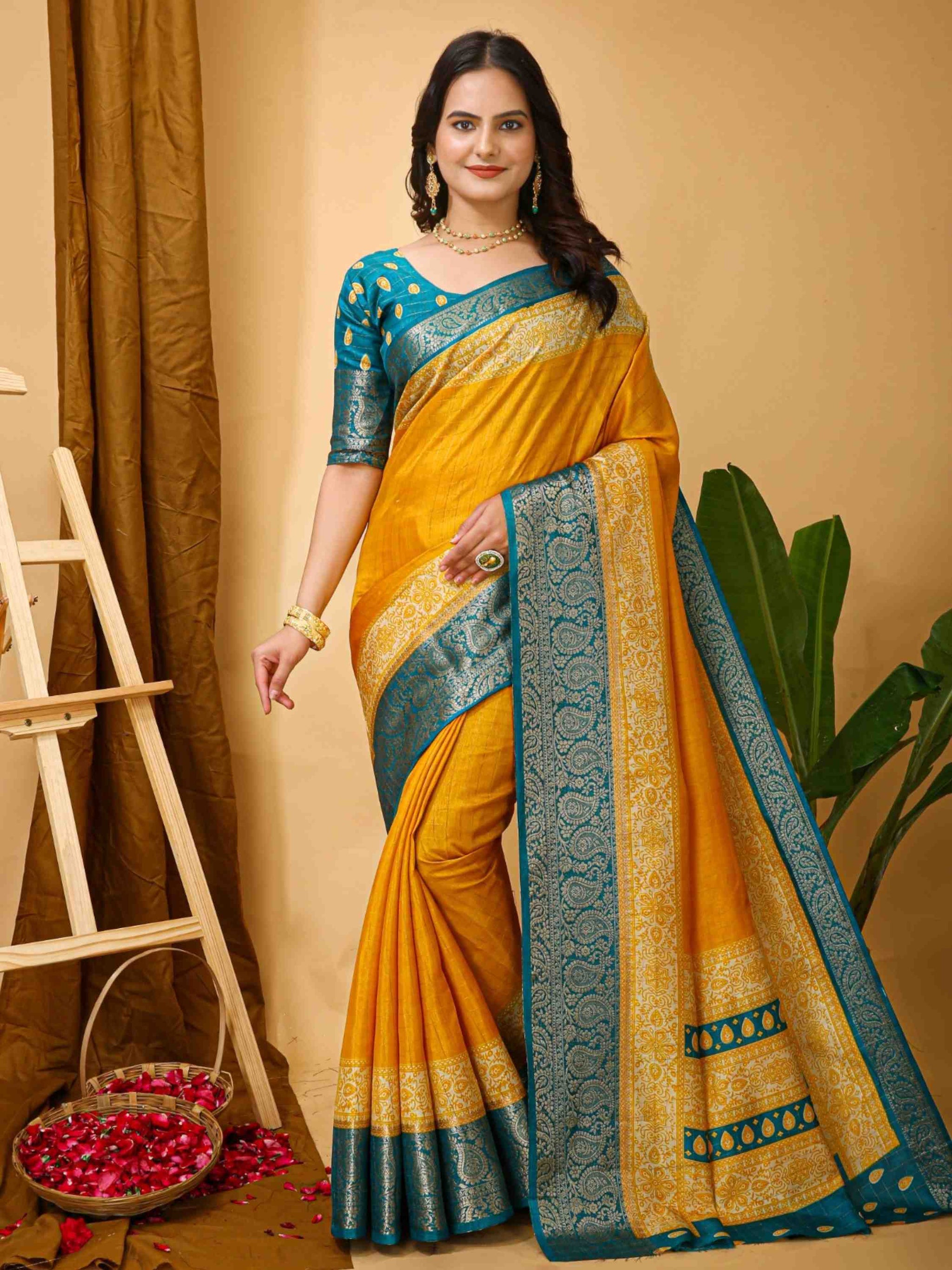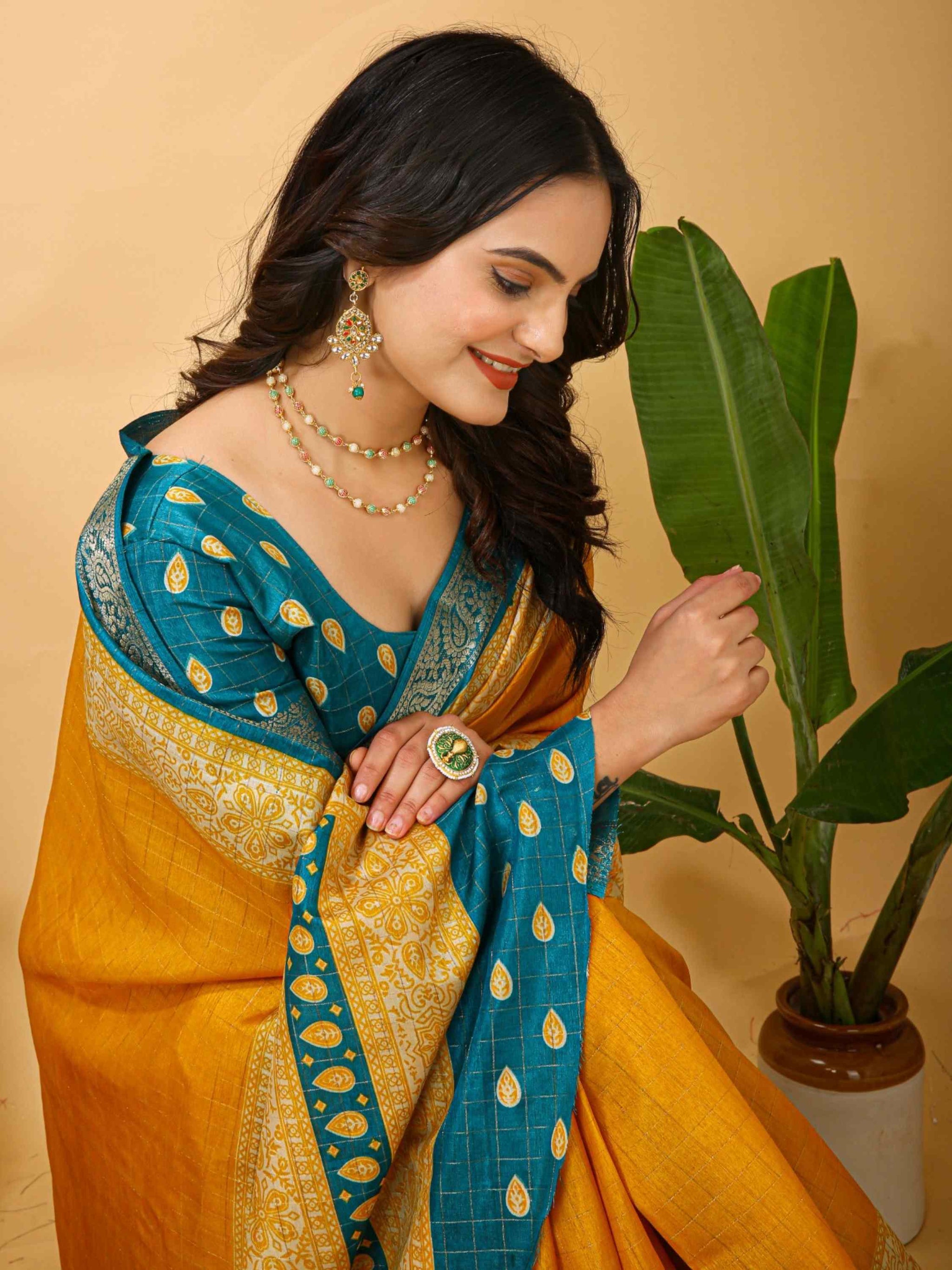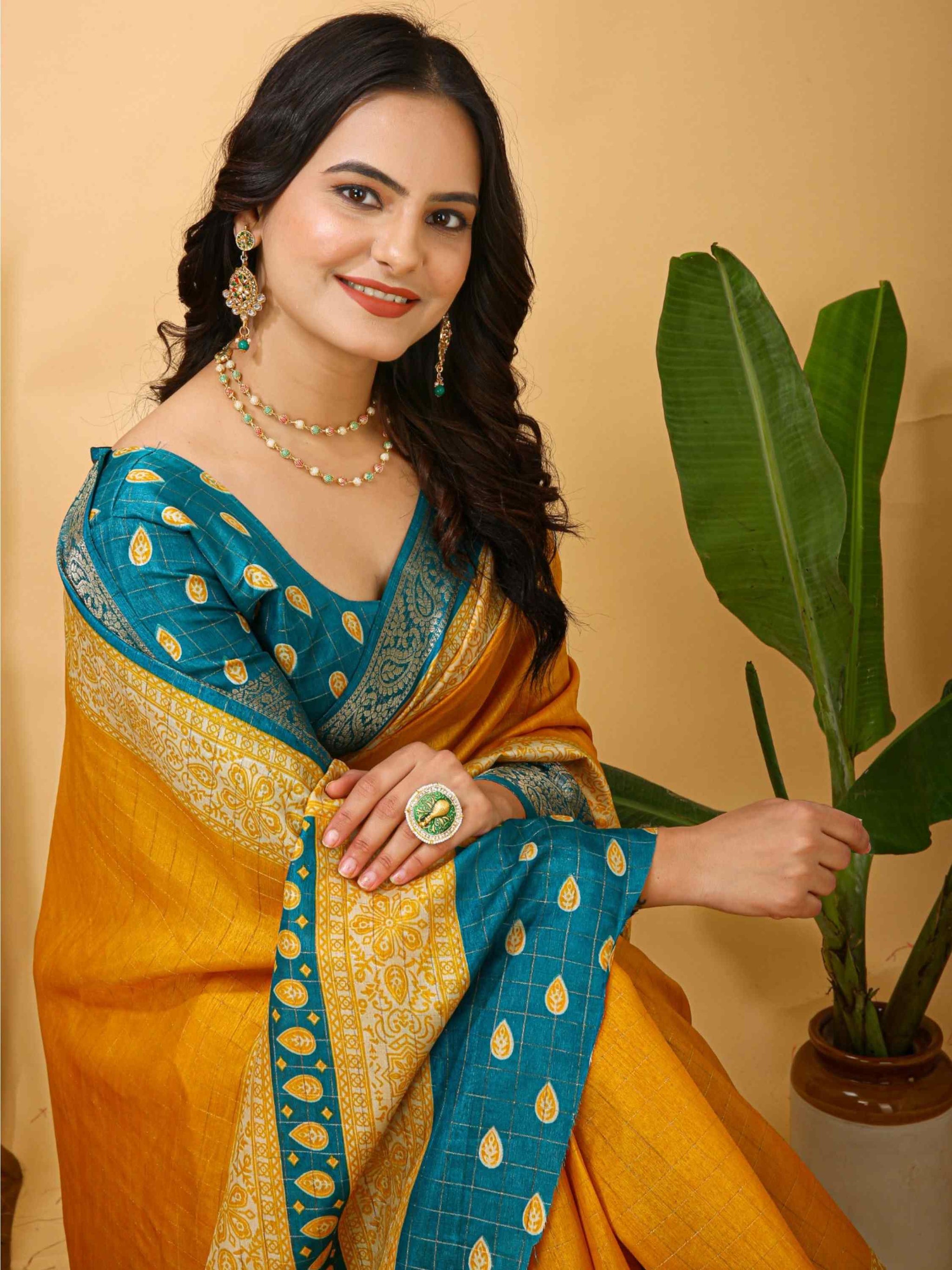 Yellow Dola Silk Cotton Saree with woven zari checks Kalamkari print & zari border. Ideal for festivals, weddings, poojas, office events & family gatherings.