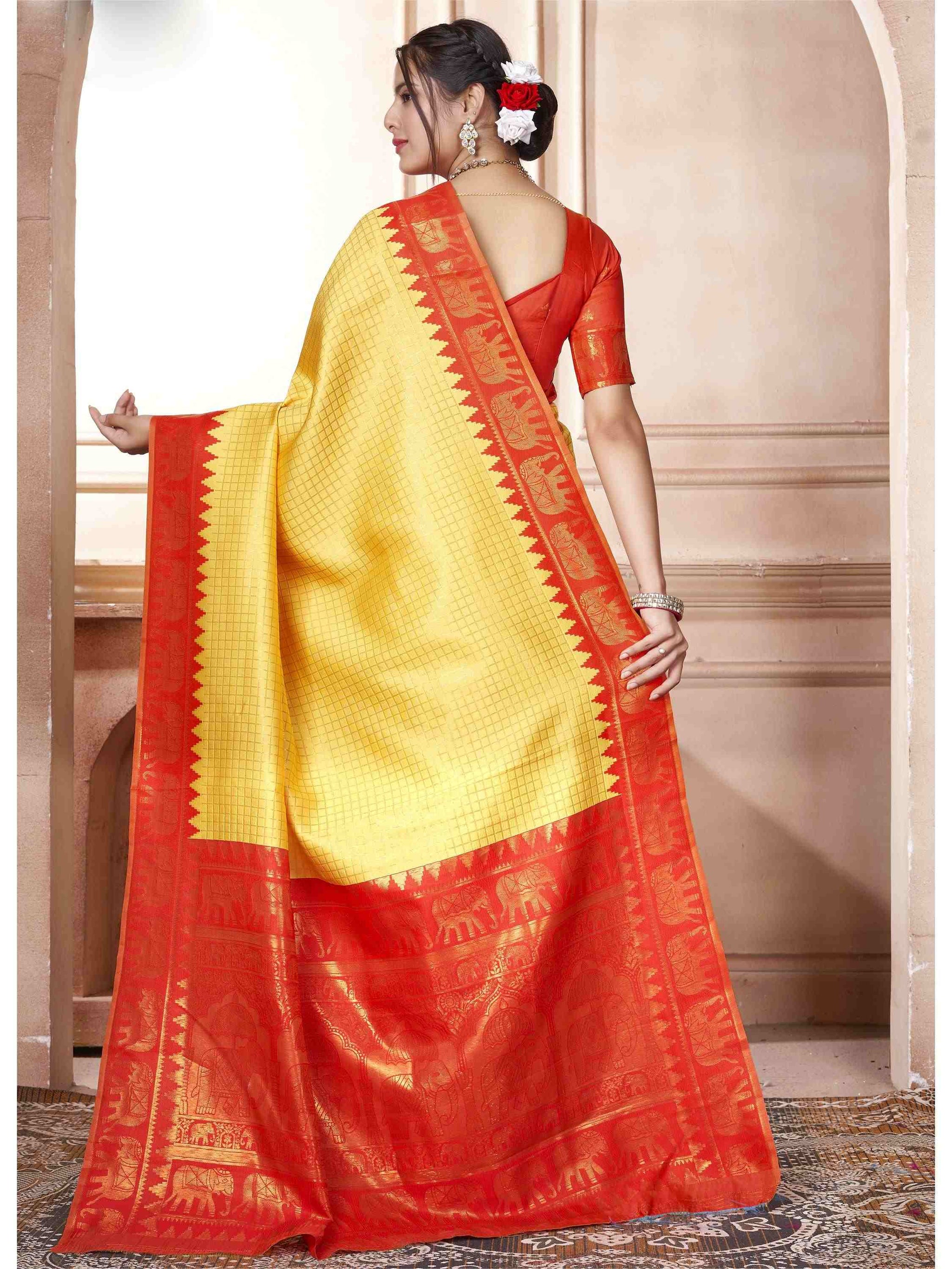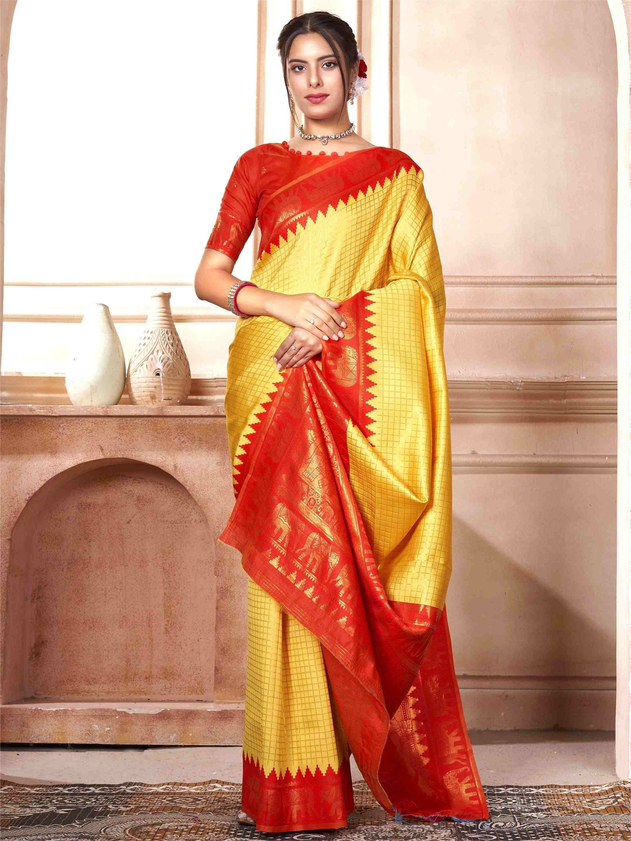 Yellow Kanjivaram Silk Saree with Red Border, featuring traditional ethnic motifs and rich zari weave—perfect for weddings, festivals and party occasions.